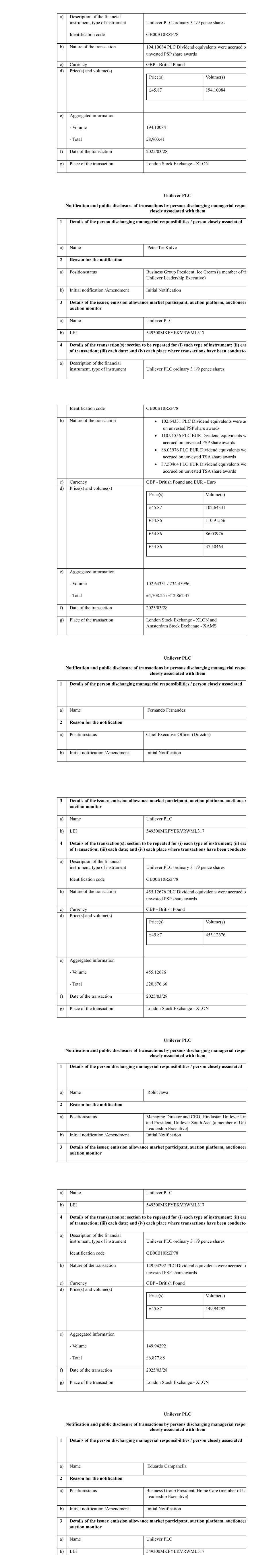 a) Description of the financial instrument, type of instrument Identification code Unilever PLC ordinary 3 1/9 pence shares GB00B10RZP78 b) Nature of the transaction 194.10084 PLC Dividend equivalents were accrued on unvested PSP share awards c) Currency GBP - British Pound d) Price(s) and volume(s) Price(s) Volume(s) £45.87 194.10084 e) Aggregated information - Volume - Total 194.10084 £8,903.41 f) Date of the transaction 2025/03/28 g) Place of the transaction London Stock Exchange - XLON Unilever PLC Notification and public disclosure of transactions by persons discharging managerial respon closely associated with them 1 Details of the person discharging managerial responsibilities / person closely associated a) Name Peter Ter Kulve 2 Reason for the notification a) Position/status Business Group President, Ice Cream (a member of th Unilever Leadership Executive) b) Initial notification /Amendment Initial Notification 3 Details of the issuer, emission allowance market participant, auction platform, auctioneer auction monitor a) Name Unilever PLC b) LEI 549300MKFYEKVRWML317 4 Details of the transaction(s): section to be repeated for (i) each type of instrument; (ii) eac of transaction; (iii) each date; and (iv) each place where transactions have been conducted a) Description of the financial instrument, type of instrument Unilever PLC ordinary 3 1/9 pence shares Identification code GB00B10RZP78 b) Nature of the transaction · 102.64331 PLC Dividend equivalents were ac on unvested PSP share awards · 110.91556 PLC EUR Dividend equivalents w accrued on unvested PSP share awards · 86.03976 PLC EUR Dividend equivalents we accrued on unvested TSA share awards · 37.50464 PLC EUR Dividend equivalents we accrued on unvested TSA share awards c) Currency GBP - British Pound and EUR - Euro d) Price(s) and volume(s) Price(s) Volume(s) £45.87 102.64331 €54.86 110.91556 €54.86 86.03976 €54.86 37.50464 e) Aggregated information - Volume - Total 102.64331 / 234.45996 £4,708.25 / €12,862.47 f) Date of the transaction 2025/03/28 g) Place of the transaction London Stock Exchange - XLON and Amsterdam Stock Exchange - XAMS Unilever PLC Notification and public disclosure of transactions by persons discharging managerial respon closely associated with them 1 Details of the person discharging managerial responsibilities / person closely associated a) Name Fernando Fernandez 2 Reason for the notification a) Position/status Chief Executive Officer (Director) b) Initial notification /Amendment Initial Notification 3 Details of the issuer, emission allowance market participant, auction platform, auctioneer auction monitor a) Name Unilever PLC b) LEI 549300MKFYEKVRWML317 4 Details of the transaction(s): section to be repeated for (i) each type of instrument; (ii) eac of transaction; (iii) each date; and (iv) each place where transactions have been conducted a) Description of the financial instrument, type of instrument Identification code Unilever PLC ordinary 3 1/9 pence shares GB00B10RZP78 b) Nature of the transaction 455.12676 PLC Dividend equivalents were accrued on unvested PSP share awards c) Currency GBP - British Pound d) Price(s) and volume(s) Price(s) Volume(s) £45.87 455.12676 e) Aggregated information - Volume - Total 455.12676 £20,876.66 f) Date of the transaction 2025/03/28 g) Place of the transaction London Stock Exchange - XLON Unilever PLC Notification and public disclosure of transactions by persons discharging managerial respon closely associated with them 1 Details of the person discharging managerial responsibilities / person closely associated a) Name Rohit Jawa 2 Reason for the notification a) Position/status Managing Director and CEO, Hindustan Unilever Lim and President, Unilever South Asia (a member of Unil Leadership Executive) b) Initial notification /Amendment Initial Notification 3 Details of the issuer, emission allowance market participant, auction platform, auctioneer auction monitor a) Name Unilever PLC b) LEI 549300MKFYEKVRWML317 4 Details of the transaction(s): section to be repeated for (i) each type of instrument; (ii) eac of transaction; (iii) each date; and (iv) each place where transactions have been conducted a) Description of the financial instrument, type of instrument Identification code Unilever PLC ordinary 3 1/9 pence shares GB00B10RZP78 b) Nature of the transaction 149.94292 PLC Dividend equivalents were accrued on unvested PSP share awards c) Currency GBP - British Pound d) Price(s) and volume(s) Price(s) Volume(s) £45.87 149.94292 e) Aggregated information - Volume - Total 149.94292 £6,877.88 f) Date of the transaction 2025/03/28 g) Place of the transaction London Stock Exchange - XLON Unilever PLC Notification and public disclosure of transactions by persons discharging managerial respon closely associated with them 1 Details of the person discharging managerial responsibilities / person closely associated a) Name Eduardo Campanella 2 Reason for the notification a) Position/status Business Group President, Home Care (member of Un Leadership Executive) b) Initial notification /Amendment Initial Notification 3 Details of the issuer, emission allowance market participant, auction platform, auctioneer auction monitor a) Name Unilever PLC b) LEI 549300MKFYEKVRWML317