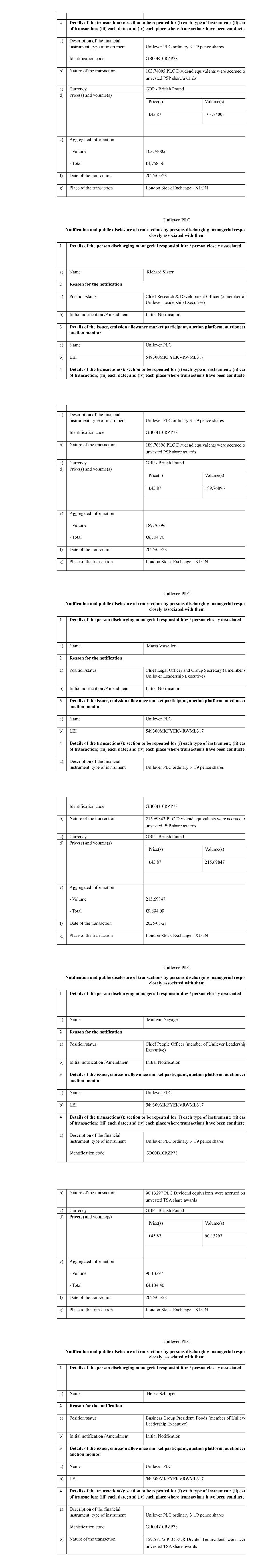 4 Details of the transaction(s): section to be repeated for (i) each type of instrument; (ii) eac of transaction; (iii) each date; and (iv) each place where transactions have been conducted a) Description of the financial instrument, type of instrument Identification code Unilever PLC ordinary 3 1/9 pence shares GB00B10RZP78 b) Nature of the transaction 103.74005 PLC Dividend equivalents were accrued on unvested PSP share awards c) Currency GBP - British Pound d) Price(s) and volume(s) Price(s) Volume(s) £45.87 103.74005 e) Aggregated information - Volume - Total 103.74005 £4,758.56 f) Date of the transaction 2025/03/28 g) Place of the transaction London Stock Exchange - XLON Unilever PLC Notification and public disclosure of transactions by persons discharging managerial respon closely associated with them 1 Details of the person discharging managerial responsibilities / person closely associated a) Name Richard Slater 2 Reason for the notification a) Position/status Chief Research & Development Officer (a member of Unilever Leadership Executive) b) Initial notification /Amendment Initial Notification 3 Details of the issuer, emission allowance market participant, auction platform, auctioneer auction monitor a) Name Unilever PLC b) LEI 549300MKFYEKVRWML317 4 Details of the transaction(s): section to be repeated for (i) each type of instrument; (ii) eac of transaction; (iii) each date; and (iv) each place where transactions have been conducted a) Description of the financial instrument, type of instrument Identification code Unilever PLC ordinary 3 1/9 pence shares GB00B10RZP78 b) Nature of the transaction 189.76896 PLC Dividend equivalents were accrued on unvested PSP share awards c) Currency GBP - British Pound d) Price(s) and volume(s) Price(s) Volume(s) £45.87 189.76896 e) Aggregated information - Volume - Total 189.76896 £8,704.70 f) Date of the transaction 2025/03/28 g) Place of the transaction London Stock Exchange - XLON Unilever PLC Notification and public disclosure of transactions by persons discharging managerial respon closely associated with them 1 Details of the person discharging managerial responsibilities / person closely associated a) Name Maria Varsellona 2 Reason for the notification a) Position/status Chief Legal Officer and Group Secretary (a member o Unilever Leadership Executive) b) Initial notification /Amendment Initial Notification 3 Details of the issuer, emission allowance market participant, auction platform, auctioneer auction monitor a) Name Unilever PLC b) LEI 549300MKFYEKVRWML317 4 Details of the transaction(s): section to be repeated for (i) each type of instrument; (ii) eac of transaction; (iii) each date; and (iv) each place where transactions have been conducted a) Description of the financial instrument, type of instrument Unilever PLC ordinary 3 1/9 pence shares Identification code GB00B10RZP78 b) Nature of the transaction 215.69847 PLC Dividend equivalents were accrued on unvested PSP share awards c) Currency GBP - British Pound d) Price(s) and volume(s) Price(s) Volume(s) £45.87 215.69847 e) Aggregated information - Volume - Total 215.69847 £9,894.09 f) Date of the transaction 2025/03/28 g) Place of the transaction London Stock Exchange - XLON Unilever PLC Notification and public disclosure of transactions by persons discharging managerial respon closely associated with them 1 Details of the person discharging managerial responsibilities / person closely associated a) Name Mairéad Nayager 2 Reason for the notification a) Position/status Chief People Officer (member of Unilever Leadership Executive) b) Initial notification /Amendment Initial Notification 3 Details of the issuer, emission allowance market participant, auction platform, auctioneer auction monitor a) Name Unilever PLC b) LEI 549300MKFYEKVRWML317 4 Details of the transaction(s): section to be repeated for (i) each type of instrument; (ii) eac of transaction; (iii) each date; and (iv) each place where transactions have been conducted a) Description of the financial instrument, type of instrument Identification code Unilever PLC ordinary 3 1/9 pence shares GB00B10RZP78 b) Nature of the transaction 90.13297 PLC Dividend equivalents were accrued on unvested TSA share awards c) Currency GBP - British Pound d) Price(s) and volume(s) Price(s) Volume(s) £45.87 90.13297 e) Aggregated information - Volume - Total 90.13297 £4,134.40 f) Date of the transaction 2025/03/28 g) Place of the transaction London Stock Exchange - XLON Unilever PLC Notification and public disclosure of transactions by persons discharging managerial respon closely associated with them 1 Details of the person discharging managerial responsibilities / person closely associated a) Name Heiko Schipper 2 Reason for the notification a) Position/status Business Group President, Foods (member of Unileve Leadership Executive) b) Initial notification /Amendment Initial Notification 3 Details of the issuer, emission allowance market participant, auction platform, auctioneer auction monitor a) Name Unilever PLC b) LEI 549300MKFYEKVRWML317 4 Details of the transaction(s): section to be repeated for (i) each type of instrument; (ii) eac of transaction; (iii) each date; and (iv) each place where transactions have been conducted a) Description of the financial instrument, type of instrument Identification code Unilever PLC ordinary 3 1/9 pence shares GB00B10RZP78 b) Nature of the transaction 159.57275 PLC EUR Dividend equivalents were accru unvested TSA share awards