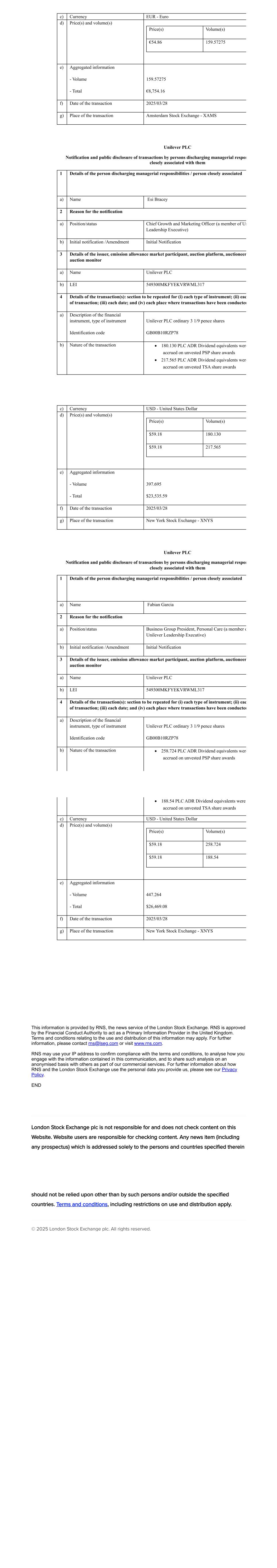 c) Currency EUR - Euro d) Price(s) and volume(s) Price(s) Volume(s) €54.86 159.57275 e) Aggregated information - Volume - Total 159.57275 €8,754.16 f) Date of the transaction 2025/03/28 g) Place of the transaction Amsterdam Stock Exchange - XAMS Unilever PLC Notification and public disclosure of transactions by persons discharging managerial respon closely associated with them 1 Details of the person discharging managerial responsibilities / person closely associated a) Name Esi Bracey 2 Reason for the notification a) Position/status Chief Growth and Marketing Officer (a member of Un Leadership Executive) b) Initial notification /Amendment Initial Notification 3 Details of the issuer, emission allowance market participant, auction platform, auctioneer auction monitor a) Name Unilever PLC b) LEI 549300MKFYEKVRWML317 4 Details of the transaction(s): section to be repeated for (i) each type of instrument; (ii) eac of transaction; (iii) each date; and (iv) each place where transactions have been conducted a) Description of the financial instrument, type of instrument Identification code Unilever PLC ordinary 3 1/9 pence shares GB00B10RZP78 b) Nature of the transaction · 180.130 PLC ADR Dividend equivalents were accrued on unvested PSP share awards · 217.565 PLC ADR Dividend equivalents were accrued on unvested TSA share awards c) Currency USD - United States Dollar d) Price(s) and volume(s) Price(s) Volume(s) $59.18 180.130 $59.18 217.565 e) Aggregated information - Volume - Total 397.695 $23,535.59 f) Date of the transaction 2025/03/28 g) Place of the transaction New York Stock Exchange - XNYS Unilever PLC Notification and public disclosure of transactions by persons discharging managerial respon closely associated with them 1 Details of the person discharging managerial responsibilities / person closely associated a) Name Fabian Garcia 2 Reason for the notification a) Position/status Business Group President, Personal Care (a member o Unilever Leadership Executive) b) Initial notification /Amendment Initial Notification 3 Details of the issuer, emission allowance market participant, auction platform, auctioneer auction monitor a) Name Unilever PLC b) LEI 549300MKFYEKVRWML317 4 Details of the transaction(s): section to be repeated for (i) each type of instrument; (ii) eac of transaction; (iii) each date; and (iv) each place where transactions have been conducted a) Description of the financial instrument, type of instrument Identification code Unilever PLC ordinary 3 1/9 pence shares GB00B10RZP78 b) Nature of the transaction · 258.724 PLC ADR Dividend equivalents were accrued on unvested PSP share awards · 188.54 PLC ADR Dividend equivalents were accrued on unvested TSA share awards c) Currency USD - United States Dollar d) Price(s) and volume(s) Price(s) Volume(s) $59.18 258.724 $59.18 188.54 e) Aggregated information - Volume - Total 447.264 $26,469.08 f) Date of the transaction 2025/03/28 g) Place of the transaction New York Stock Exchange - XNYS This information is provided by RNS, the news service of the London Stock Exchange. RNS is approved by the Financial Conduct Authority to act as a Primary Information Provider in the United Kingdom. Terms and conditions relating to the use and distribution of this information may apply. For further information, please contact rns@lseg.com or visit www.rns.com. RNS may use your IP address to confirm compliance with the terms and conditions, to analyse how you engage with the information contained in this communication, and to share such analysis on an anonymised basis with others as part of our commercial services. For further information about how RNS and the London Stock Exchange use the personal data you provide us, please see our Privacy Policy. END London Stock Exchange plc is not responsible for and does not check content on this Website. Website users are responsible for checking content. Any news item (including any prospectus) which is addressed solely to the persons and countries specified therein should not be relied upon other than by such persons and/or outside the specified countries. Terms and conditions, including restrictions on use and distribution apply. © 2025 London Stock Exchange plc. All rights reserved.