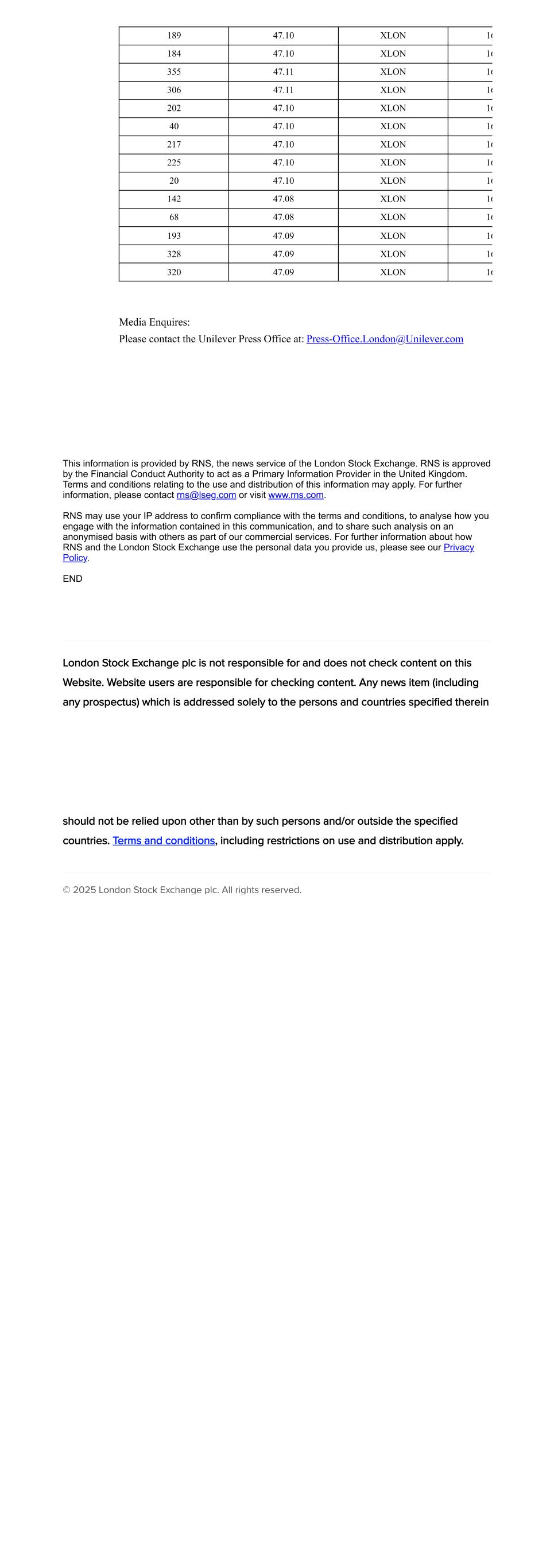 189 47.10 XLON 16 184 47.10 XLON 16 355 47.11 XLON 16 306 47.11 XLON 16 202 47.10 XLON 16 40 47.10 XLON 16 217 47.10 XLON 16 225 47.10 XLON 16 20 47.10 XLON 16 142 47.08 XLON 16 68 47.08 XLON 16 193 47.09 XLON 16 328 47.09 XLON 16 320 47.09 XLON 16 Media Enquires: Please contact the Unilever Press Office at: Press-Office.London@Unilever.com This information is provided by RNS, the news service of the London Stock Exchange. RNS is approved by the Financial Conduct Authority to act as a Primary Information Provider in the United Kingdom. Terms and conditions relating to the use and distribution of this information may apply. For further information, please contact rns@lseg.com or visit www.rns.com. RNS may use your IP address to confirm compliance with the terms and conditions, to analyse how you engage with the information contained in this communication, and to share such analysis on an anonymised basis with others as part of our commercial services. For further information about how RNS and the London Stock Exchange use the personal data you provide us, please see our Privacy Policy. END London Stock Exchange plc is not responsible for and does not check content on this Website. Website users are responsible for checking content. Any news item (including any prospectus) which is addressed solely to the persons and countries specified therein should not be relied upon other than by such persons and/or outside the specified countries. Terms and conditions, including restrictions on use and distribution apply. © 2025 London Stock Exchange plc. All rights reserved.