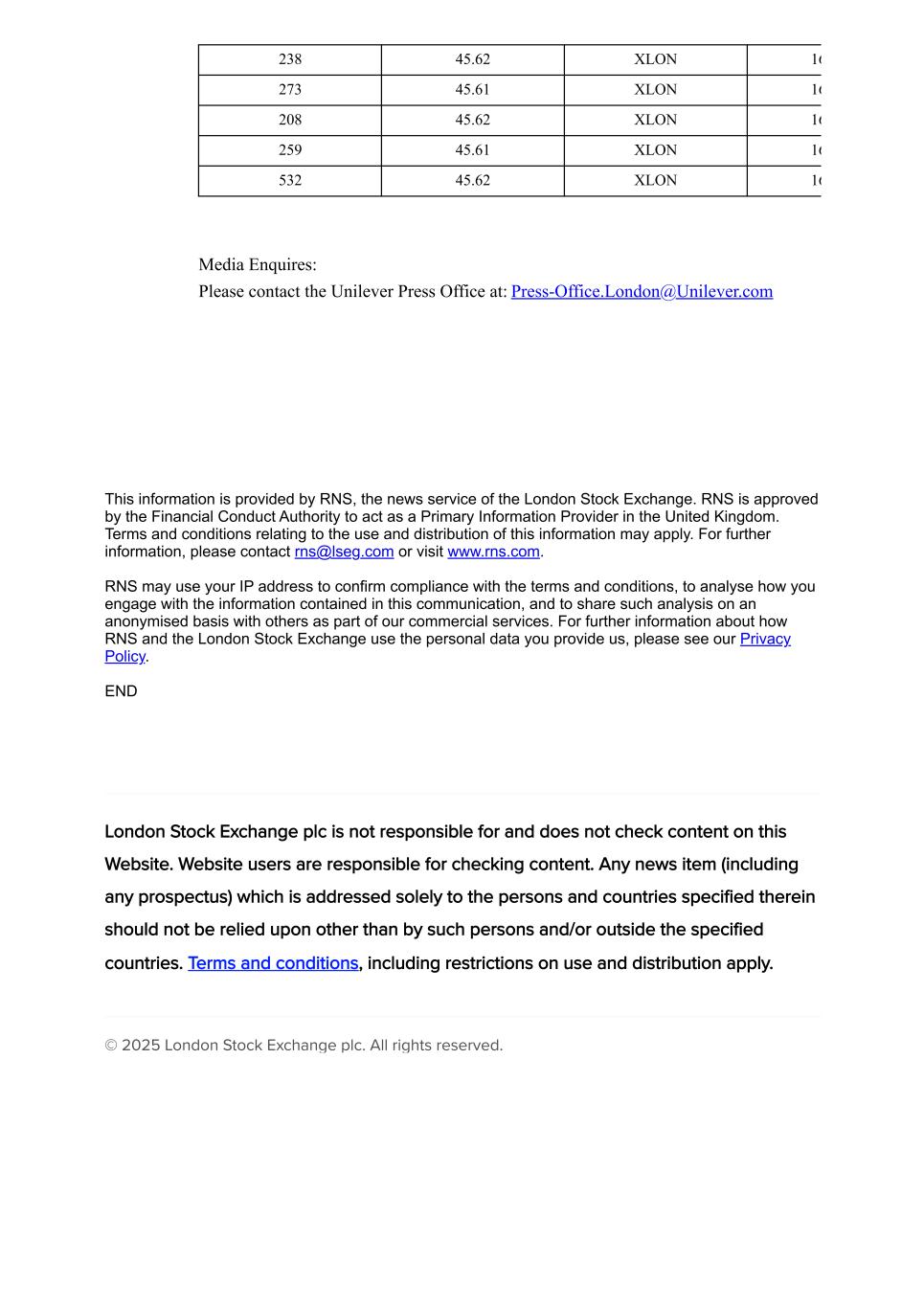 238 45.62 XLON 16 273 45.61 XLON 16 208 45.62 XLON 16 259 45.61 XLON 16 532 45.62 XLON 16     Media Enquires: Please contact the Unilever Press Office at: Press-Office.London@Unilever.com     This information is provided by RNS, the news service of the London Stock Exchange. RNS is approved by the Financial Conduct Authority to act as a Primary Information Provider in the United Kingdom. Terms and conditions relating to the use and distribution of this information may apply. For further information, please contact rns@lseg.com or visit www.rns.com. RNS may use your IP address to confirm compliance with the terms and conditions, to analyse how you engage with the information contained in this communication, and to share such analysis on an anonymised basis with others as part of our commercial services. For further information about how RNS and the London Stock Exchange use the personal data you provide us, please see our Privacy Policy. END London Stock Exchange plc is not responsible for and does not check content on this Website. Website users are responsible for checking content. Any news item (including any prospectus) which is addressed solely to the persons and countries specified therein should not be relied upon other than by such persons and/or outside the specified countries. Terms and conditions, including restrictions on use and distribution apply. © 2025 London Stock Exchange plc. All rights reserved.