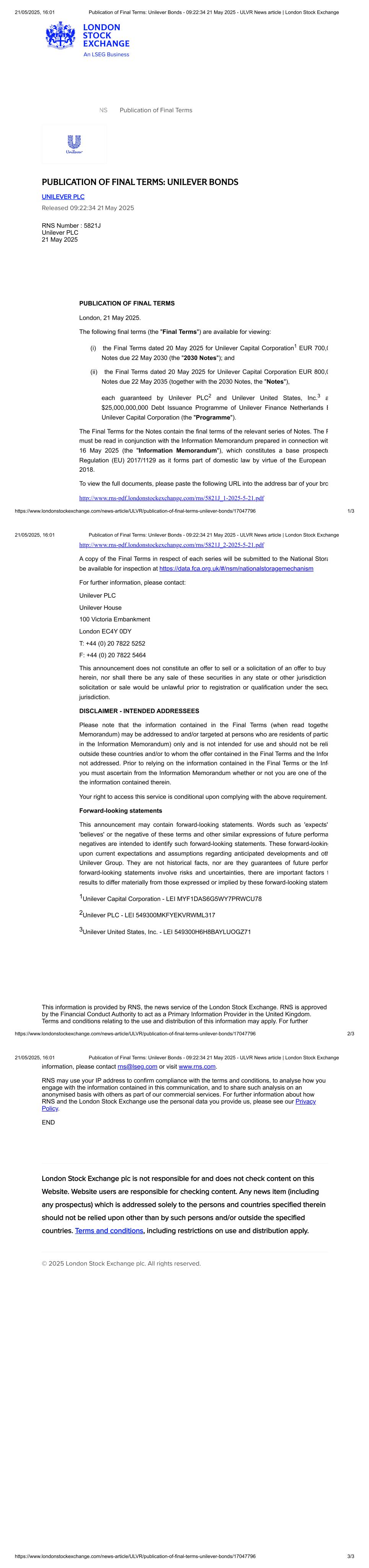 RNS Publication of Final Terms PUBLICATION OF FINAL TERMS: UNILEVER BONDS UNILEVER PLC Released 09:22:34 21 May 2025 RNS Number : 5821J Unilever PLC 21 May 2025 PUBLICATION OF FINAL TERMS London, 21 May 2025. The following final terms (the "Final Terms") are available for viewing: (i) the Final Terms dated 20 May 2025 for Unilever Capital Corporation1 EUR 700,0 Notes due 22 May 2030 (the "2030 Notes"); and (ii) the Final Terms dated 20 May 2025 for Unilever Capital Corporation EUR 800,0 Notes due 22 May 2035 (together with the 2030 Notes, the "Notes"), each guaranteed by Unilever PLC2 and Unilever United States, Inc.3 a $25,000,000,000 Debt Issuance Programme of Unilever Finance Netherlands B Unilever Capital Corporation (the "Programme"). The Final Terms for the Notes contain the final terms of the relevant series of Notes. The F must be read in conjunction with the Information Memorandum prepared in connection wit 16 May 2025 (the "Information Memorandum"), which constitutes a base prospectu Regulation (EU) 2017/1129 as it forms part of domestic law by virtue of the European 2018. To view the full documents, please paste the following URL into the address bar of your bro http://www.rns-pdf.londonstockexchange.com/rns/5821J_1-2025-5-21.pdf 21/05/2025, 16:01 Publication of Final Terms: Unilever Bonds - 09:22:34 21 May 2025 - ULVR News article | London Stock Exchange https://www.londonstockexchange.com/news-article/ULVR/publication-of-final-terms-unilever-bonds/17047796 1/3 http://www.rns-pdf.londonstockexchange.com/rns/5821J_2-2025-5-21.pdf A copy of the Final Terms in respect of each series will be submitted to the National Stora be available for inspection at https://data.fca.org.uk/#/nsm/nationalstoragemechanism For further information, please contact: Unilever PLC Unilever House 100 Victoria Embankment London EC4Y 0DY T: +44 (0) 20 7822 5252 F: +44 (0) 20 7822 5464 This announcement does not constitute an offer to sell or a solicitation of an offer to buy t herein, nor shall there be any sale of these securities in any state or other jurisdiction solicitation or sale would be unlawful prior to registration or qualification under the secu jurisdiction. DISCLAIMER - INTENDED ADDRESSEES Please note that the information contained in the Final Terms (when read togethe Memorandum) may be addressed to and/or targeted at persons who are residents of partic in the Information Memorandum) only and is not intended for use and should not be reli outside these countries and/or to whom the offer contained in the Final Terms and the Infor not addressed. Prior to relying on the information contained in the Final Terms or the Info you must ascertain from the Information Memorandum whether or not you are one of the the information contained therein. Your right to access this service is conditional upon complying with the above requirement. Forward-looking statements This announcement may contain forward-looking statements. Words such as 'expects' 'believes' or the negative of these terms and other similar expressions of future performa negatives are intended to identify such forward-looking statements. These forward-looking upon current expectations and assumptions regarding anticipated developments and oth Unilever Group. They are not historical facts, nor are they guarantees of future perfor forward-looking statements involve risks and uncertainties, there are important factors t results to differ materially from those expressed or implied by these forward-looking stateme 1Unilever Capital Corporation - LEI MYF1DAS6G5WY7PRWCU78 2Unilever PLC - LEI 549300MKFYEKVRWML317 3Unilever United States, Inc. - LEI 549300H6H8BAYLUOGZ71 This information is provided by RNS, the news service of the London Stock Exchange. RNS is approved by the Financial Conduct Authority to act as a Primary Information Provider in the United Kingdom. Terms and conditions relating to the use and distribution of this information may apply. For further 21/05/2025, 16:01 Publication of Final Terms: Unilever Bonds - 09:22:34 21 May 2025 - ULVR News article | London Stock Exchange https://www.londonstockexchange.com/news-article/ULVR/publication-of-final-terms-unilever-bonds/17047796 2/3 information, please contact rns@lseg.com or visit www.rns.com. RNS may use your IP address to confirm compliance with the terms and conditions, to analyse how you engage with the information contained in this communication, and to share such analysis on an anonymised basis with others as part of our commercial services. For further information about how RNS and the London Stock Exchange use the personal data you provide us, please see our Privacy Policy. END London Stock Exchange plc is not responsible for and does not check content on this Website. Website users are responsible for checking content. Any news item (including any prospectus) which is addressed solely to the persons and countries specified therein should not be relied upon other than by such persons and/or outside the specified countries. Terms and conditions, including restrictions on use and distribution apply. © 2025 London Stock Exchange plc. All rights reserved. 21/05/2025, 16:01 Publication of Final Terms: Unilever Bonds - 09:22:34 21 May 2025 - ULVR News article | London Stock Exchange https://www.londonstockexchange.com/news-article/ULVR/publication-of-final-terms-unilever-bonds/17047796 3/3