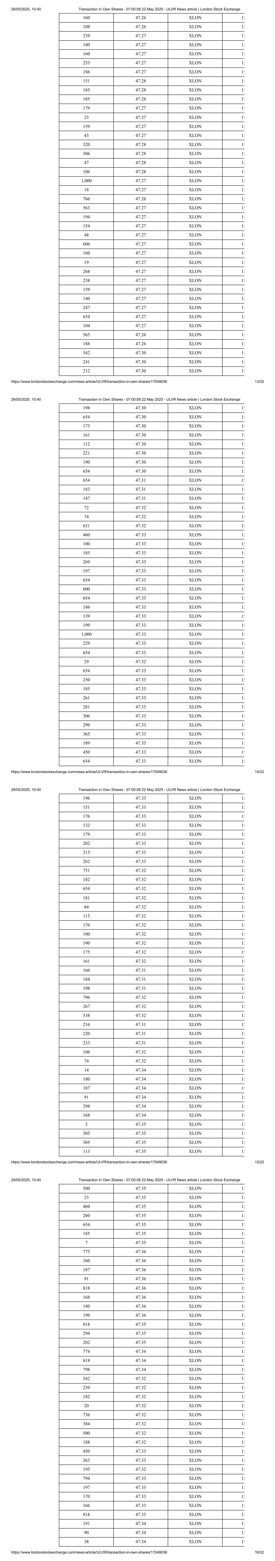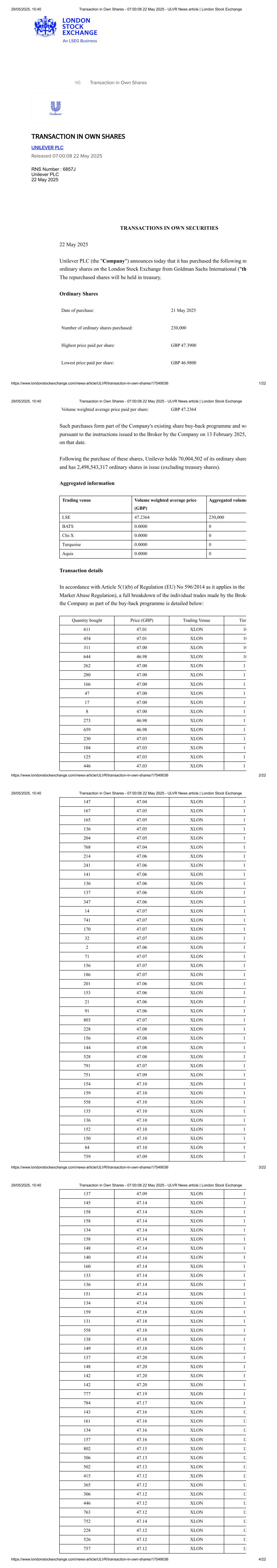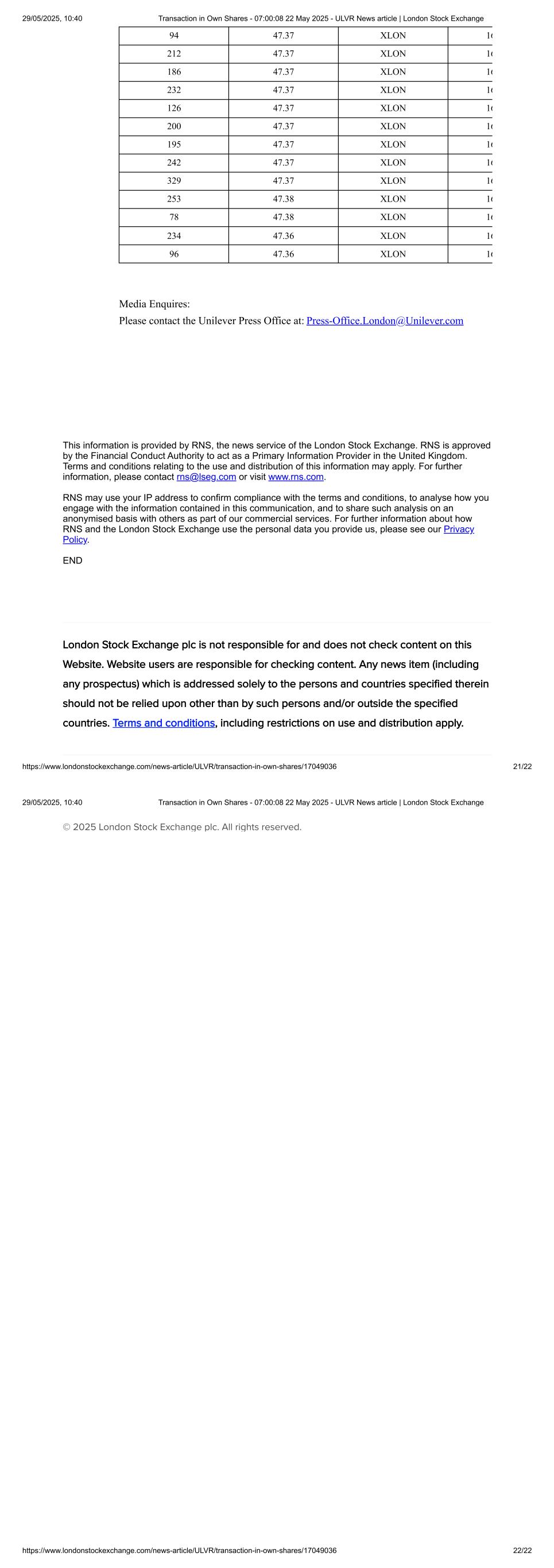 94 47.37 XLON 16 212 47.37 XLON 16 186 47.37 XLON 16 232 47.37 XLON 16 126 47.37 XLON 16 200 47.37 XLON 16 195 47.37 XLON 16 242 47.37 XLON 16 329 47.37 XLON 16 253 47.38 XLON 16 78 47.38 XLON 16 234 47.36 XLON 16 96 47.36 XLON 16 Media Enquires: Please contact the Unilever Press Office at: Press-Office.London@Unilever.com This information is provided by RNS, the news service of the London Stock Exchange. RNS is approved by the Financial Conduct Authority to act as a Primary Information Provider in the United Kingdom. Terms and conditions relating to the use and distribution of this information may apply. For further information, please contact rns@lseg.com or visit www.rns.com. RNS may use your IP address to confirm compliance with the terms and conditions, to analyse how you engage with the information contained in this communication, and to share such analysis on an anonymised basis with others as part of our commercial services. For further information about how RNS and the London Stock Exchange use the personal data you provide us, please see our Privacy Policy. END London Stock Exchange plc is not responsible for and does not check content on this Website. Website users are responsible for checking content. Any news item (including any prospectus) which is addressed solely to the persons and countries specified therein should not be relied upon other than by such persons and/or outside the specified countries. Terms and conditions, including restrictions on use and distribution apply. 29/05/2025, 10:40 Transaction in Own Shares - 07:00:08 22 May 2025 - ULVR News article | London Stock Exchange https://www.londonstockexchange.com/news-article/ULVR/transaction-in-own-shares/17049036 21/22 © 2025 London Stock Exchange plc. All rights reserved. 29/05/2025, 10:40 Transaction in Own Shares - 07:00:08 22 May 2025 - ULVR News article | London Stock Exchange https://www.londonstockexchange.com/news-article/ULVR/transaction-in-own-shares/17049036 22/22