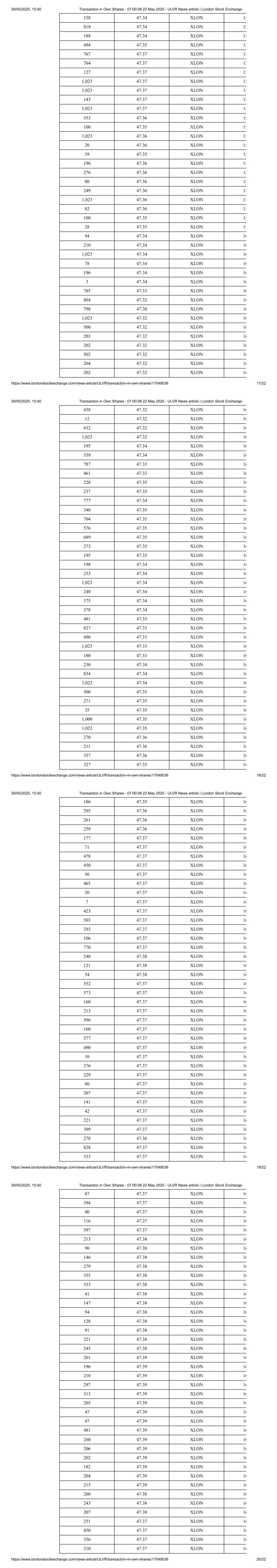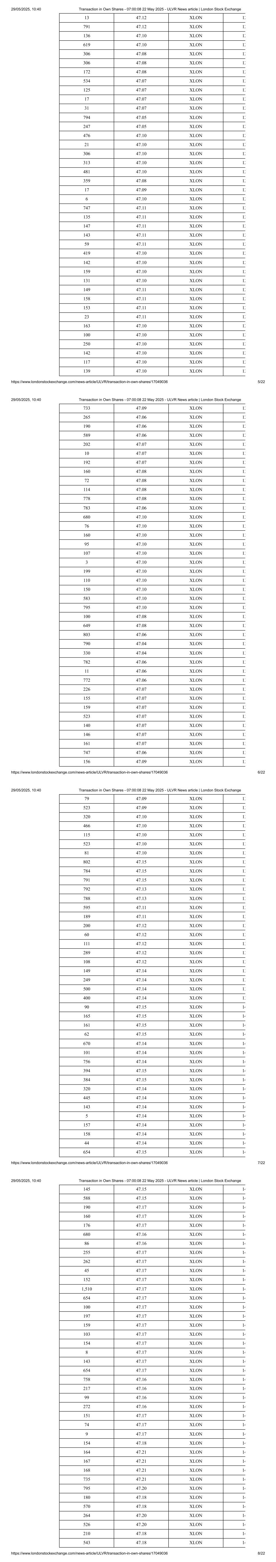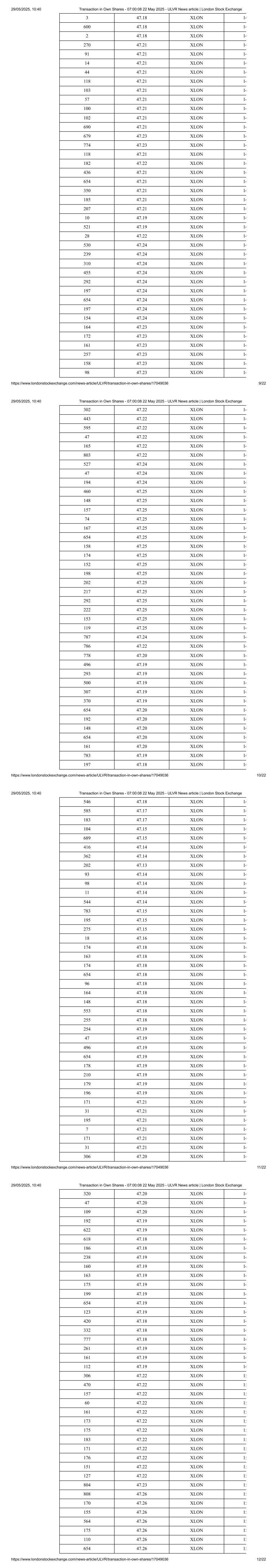 94 47.37 XLON 16 212 47.37 XLON 16 186 47.37 XLON 16 232 47.37 XLON 16 126 47.37 XLON 16 200 47.37 XLON 16 195 47.37 XLON 16 242 47.37 XLON 16 329 47.37 XLON 16 253 47.38 XLON 16 78 47.38 XLON 16 234 47.36 XLON 16 96 47.36 XLON 16 Media Enquires: Please contact the Unilever Press Office at: Press-Office.London@Unilever.com This information is provided by RNS, the news service of the London Stock Exchange. RNS is approved by the Financial Conduct Authority to act as a Primary Information Provider in the United Kingdom. Terms and conditions relating to the use and distribution of this information may apply. For further information, please contact rns@lseg.com or visit www.rns.com. RNS may use your IP address to confirm compliance with the terms and conditions, to analyse how you engage with the information contained in this communication, and to share such analysis on an anonymised basis with others as part of our commercial services. For further information about how RNS and the London Stock Exchange use the personal data you provide us, please see our Privacy Policy. END London Stock Exchange plc is not responsible for and does not check content on this Website. Website users are responsible for checking content. Any news item (including any prospectus) which is addressed solely to the persons and countries specified therein should not be relied upon other than by such persons and/or outside the specified countries. Terms and conditions, including restrictions on use and distribution apply. 29/05/2025, 10:40 Transaction in Own Shares - 07:00:08 22 May 2025 - ULVR News article | London Stock Exchange https://www.londonstockexchange.com/news-article/ULVR/transaction-in-own-shares/17049036 21/22 © 2025 London Stock Exchange plc. All rights reserved. 29/05/2025, 10:40 Transaction in Own Shares - 07:00:08 22 May 2025 - ULVR News article | London Stock Exchange https://www.londonstockexchange.com/news-article/ULVR/transaction-in-own-shares/17049036 22/22