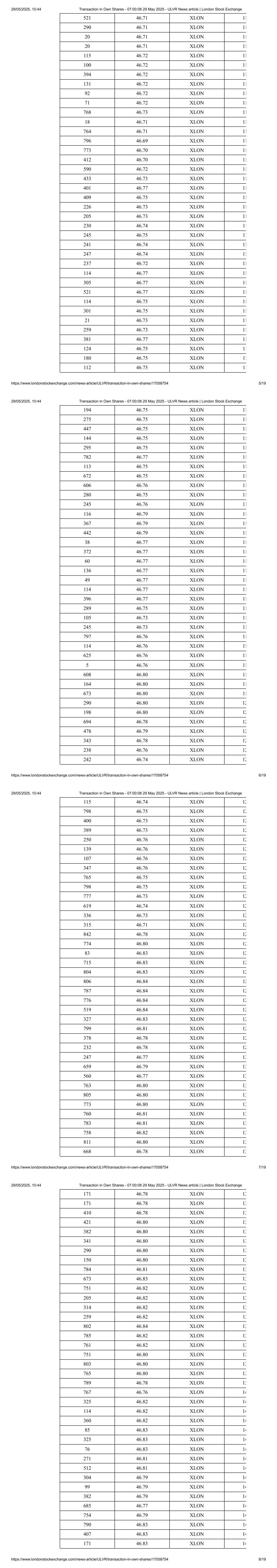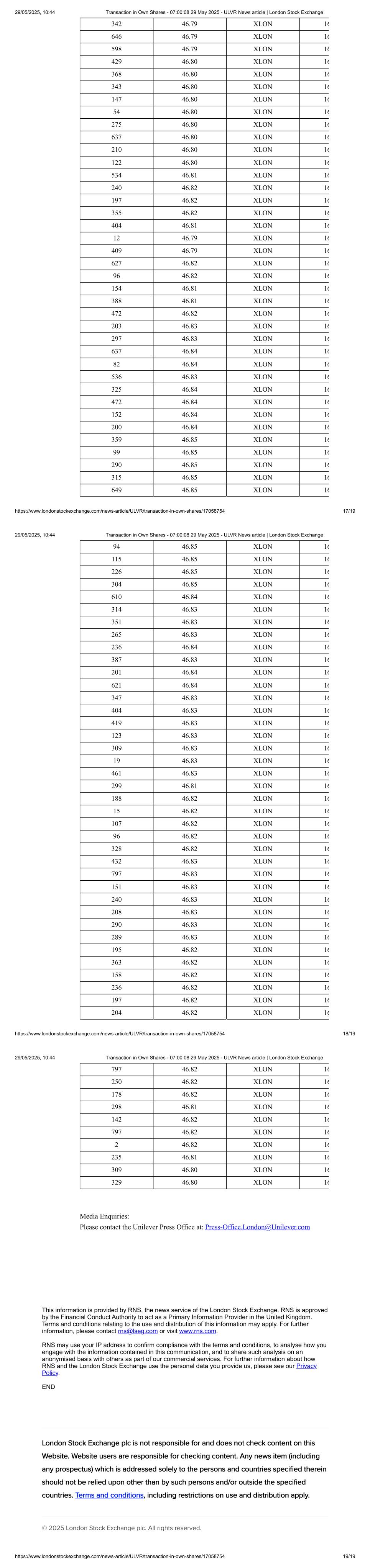 342 46.79 XLON 16 646 46.79 XLON 16 598 46.79 XLON 16 429 46.80 XLON 16 368 46.80 XLON 16 343 46.80 XLON 16 147 46.80 XLON 16 54 46.80 XLON 16 275 46.80 XLON 16 637 46.80 XLON 16 210 46.80 XLON 16 122 46.80 XLON 16 534 46.81 XLON 16 240 46.82 XLON 16 197 46.82 XLON 16 355 46.82 XLON 16 404 46.81 XLON 16 12 46.79 XLON 16 409 46.79 XLON 16 627 46.82 XLON 16 96 46.82 XLON 16 154 46.81 XLON 16 388 46.81 XLON 16 472 46.82 XLON 16 203 46.83 XLON 16 297 46.83 XLON 16 637 46.84 XLON 16 82 46.84 XLON 16 536 46.83 XLON 16 325 46.84 XLON 16 472 46.84 XLON 16 152 46.84 XLON 16 200 46.84 XLON 16 359 46.85 XLON 16 99 46.85 XLON 16 290 46.85 XLON 16 315 46.85 XLON 16 649 46.85 XLON 16 29/05/2025, 10:44 Transaction in Own Shares - 07:00:08 29 May 2025 - ULVR News article | London Stock Exchange https://www.londonstockexchange.com/news-article/ULVR/transaction-in-own-shares/17058754 17/19 94 46.85 XLON 16 115 46.85 XLON 16 226 46.85 XLON 16 304 46.85 XLON 16 610 46.84 XLON 16 314 46.83 XLON 16 351 46.83 XLON 16 265 46.83 XLON 16 236 46.84 XLON 16 387 46.83 XLON 16 201 46.84 XLON 16 621 46.84 XLON 16 347 46.83 XLON 16 404 46.83 XLON 16 419 46.83 XLON 16 123 46.83 XLON 16 309 46.83 XLON 16 19 46.83 XLON 16 461 46.83 XLON 16 299 46.81 XLON 16 188 46.82 XLON 16 15 46.82 XLON 16 107 46.82 XLON 16 96 46.82 XLON 16 328 46.82 XLON 16 432 46.83 XLON 16 797 46.83 XLON 16 151 46.83 XLON 16 240 46.83 XLON 16 208 46.83 XLON 16 290 46.83 XLON 16 289 46.83 XLON 16 195 46.82 XLON 16 363 46.82 XLON 16 158 46.82 XLON 16 236 46.82 XLON 16 197 46.82 XLON 16 204 46.82 XLON 16 29/05/2025, 10:44 Transaction in Own Shares - 07:00:08 29 May 2025 - ULVR News article | London Stock Exchange https://www.londonstockexchange.com/news-article/ULVR/transaction-in-own-shares/17058754 18/19 797 46.82 XLON 16 250 46.82 XLON 16 178 46.82 XLON 16 298 46.81 XLON 16 142 46.82 XLON 16 797 46.82 XLON 16 2 46.82 XLON 16 235 46.81 XLON 16 309 46.80 XLON 16 329 46.80 XLON 16 Media Enquiries: Please contact the Unilever Press Office at: Press-Office.London@Unilever.com This information is provided by RNS, the news service of the London Stock Exchange. RNS is approved by the Financial Conduct Authority to act as a Primary Information Provider in the United Kingdom. Terms and conditions relating to the use and distribution of this information may apply. For further information, please contact rns@lseg.com or visit www.rns.com. RNS may use your IP address to confirm compliance with the terms and conditions, to analyse how you engage with the information contained in this communication, and to share such analysis on an anonymised basis with others as part of our commercial services. For further information about how RNS and the London Stock Exchange use the personal data you provide us, please see our Privacy Policy. END London Stock Exchange plc is not responsible for and does not check content on this Website. Website users are responsible for checking content. Any news item (including any prospectus) which is addressed solely to the persons and countries specified therein should not be relied upon other than by such persons and/or outside the specified countries. Terms and conditions, including restrictions on use and distribution apply. © 2025 London Stock Exchange plc. All rights reserved. 29/05/2025, 10:44 Transaction in Own Shares - 07:00:08 29 May 2025 - ULVR News article | London Stock Exchange https://www.londonstockexchange.com/news-article/ULVR/transaction-in-own-shares/17058754 19/19