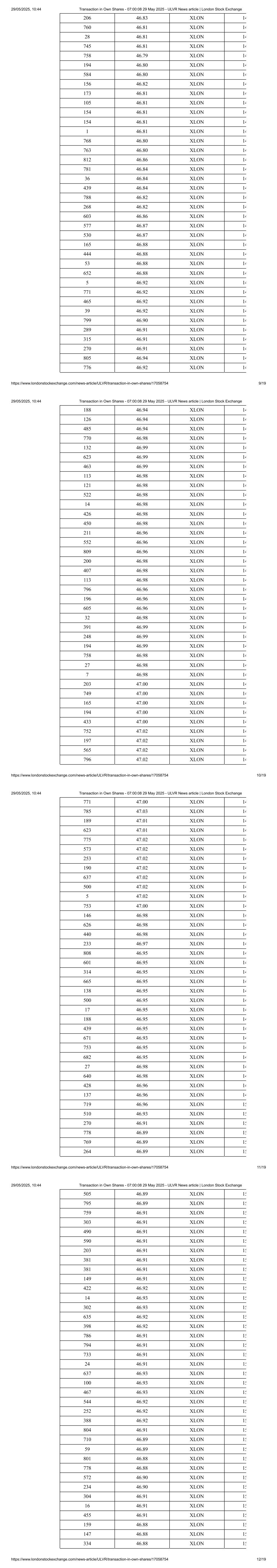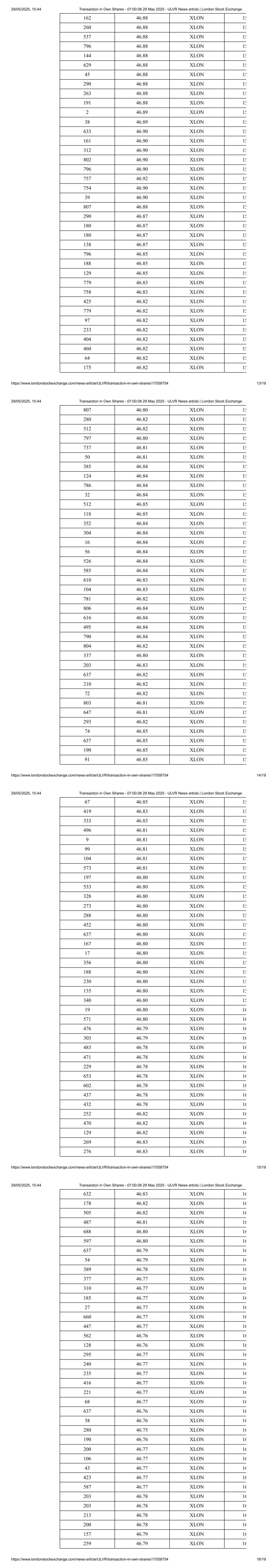 206 46.83 XLON 14 760 46.81 XLON 14 28 46.81 XLON 14 745 46.81 XLON 14 758 46.79 XLON 14 194 46.80 XLON 14 584 46.80 XLON 14 156 46.82 XLON 14 173 46.81 XLON 14 105 46.81 XLON 14 154 46.81 XLON 14 154 46.81 XLON 14 1 46.81 XLON 14 768 46.80 XLON 14 763 46.80 XLON 14 812 46.86 XLON 14 781 46.84 XLON 14 36 46.84 XLON 14 439 46.84 XLON 14 788 46.82 XLON 14 268 46.82 XLON 14 603 46.86 XLON 14 577 46.87 XLON 14 530 46.87 XLON 14 165 46.88 XLON 14 444 46.88 XLON 14 53 46.88 XLON 14 652 46.88 XLON 14 5 46.92 XLON 14 771 46.92 XLON 14 465 46.92 XLON 14 39 46.92 XLON 14 799 46.90 XLON 14 289 46.91 XLON 14 315 46.91 XLON 14 270 46.91 XLON 14 805 46.94 XLON 14 776 46.92 XLON 14 29/05/2025, 10:44 Transaction in Own Shares - 07:00:08 29 May 2025 - ULVR News article | London Stock Exchange https://www.londonstockexchange.com/news-article/ULVR/transaction-in-own-shares/17058754 9/19 188 46.94 XLON 14 126 46.94 XLON 14 485 46.94 XLON 14 770 46.98 XLON 14 132 46.99 XLON 14 623 46.99 XLON 14 463 46.99 XLON 14 113 46.98 XLON 14 121 46.98 XLON 14 522 46.98 XLON 14 14 46.98 XLON 14 426 46.98 XLON 14 450 46.98 XLON 14 211 46.96 XLON 14 552 46.96 XLON 14 809 46.96 XLON 14 200 46.98 XLON 14 407 46.98 XLON 14 113 46.98 XLON 14 796 46.96 XLON 14 196 46.96 XLON 14 605 46.96 XLON 14 32 46.98 XLON 14 391 46.99 XLON 14 248 46.99 XLON 14 194 46.99 XLON 14 758 46.98 XLON 14 27 46.98 XLON 14 7 46.98 XLON 14 203 47.00 XLON 14 749 47.00 XLON 14 165 47.00 XLON 14 194 47.00 XLON 14 433 47.00 XLON 14 752 47.02 XLON 14 197 47.02 XLON 14 565 47.02 XLON 14 796 47.02 XLON 14 29/05/2025, 10:44 Transaction in Own Shares - 07:00:08 29 May 2025 - ULVR News article | London Stock Exchange https://www.londonstockexchange.com/news-article/ULVR/transaction-in-own-shares/17058754 10/19 771 47.00 XLON 14 785 47.03 XLON 14 189 47.01 XLON 14 623 47.01 XLON 14 775 47.02 XLON 14 573 47.02 XLON 14 253 47.02 XLON 14 190 47.02 XLON 14 637 47.02 XLON 14 500 47.02 XLON 14 5 47.02 XLON 14 753 47.00 XLON 14 146 46.98 XLON 14 626 46.98 XLON 14 440 46.98 XLON 14 233 46.97 XLON 14 808 46.95 XLON 14 601 46.95 XLON 14 314 46.95 XLON 14 665 46.95 XLON 14 138 46.95 XLON 14 500 46.95 XLON 14 17 46.95 XLON 14 188 46.95 XLON 14 439 46.95 XLON 14 671 46.93 XLON 14 753 46.95 XLON 14 682 46.95 XLON 14 27 46.98 XLON 14 640 46.98 XLON 14 428 46.96 XLON 14 137 46.96 XLON 14 719 46.96 XLON 15 510 46.93 XLON 15 270 46.91 XLON 15 778 46.89 XLON 15 769 46.89 XLON 15 264 46.89 XLON 15 29/05/2025, 10:44 Transaction in Own Shares - 07:00:08 29 May 2025 - ULVR News article | London Stock Exchange https://www.londonstockexchange.com/news-article/ULVR/transaction-in-own-shares/17058754 11/19 505 46.89 XLON 15 795 46.89 XLON 15 759 46.91 XLON 15 303 46.91 XLON 15 490 46.91 XLON 15 590 46.91 XLON 15 203 46.91 XLON 15 381 46.91 XLON 15 381 46.91 XLON 15 149 46.91 XLON 15 422 46.92 XLON 15 14 46.93 XLON 15 302 46.93 XLON 15 635 46.92 XLON 15 398 46.92 XLON 15 786 46.91 XLON 15 794 46.91 XLON 15 733 46.91 XLON 15 24 46.91 XLON 15 637 46.93 XLON 15 100 46.93 XLON 15 467 46.93 XLON 15 544 46.92 XLON 15 252 46.92 XLON 15 388 46.92 XLON 15 804 46.91 XLON 15 710 46.89 XLON 15 59 46.89 XLON 15 801 46.88 XLON 15 778 46.88 XLON 15 572 46.90 XLON 15 234 46.90 XLON 15 304 46.91 XLON 15 16 46.91 XLON 15 455 46.91 XLON 15 159 46.88 XLON 15 147 46.88 XLON 15 334 46.88 XLON 15 29/05/2025, 10:44 Transaction in Own Shares - 07:00:08 29 May 2025 - ULVR News article | London Stock Exchange https://www.londonstockexchange.com/news-article/ULVR/transaction-in-own-shares/17058754 12/19