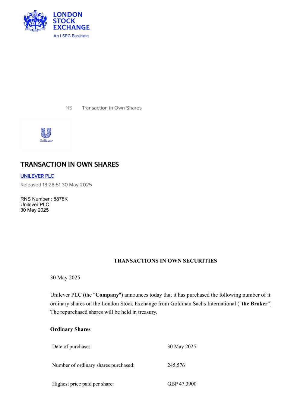 RNS Transaction in Own Shares TRANSACTION IN OWN SHARES UNILEVER PLC Released 18:28:51 30 May 2025 RNS Number : 8878K Unilever PLC 30 May 2025 TRANSACTIONS IN OWN SECURITIES 30 May 2025 Unilever PLC (the "Company") announces today that it has purchased the following number of its ordinary shares on the London Stock Exchange from Goldman Sachs International ("the Broker") The repurchased shares will be held in treasury. Ordinary Shares Date of purchase: 30 May 2025 Number of ordinary shares purchased: 245,576 Highest price paid per share: GBP 47.3900