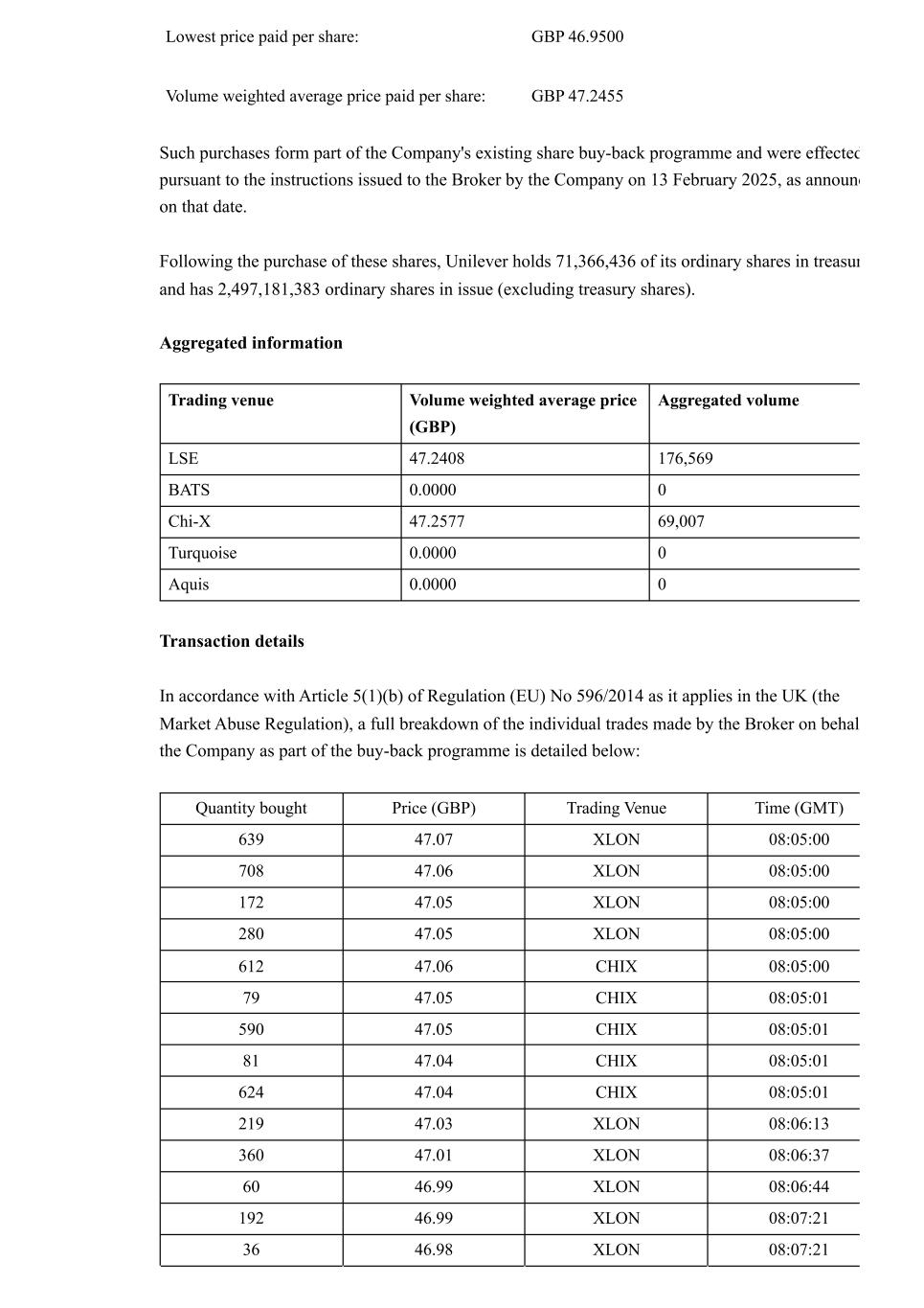 Lowest price paid per share: GBP 46.9500 Volume weighted average price paid per share: GBP 47.2455 Such purchases form part of the Company's existing share buy-back programme and were effected pursuant to the instructions issued to the Broker by the Company on 13 February 2025, as announc on that date. Following the purchase of these shares, Unilever holds 71,366,436 of its ordinary shares in treasur and has 2,497,181,383 ordinary shares in issue (excluding treasury shares). Aggregated information Trading venue Volume weighted average price (GBP) Aggregated volume LSE 47.2408 176,569 BATS 0.0000 0 Chi-X 47.2577 69,007 Turquoise 0.0000 0 Aquis 0.0000 0 Transaction details In accordance with Article 5(1)(b) of Regulation (EU) No 596/2014 as it applies in the UK (the Market Abuse Regulation), a full breakdown of the individual trades made by the Broker on behal the Company as part of the buy-back programme is detailed below: Quantity bought Price (GBP) Trading Venue Time (GMT) 639 47.07 XLON 08:05:00 708 47.06 XLON 08:05:00 172 47.05 XLON 08:05:00 280 47.05 XLON 08:05:00 612 47.06 CHIX 08:05:00 79 47.05 CHIX 08:05:01 590 47.05 CHIX 08:05:01 81 47.04 CHIX 08:05:01 624 47.04 CHIX 08:05:01 219 47.03 XLON 08:06:13 360 47.01 XLON 08:06:37 60 46.99 XLON 08:06:44 192 46.99 XLON 08:07:21 36 46.98 XLON 08:07:21