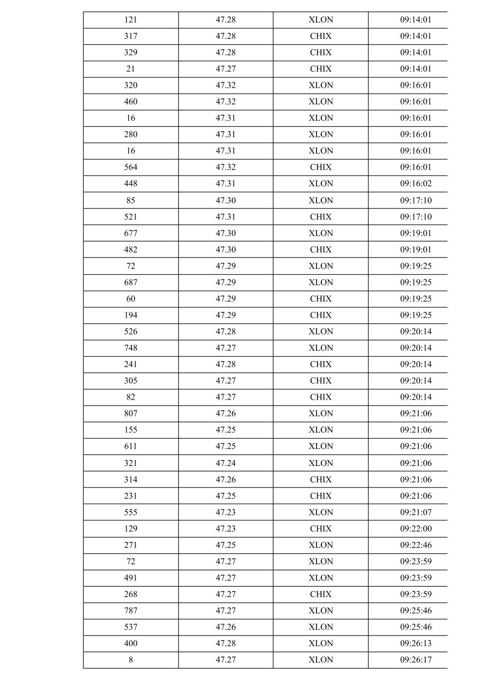 765 47.22 CHIX 08:47:03 191 47.26 XLON 08:47:35 317 47.26 XLON 08:47:49 748 47.27 XLON 08:49:29 130 47.27 CHIX 08:50:28 102 47.27 CHIX 08:50:28 750 47.27 XLON 08:51:23 747 47.28 XLON 08:51:30 330 47.28 CHIX 08:51:30 752 47.27 XLON 08:53:20 714 47.26 XLON 08:53:20 74 47.26 XLON 08:53:20 305 47.27 CHIX 08:53:20 113 47.26 CHIX 08:53:20 149 47.26 CHIX 08:53:22 341 47.25 XLON 08:54:46 274 47.25 CHIX 08:54:46 51 47.24 XLON 08:55:43 328 47.24 XLON 08:55:43 107 47.24 CHIX 08:55:43 96 47.24 CHIX 08:55:43 556 47.23 XLON 08:55:53 206 47.23 CHIX 08:55:53 336 47.23 XLON 08:56:19 209 47.23 CHIX 08:56:19 605 47.22 XLON 08:56:20 592 47.21 XLON 08:56:20 202 47.22 CHIX 08:56:20 361 47.25 XLON 08:58:14 649 47.27 XLON 09:00:01 427 47.26 XLON 09:00:33 5 47.25 XLON 09:00:33 182 47.25 XLON 09:00:33 182 47.25 XLON 09:00:33 10 47.25 XLON 09:00:33 18 47.25 XLON 09:00:33 29 47.25 XLON 09:00:33 21 47.25 XLON 09:00:33 20 47.25 XLON 09:00:33 277 47.26 CHIX 09:00:33