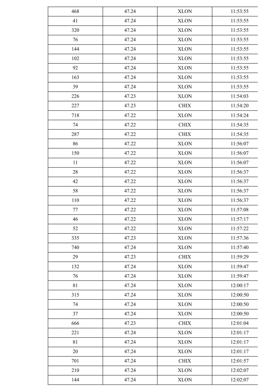 468 47.24 XLON 11:53:55 41 47.24 XLON 11:53:55 320 47.24 XLON 11:53:55 76 47.24 XLON 11:53:55 144 47.24 XLON 11:53:55 102 47.24 XLON 11:53:55 92 47.24 XLON 11:53:55 163 47.24 XLON 11:53:55 39 47.24 XLON 11:53:55 226 47.23 XLON 11:54:03 227 47.23 CHIX 11:54:20 718 47.22 XLON 11:54:24 74 47.22 CHIX 11:54:35 287 47.22 CHIX 11:54:35 86 47.22 XLON 11:56:07 150 47.22 XLON 11:56:07 11 47.22 XLON 11:56:07 28 47.22 XLON 11:56:37 42 47.22 XLON 11:56:37 58 47.22 XLON 11:56:37 110 47.22 XLON 11:56:37 77 47.22 XLON 11:57:08 46 47.22 XLON 11:57:17 52 47.22 XLON 11:57:22 335 47.23 XLON 11:57:36 740 47.24 XLON 11:57:40 29 47.23 CHIX 11:59:29 132 47.24 XLON 11:59:47 76 47.24 XLON 11:59:47 81 47.24 XLON 12:00:17 315 47.24 XLON 12:00:50 74 47.24 XLON 12:00:50 37 47.24 XLON 12:00:50 666 47.23 CHIX 12:01:04 221 47.24 XLON 12:01:17 81 47.24 XLON 12:01:17 20 47.24 XLON 12:01:17 701 47.24 CHIX 12:01:57 210 47.24 XLON 12:02:07 144 47.24 XLON 12:02:07
