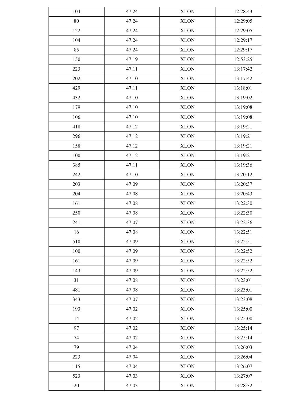 104 47.24 XLON 12:28:43 80 47.24 XLON 12:29:05 122 47.24 XLON 12:29:05 104 47.24 XLON 12:29:17 85 47.24 XLON 12:29:17 150 47.19 XLON 12:53:25 223 47.11 XLON 13:17:42 202 47.10 XLON 13:17:42 429 47.11 XLON 13:18:01 432 47.10 XLON 13:19:02 179 47.10 XLON 13:19:08 106 47.10 XLON 13:19:08 418 47.12 XLON 13:19:21 296 47.12 XLON 13:19:21 158 47.12 XLON 13:19:21 100 47.12 XLON 13:19:21 385 47.11 XLON 13:19:36 242 47.10 XLON 13:20:12 203 47.09 XLON 13:20:37 204 47.08 XLON 13:20:43 161 47.08 XLON 13:22:30 250 47.08 XLON 13:22:30 241 47.07 XLON 13:22:36 16 47.08 XLON 13:22:51 510 47.09 XLON 13:22:51 100 47.09 XLON 13:22:52 161 47.09 XLON 13:22:52 143 47.09 XLON 13:22:52 31 47.08 XLON 13:23:01 481 47.08 XLON 13:23:01 343 47.07 XLON 13:23:08 193 47.02 XLON 13:25:00 14 47.02 XLON 13:25:00 97 47.02 XLON 13:25:14 74 47.02 XLON 13:25:14 79 47.04 XLON 13:26:03 223 47.04 XLON 13:26:04 115 47.04 XLON 13:26:07 523 47.03 XLON 13:27:07 20 47.03 XLON 13:28:32