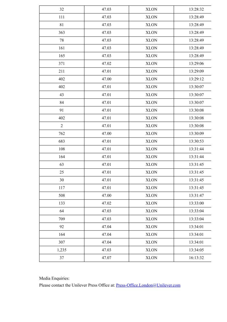 32 47.03 XLON 13:28:32 111 47.03 XLON 13:28:49 81 47.03 XLON 13:28:49 363 47.03 XLON 13:28:49 78 47.03 XLON 13:28:49 161 47.03 XLON 13:28:49 165 47.03 XLON 13:28:49 371 47.02 XLON 13:29:06 211 47.01 XLON 13:29:09 402 47.00 XLON 13:29:12 402 47.01 XLON 13:30:07 43 47.01 XLON 13:30:07 84 47.01 XLON 13:30:07 91 47.01 XLON 13:30:08 402 47.01 XLON 13:30:08 2 47.01 XLON 13:30:08 762 47.00 XLON 13:30:09 683 47.01 XLON 13:30:53 108 47.01 XLON 13:31:44 164 47.01 XLON 13:31:44 63 47.01 XLON 13:31:45 25 47.01 XLON 13:31:45 30 47.01 XLON 13:31:45 117 47.01 XLON 13:31:45 508 47.00 XLON 13:31:47 133 47.02 XLON 13:33:00 64 47.03 XLON 13:33:04 709 47.03 XLON 13:33:04 92 47.04 XLON 13:34:01 164 47.04 XLON 13:34:01 307 47.04 XLON 13:34:01 1,235 47.03 XLON 13:34:05 37 47.07 XLON 16:13:32 Media Enquiries: Please contact the Unilever Press Office at: Press-Office.London@Unilever.com