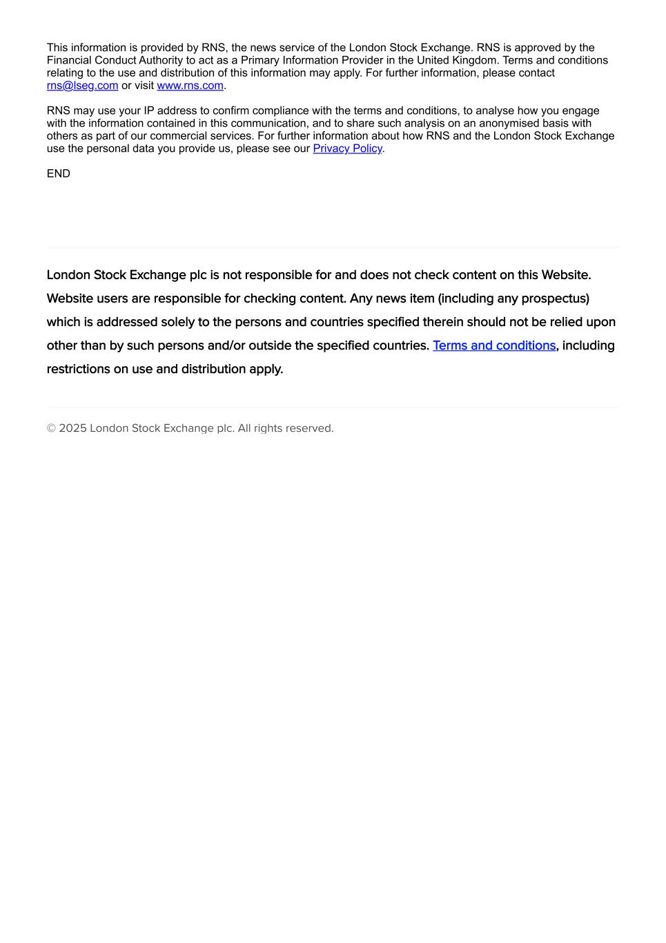 This information is provided by RNS, the news service of the London Stock Exchange. RNS is approved by the Financial Conduct Authority to act as a Primary Information Provider in the United Kingdom. Terms and conditions relating to the use and distribution of this information may apply. For further information, please contact rns@lseg.com or visit www.rns.com. RNS may use your IP address to confirm compliance with the terms and conditions, to analyse how you engage with the information contained in this communication, and to share such analysis on an anonymised basis with others as part of our commercial services. For further information about how RNS and the London Stock Exchange use the personal data you provide us, please see our Privacy Policy. END London Stock Exchange plc is not responsible for and does not check content on this Website. Website users are responsible for checking content. Any news item (including any prospectus) which is addressed solely to the persons and countries specified therein should not be relied upon other than by such persons and/or outside the specified countries. Terms and conditions, including restrictions on use and distribution apply. © 2025 London Stock Exchange plc. All rights reserved.