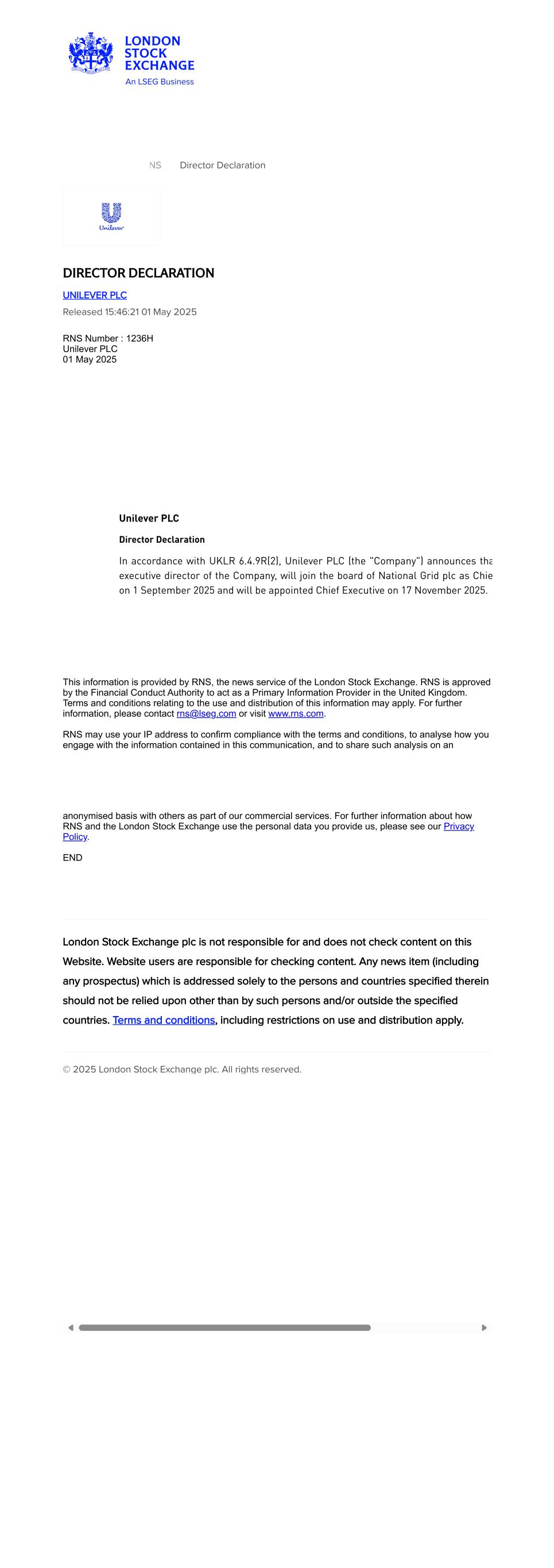 RNS Director Declaration DIRECTOR DECLARATION UNILEVER PLC Released 15:46:21 01 May 2025 RNS Number : 1236H Unilever PLC 01 May 2025     Unilever PLC Director Declaration In accordance with UKLR 6.4.9R(2), Unilever PLC (the "Company") announces tha executive director of the Company, will join the board of National Grid plc as Chie on 1 September 2025 and will be appointed Chief Executive on 17 November 2025. This information is provided by RNS, the news service of the London Stock Exchange. RNS is approved by the Financial Conduct Authority to act as a Primary Information Provider in the United Kingdom. Terms and conditions relating to the use and distribution of this information may apply. For further information, please contact rns@lseg.com or visit www.rns.com. RNS may use your IP address to confirm compliance with the terms and conditions, to analyse how you engage with the information contained in this communication, and to share such analysis on an   anonymised basis with others as part of our commercial services. For further information about how RNS and the London Stock Exchange use the personal data you provide us, please see our Privacy Policy. END London Stock Exchange plc is not responsible for and does not check content on this Website. Website users are responsible for checking content. Any news item (including any prospectus) which is addressed solely to the persons and countries specified therein should not be relied upon other than by such persons and/or outside the specified countries. Terms and conditions, including restrictions on use and distribution apply. © 2025 London Stock Exchange plc. All rights reserved.