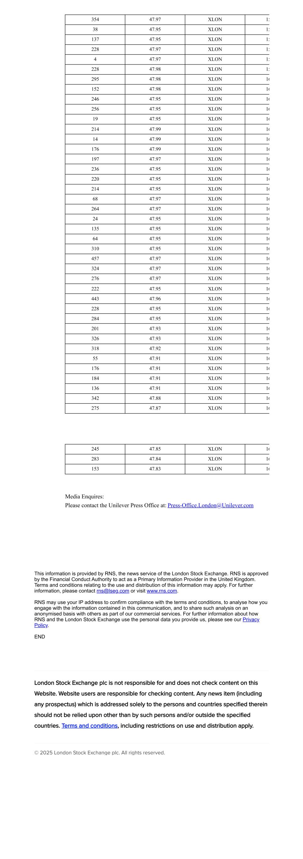 354 47.97 XLON 15 38 47.95 XLON 15 137 47.95 XLON 15 228 47.97 XLON 15 4 47.97 XLON 15 228 47.98 XLON 15 295 47.98 XLON 16 152 47.98 XLON 16 246 47.95 XLON 16 256 47.95 XLON 16 19 47.95 XLON 16 214 47.99 XLON 16 14 47.99 XLON 16 176 47.99 XLON 16 197 47.97 XLON 16 236 47.95 XLON 16 220 47.95 XLON 16 214 47.95 XLON 16 68 47.97 XLON 16 264 47.97 XLON 16 24 47.95 XLON 16 135 47.95 XLON 16 64 47.95 XLON 16 310 47.95 XLON 16 457 47.97 XLON 16 324 47.97 XLON 16 276 47.97 XLON 16 222 47.95 XLON 16 443 47.96 XLON 16 228 47.95 XLON 16 284 47.95 XLON 16 201 47.93 XLON 16 326 47.93 XLON 16 318 47.92 XLON 16 55 47.91 XLON 16 176 47.91 XLON 16 184 47.91 XLON 16 136 47.91 XLON 16 342 47.88 XLON 16 275 47.87 XLON 16 245 47.85 XLON 16 283 47.84 XLON 16 153 47.83 XLON 16 Media Enquires: Please contact the Unilever Press Office at: Press-Office.London@Unilever.com This information is provided by RNS, the news service of the London Stock Exchange. RNS is approved by the Financial Conduct Authority to act as a Primary Information Provider in the United Kingdom. Terms and conditions relating to the use and distribution of this information may apply. For further information, please contact rns@lseg.com or visit www.rns.com. RNS may use your IP address to confirm compliance with the terms and conditions, to analyse how you engage with the information contained in this communication, and to share such analysis on an anonymised basis with others as part of our commercial services. For further information about how RNS and the London Stock Exchange use the personal data you provide us, please see our Privacy Policy. END London Stock Exchange plc is not responsible for and does not check content on this Website. Website users are responsible for checking content. Any news item (including any prospectus) which is addressed solely to the persons and countries specified therein should not be relied upon other than by such persons and/or outside the specified countries. Terms and conditions, including restrictions on use and distribution apply. © 2025 London Stock Exchange plc. All rights reserved.