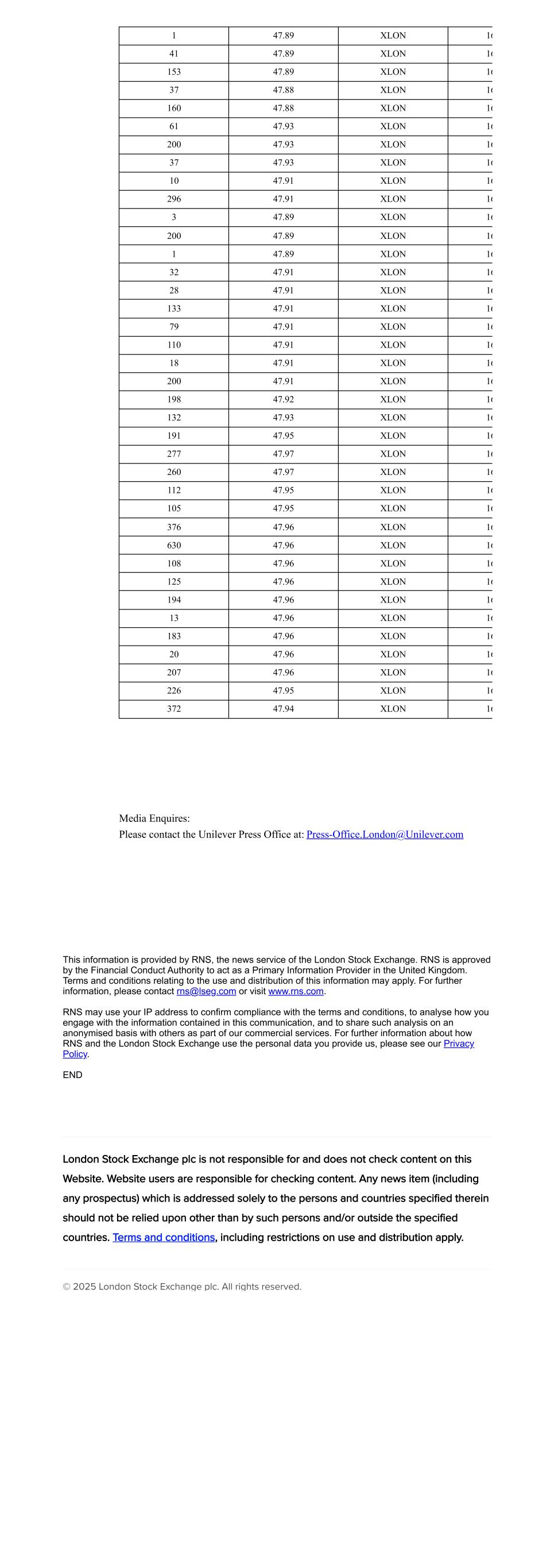 1 47.89 XLON 16 41 47.89 XLON 16 153 47.89 XLON 16 37 47.88 XLON 16 160 47.88 XLON 16 61 47.93 XLON 16 200 47.93 XLON 16 37 47.93 XLON 16 10 47.91 XLON 16 296 47.91 XLON 16 3 47.89 XLON 16 200 47.89 XLON 16 1 47.89 XLON 16 32 47.91 XLON 16 28 47.91 XLON 16 133 47.91 XLON 16 79 47.91 XLON 16 110 47.91 XLON 16 18 47.91 XLON 16 200 47.91 XLON 16 198 47.92 XLON 16 132 47.93 XLON 16 191 47.95 XLON 16 277 47.97 XLON 16 260 47.97 XLON 16 112 47.95 XLON 16 105 47.95 XLON 16 376 47.96 XLON 16 630 47.96 XLON 16 108 47.96 XLON 16 125 47.96 XLON 16 194 47.96 XLON 16 13 47.96 XLON 16 183 47.96 XLON 16 20 47.96 XLON 16 207 47.96 XLON 16 226 47.95 XLON 16 372 47.94 XLON 16 Media Enquires: Please contact the Unilever Press Office at: Press-Office.London@Unilever.com This information is provided by RNS, the news service of the London Stock Exchange. RNS is approved by the Financial Conduct Authority to act as a Primary Information Provider in the United Kingdom. Terms and conditions relating to the use and distribution of this information may apply. For further information, please contact rns@lseg.com or visit www.rns.com. RNS may use your IP address to confirm compliance with the terms and conditions, to analyse how you engage with the information contained in this communication, and to share such analysis on an anonymised basis with others as part of our commercial services. For further information about how RNS and the London Stock Exchange use the personal data you provide us, please see our Privacy Policy. END London Stock Exchange plc is not responsible for and does not check content on this Website. Website users are responsible for checking content. Any news item (including any prospectus) which is addressed solely to the persons and countries specified therein should not be relied upon other than by such persons and/or outside the specified countries. Terms and conditions, including restrictions on use and distribution apply. © 2025 London Stock Exchange plc. All rights reserved.