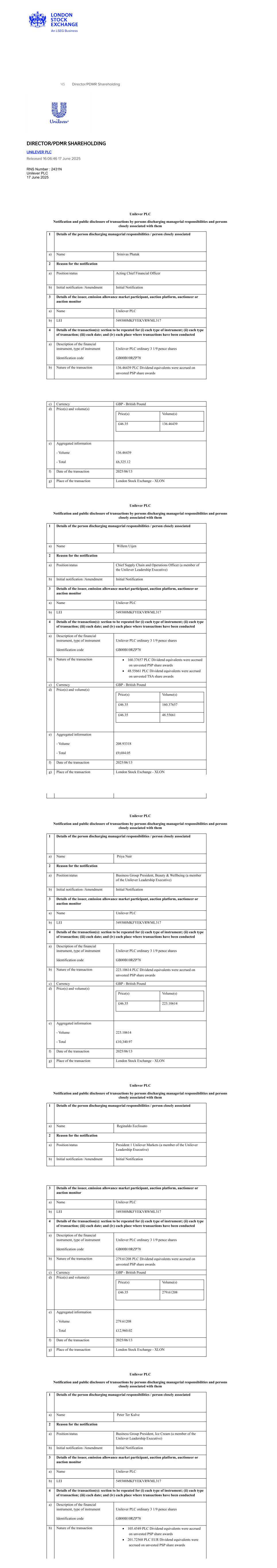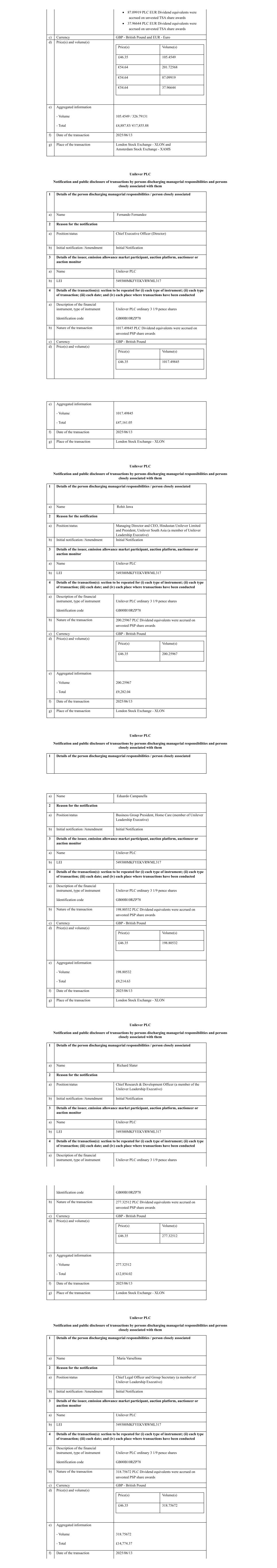 · 87.09919 PLC EUR Dividend equivalents were accrued on unvested TSA share awards · 37.96644 PLC EUR Dividend equivalents were accrued on unvested TSA share awards c) Currency GBP - British Pound and EUR - Euro d) Price(s) and volume(s) Price(s) Volume(s) £46.35 105.4549 €54.64 201.72568 €54.64 87.09919 €54.64 37.96644 e) Aggregated information - Volume - Total 105.4549 / 326.79131 £4,887.83/ €17,855.88 f) Date of the transaction 2025/06/13 g) Place of the transaction London Stock Exchange - XLON and Amsterdam Stock Exchange - XAMS Unilever PLC Notification and public disclosure of transactions by persons discharging managerial responsibilities and persons closely associated with them 1 Details of the person discharging managerial responsibilities / person closely associated a) Name Fernando Fernandez 2 Reason for the notification a) Position/status Chief Executive Officer (Director) b) Initial notification /Amendment Initial Notification 3 Details of the issuer, emission allowance market participant, auction platform, auctioneer or auction monitor a) Name Unilever PLC b) LEI 549300MKFYEKVRWML317 4 Details of the transaction(s): section to be repeated for (i) each type of instrument; (ii) each type of transaction; (iii) each date; and (iv) each place where transactions have been conducted a) Description of the financial instrument, type of instrument Identification code Unilever PLC ordinary 3 1/9 pence shares GB00B10RZP78 b) Nature of the transaction 1017.49845 PLC Dividend equivalents were accrued on unvested PSP share awards c) Currency GBP - British Pound d) Price(s) and volume(s) Price(s) Volume(s) £46.35 1017.49845 e) Aggregated information - Volume - Total 1017.49845 £47,161.05 f) Date of the transaction 2025/06/13 g) Place of the transaction London Stock Exchange - XLON Unilever PLC Notification and public disclosure of transactions by persons discharging managerial responsibilities and persons closely associated with them 1 Details of the person discharging managerial responsibilities / person closely associated a) Name Rohit Jawa 2 Reason for the notification a) Position/status Managing Director and CEO, Hindustan Unilever Limited and President, Unilever South Asia (a member of Unilever Leadership Executive) b) Initial notification /Amendment Initial Notification 3 Details of the issuer, emission allowance market participant, auction platform, auctioneer or auction monitor a) Name Unilever PLC b) LEI 549300MKFYEKVRWML317 4 Details of the transaction(s): section to be repeated for (i) each type of instrument; (ii) each type of transaction; (iii) each date; and (iv) each place where transactions have been conducted a) Description of the financial instrument, type of instrument Identification code Unilever PLC ordinary 3 1/9 pence shares GB00B10RZP78 b) Nature of the transaction 200.25967 PLC Dividend equivalents were accrued on unvested PSP share awards c) Currency GBP - British Pound d) Price(s) and volume(s) Price(s) Volume(s) £46.35 200.25967 e) Aggregated information - Volume - Total 200.25967 £9,282.04 f) Date of the transaction 2025/06/13 g) Place of the transaction London Stock Exchange - XLON Unilever PLC Notification and public disclosure of transactions by persons discharging managerial responsibilities and persons closely associated with them 1 Details of the person discharging managerial responsibilities / person closely associated a) Name Eduardo Campanella 2 Reason for the notification a) Position/status Business Group President, Home Care (member of Unilever Leadership Executive) b) Initial notification /Amendment Initial Notification 3 Details of the issuer, emission allowance market participant, auction platform, auctioneer or auction monitor a) Name Unilever PLC b) LEI 549300MKFYEKVRWML317 4 Details of the transaction(s): section to be repeated for (i) each type of instrument; (ii) each type of transaction; (iii) each date; and (iv) each place where transactions have been conducted a) Description of the financial instrument, type of instrument Identification code Unilever PLC ordinary 3 1/9 pence shares GB00B10RZP78 b) Nature of the transaction 198.80532 PLC Dividend equivalents were accrued on unvested PSP share awards c) Currency GBP - British Pound d) Price(s) and volume(s) Price(s) Volume(s) £46.35 198.80532 e) Aggregated information - Volume - Total 198.80532 £9,214.63 f) Date of the transaction 2025/06/13 g) Place of the transaction London Stock Exchange - XLON Unilever PLC Notification and public disclosure of transactions by persons discharging managerial responsibilities and persons closely associated with them 1 Details of the person discharging managerial responsibilities / person closely associated a) Name Richard Slater 2 Reason for the notification a) Position/status Chief Research & Development Officer (a member of the Unilever Leadership Executive) b) Initial notification /Amendment Initial Notification 3 Details of the issuer, emission allowance market participant, auction platform, auctioneer or auction monitor a) Name Unilever PLC b) LEI 549300MKFYEKVRWML317 4 Details of the transaction(s): section to be repeated for (i) each type of instrument; (ii) each type of transaction; (iii) each date; and (iv) each place where transactions have been conducted a) Description of the financial instrument, type of instrument Unilever PLC ordinary 3 1/9 pence shares Identification code GB00B10RZP78 b) Nature of the transaction 277.32512 PLC Dividend equivalents were accrued on unvested PSP share awards c) Currency GBP - British Pound d) Price(s) and volume(s) Price(s) Volume(s) £46.35 277.32512 e) Aggregated information - Volume - Total 277.32512 £12,854.02 f) Date of the transaction 2025/06/13 g) Place of the transaction London Stock Exchange - XLON Unilever PLC Notification and public disclosure of transactions by persons discharging managerial responsibilities and persons closely associated with them 1 Details of the person dischargin