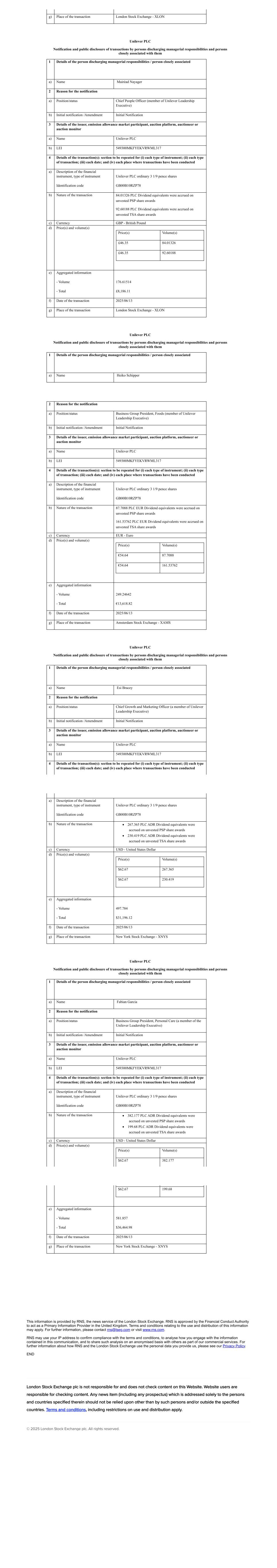 g) Place of the transaction London Stock Exchange - XLON Unilever PLC Notification and public disclosure of transactions by persons discharging managerial responsibilities and persons closely associated with them 1 Details of the person discharging managerial responsibilities / person closely associated a) Name Mairéad Nayager 2 Reason for the notification a) Position/status Chief People Officer (member of Unilever Leadership Executive) b) Initial notification /Amendment Initial Notification 3 Details of the issuer, emission allowance market participant, auction platform, auctioneer or auction monitor a) Name Unilever PLC b) LEI 549300MKFYEKVRWML317 4 Details of the transaction(s): section to be repeated for (i) each type of instrument; (ii) each type of transaction; (iii) each date; and (iv) each place where transactions have been conducted a) Description of the financial instrument, type of instrument Identification code Unilever PLC ordinary 3 1/9 pence shares GB00B10RZP78 b) Nature of the transaction 84.01326 PLC Dividend equivalents were accrued on unvested PSP share awards 92.60188 PLC Dividend equivalents were accrued on unvested TSA share awards c) Currency GBP - British Pound d) Price(s) and volume(s) Price(s) Volume(s) £46.35 84.01326 £46.35 92.60188 e) Aggregated information - Volume - Total 176.61514 £8,186.11 f) Date of the transaction 2025/06/13 g) Place of the transaction London Stock Exchange - XLON Unilever PLC Notification and public disclosure of transactions by persons discharging managerial responsibilities and persons closely associated with them 1 Details of the person discharging managerial responsibilities / person closely associated a) Name Heiko Schipper 2 Reason for the notification a) Position/status Business Group President, Foods (member of Unilever Leadership Executive) b) Initial notification /Amendment Initial Notification 3 Details of the issuer, emission allowance market participant, auction platform, auctioneer or auction monitor a) Name Unilever PLC b) LEI 549300MKFYEKVRWML317 4 Details of the transaction(s): section to be repeated for (i) each type of instrument; (ii) each type of transaction; (iii) each date; and (iv) each place where transactions have been conducted a) Description of the financial instrument, type of instrument Identification code Unilever PLC ordinary 3 1/9 pence shares GB00B10RZP78 b) Nature of the transaction 87.7088 PLC EUR Dividend equivalents were accrued on unvested PSP share awards 161.53762 PLC EUR Dividend equivalents were accrued on unvested TSA share awards c) Currency EUR - Euro d) Price(s) and volume(s) Price(s) Volume(s) €54.64 87.7088 €54.64 161.53762 e) Aggregated information - Volume - Total 249.24642 €13,618.82 f) Date of the transaction 2025/06/13 g) Place of the transaction Amsterdam Stock Exchange - XAMS Unilever PLC Notification and public disclosure of transactions by persons discharging managerial responsibilities and persons closely associated with them 1 Details of the person discharging managerial responsibilities / person closely associated a) Name Esi Bracey 2 Reason for the notification a) Position/status Chief Growth and Marketing Officer (a member of Unilever Leadership Executive) b) Initial notification /Amendment Initial Notification 3 Details of the issuer, emission allowance market participant, auction platform, auctioneer or auction monitor a) Name Unilever PLC b) LEI 549300MKFYEKVRWML317 4 Details of the transaction(s): section to be repeated for (i) each type of instrument; (ii) each type of transaction; (iii) each date; and (iv) each place where transactions have been conducted a) Description of the financial instrument, type of instrument Identification code Unilever PLC ordinary 3 1/9 pence shares GB00B10RZP78 b) Nature of the transaction · 267.365 PLC ADR Dividend equivalents were accrued on unvested PSP share awards · 230.419 PLC ADR Dividend equivalents were accrued on unvested TSA share awards c) Currency USD - United States Dollar d) Price(s) and volume(s) Price(s) Volume(s) $62.67 267.365 $62.67 230.419 e) Aggregated information - Volume - Total 497.784 $31,196.12 f) Date of the transaction 2025/06/13 g) Place of the transaction New York Stock Exchange - XNYS Unilever PLC Notification and public disclosure of transactions by persons discharging managerial responsibilities and persons closely associated with them 1 Details of the person discharging managerial responsibilities / person closely associated a) Name Fabian Garcia 2 Reason for the notification a) Position/status Business Group President, Personal Care (a member of the Unilever Leadership Executive) b) Initial notification /Amendment Initial Notification 3 Details of the issuer, emission allowance market participant, auction platform, auctioneer or auction monitor a) Name Unilever PLC b) LEI 549300MKFYEKVRWML317 4 Details of the transaction(s): section to be repeated for (i) each type of instrument; (ii) each type of transaction; (iii) each date; and (iv) each place where transactions have been conducted a) Description of the financial instrument, type of instrument Identification code Unilever PLC ordinary 3 1/9 pence shares GB00B10RZP78 b) Nature of the transaction · 382.177 PLC ADR Dividend equivalents were accrued on unvested PSP share awards · 199.68 PLC ADR Dividend equivalents were accrued on unvested TSA share awards c) Currency USD - United States Dollar d) Price(s) and volume(s) Price(s) Volume(s) $62.67 382.177 $62.67 199.68 e) Aggregated information - Volume - Total 581.857 $36,464.98 f) Date of the transaction 2025/06/13 g) Place of the transaction New York Stock Exchange - XNYS This information is provided by RNS, the news service of the London Stock Exchange. RNS is approved by the Financial Conduct Authority to act as a Primary Information Provider in the United Kingdom. Terms and conditions relating to the use and distribution of this information may apply. For further information, please cont