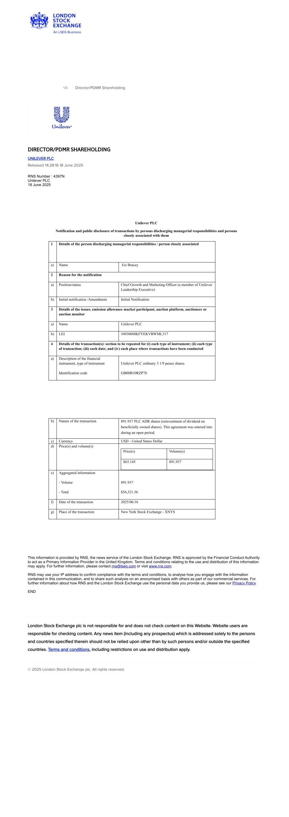RNS Director/PDMR Shareholding DIRECTOR/PDMR SHAREHOLDING UNILEVER PLC Released 14:28:16 18 June 2025 RNS Number : 4397N Unilever PLC 18 June 2025 Unilever PLC Notification and public disclosure of transactions by persons discharging managerial responsibilities and persons closely associated with them 1 Details of the person discharging managerial responsibilities / person closely associated a) Name Esi Bracey 2 Reason for the notification a) Position/status Chief Growth and Marketing Officer (a member of Unilever Leadership Executive) b) Initial notification /Amendment Initial Notification 3 Details of the issuer, emission allowance market participant, auction platform, auctioneer or auction monitor a) Name Unilever PLC b) LEI 549300MKFYEKVRWML317 4 Details of the transaction(s): section to be repeated for (i) each type of instrument; (ii) each type of transaction; (iii) each date; and (iv) each place where transactions have been conducted a) Description of the financial instrument, type of instrument Identification code Unilever PLC ordinary 3 1/9 pence shares GB00B10RZP78 b) Nature of the transaction 891.937 PLC ADR shares (reinvestment of dividend on beneficially owned shares). This agreement was entered into during an open period. c) Currency USD - United States Dollar d) Price(s) and volume(s) Price(s) Volume(s) $63.145 891.937 e) Aggregated information - Volume - Total 891.937 $56,321.36 f) Date of the transaction 2025/06/16 g) Place of the transaction New York Stock Exchange - XNYS This information is provided by RNS, the news service of the London Stock Exchange. RNS is approved by the Financial Conduct Authority to act as a Primary Information Provider in the United Kingdom. Terms and conditions relating to the use and distribution of this information may apply. For further information, please contact rns@lseg.com or visit www.rns.com. RNS may use your IP address to confirm compliance with the terms and conditions, to analyse how you engage with the information contained in this communication, and to share such analysis on an anonymised basis with others as part of our commercial services. For further information about how RNS and the London Stock Exchange use the personal data you provide us, please see our Privacy Policy. END London Stock Exchange plc is not responsible for and does not check content on this Website. Website users are responsible for checking content. Any news item (including any prospectus) which is addressed solely to the persons and countries specified therein should not be relied upon other than by such persons and/or outside the specified countries. Terms and conditions, including restrictions on use and distribution apply. © 2025 London Stock Exchange plc. All rights reserved.