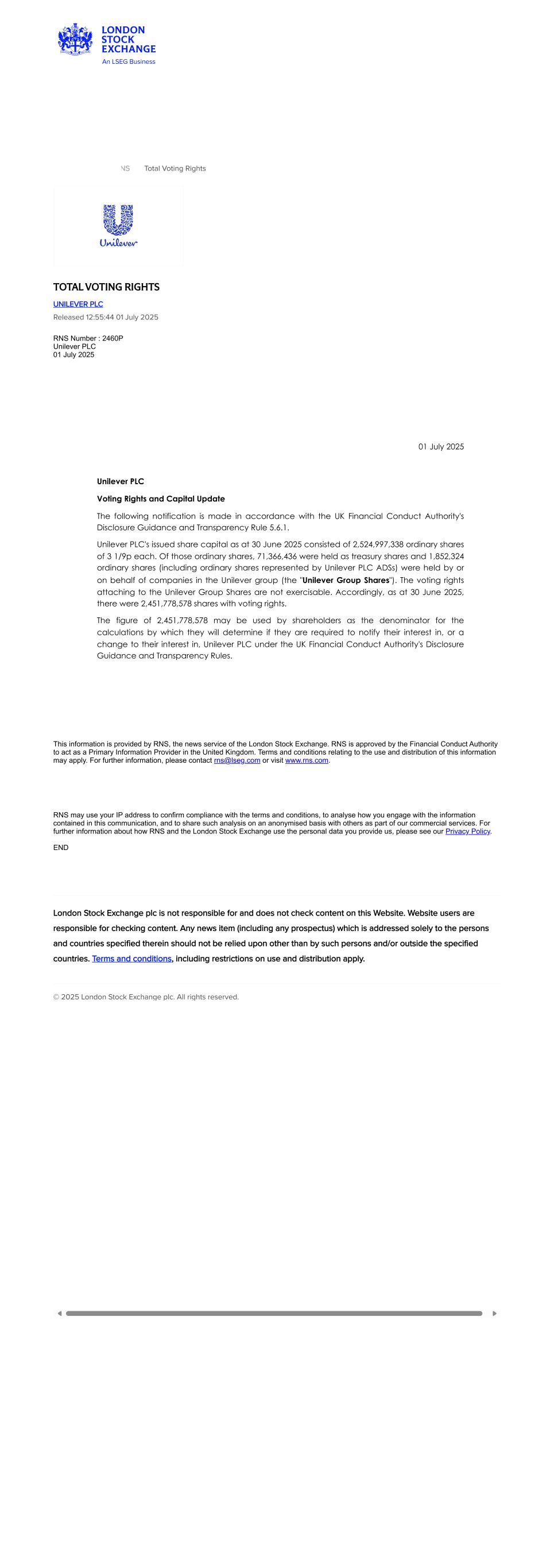 RNS Total Voting Rights TOTAL VOTING RIGHTS UNILEVER PLC Released 12:55:44 01 July 2025 RNS Number : 2460P Unilever PLC 01 July 2025   01 July 2025   Unilever PLC Voting Rights and Capital Update The following notification is made in accordance with the UK Financial Conduct Authority's Disclosure Guidance and Transparency Rule 5.6.1. Unilever PLC's issued share capital as at 30 June 2025 consisted of 2,524,997,338 ordinary shares of 3 1/9p each. Of those ordinary shares, 71,366,436 were held as treasury shares and 1,852,324 ordinary shares (including ordinary shares represented by Unilever PLC ADSs) were held by or on behalf of companies in the Unilever group (the "Unilever Group Shares"). The voting rights attaching to the Unilever Group Shares are not exercisable. Accordingly, as at 30 June 2025, there were 2,451,778,578 shares with voting rights. The figure of 2,451,778,578 may be used by shareholders as the denominator for the calculations by which they will determine if they are required to notify their interest in, or a change to their interest in, Unilever PLC under the UK Financial Conduct Authority's Disclosure Guidance and Transparency Rules.   This information is provided by RNS, the news service of the London Stock Exchange. RNS is approved by the Financial Conduct Authority to act as a Primary Information Provider in the United Kingdom. Terms and conditions relating to the use and distribution of this information may apply. For further information, please contact rns@lseg.com or visit www.rns.com.   RNS may use your IP address to confirm compliance with the terms and conditions, to analyse how you engage with the information contained in this communication, and to share such analysis on an anonymised basis with others as part of our commercial services. For further information about how RNS and the London Stock Exchange use the personal data you provide us, please see our Privacy Policy. END London Stock Exchange plc is not responsible for and does not check content on this Website. Website users are responsible for checking content. Any news item (including any prospectus) which is addressed solely to the persons and countries specified therein should not be relied upon other than by such persons and/or outside the specified countries. Terms and conditions, including restrictions on use and distribution apply. © 2025 London Stock Exchange plc. All rights reserved.