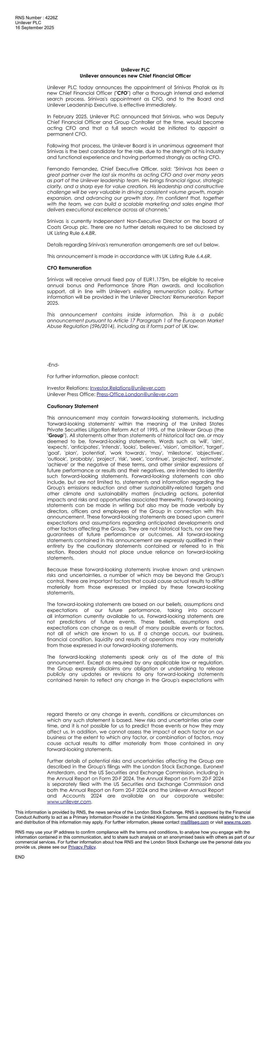 EX-99.1 2 a2025-09x16xunileverplca.htm EX-99.1 a2025-09x16xunileverplca
