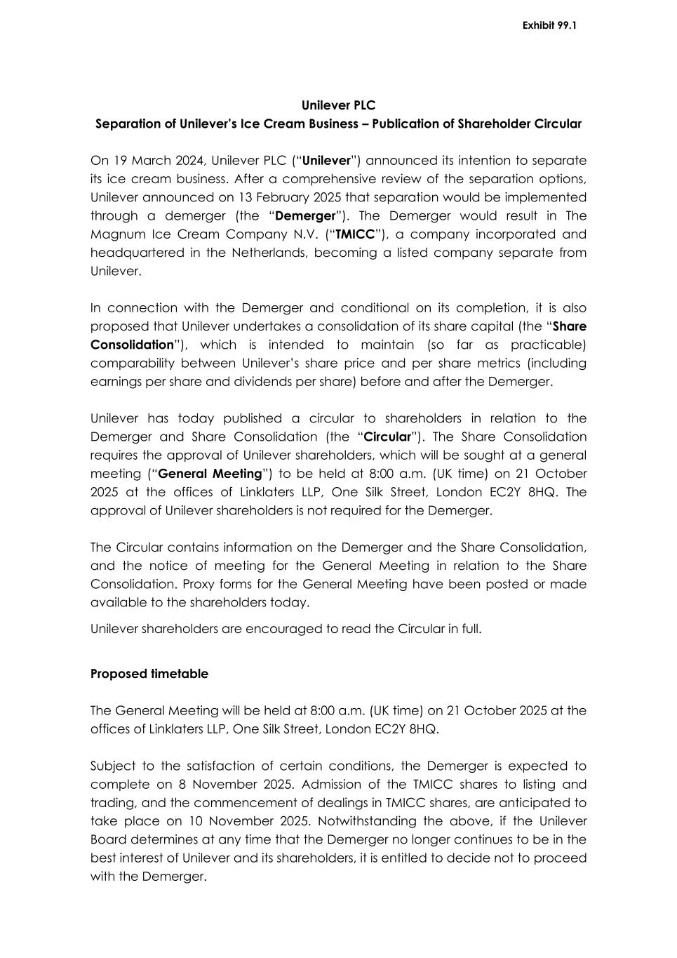 Unilever PLC Separation of Unilever’s Ice Cream Business – Publication of Shareholder Circular On 19 March 2024, Unilever PLC (“Unilever”) announced its intention to separate its ice cream business. After a comprehensive review of the separation options, Unilever announced on 13 February 2025 that separation would be implemented through a demerger (the “Demerger”). The Demerger would result in The Magnum Ice Cream Company N.V. (“TMICC”), a company incorporated and headquartered in the Netherlands, becoming a listed company separate from Unilever. In connection with the Demerger and conditional on its completion, it is also proposed that Unilever undertakes a consolidation of its share capital (the “Share Consolidation”), which is intended to maintain (so far as practicable) comparability between Unilever’s share price and per share metrics (including earnings per share and dividends per share) before and after the Demerger. Unilever has today published a circular to shareholders in relation to the Demerger and Share Consolidation (the “Circular”). The Share Consolidation requires the approval of Unilever shareholders, which will be sought at a general meeting (“General Meeting”) to be held at 8:00 a.m. (UK time) on 21 October 2025 at the offices of Linklaters LLP, One Silk Street, London EC2Y 8HQ. The approval of Unilever shareholders is not required for the Demerger. The Circular contains information on the Demerger and the Share Consolidation, and the notice of meeting for the General Meeting in relation to the Share Consolidation. Proxy forms for the General Meeting have been posted or made available to the shareholders today. Unilever shareholders are encouraged to read the Circular in full. Proposed timetable The General Meeting will be held at 8:00 a.m. (UK time) on 21 October 2025 at the offices of Linklaters LLP, One Silk Street, London EC2Y 8HQ. Subject to the satisfaction of certain conditions, the Demerger is expected to complete on 8 November 2025. Admission of the TMICC shares to listing and trading, and the commencement of dealings in TMICC shares, are anticipated to take place on 10 November 2025. Notwithstanding the above, if the Unilever Board determines at any time that the Demerger no longer continues to be in the best interest of Unilever and its shareholders, it is entitled to decide not to proceed with the Demerger.