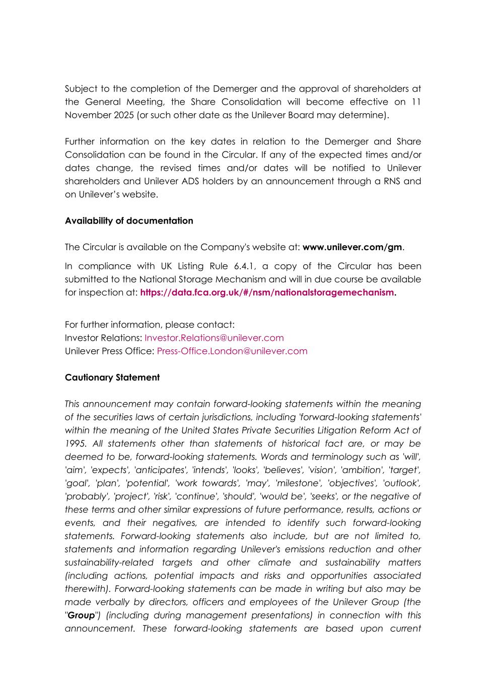 Subject to the completion of the Demerger and the approval of shareholders at the General Meeting, the Share Consolidation will become effective on 11 November 2025 (or such other date as the Unilever Board may determine). Further information on the key dates in relation to the Demerger and Share Consolidation can be found in the Circular. If any of the expected times and/or dates change, the revised times and/or dates will be notified to Unilever shareholders and Unilever ADS holders by an announcement through a RNS and on Unilever’s website. Availability of documentation The Circular is available on the Company's website at: www.unilever.com/gm. In compliance with UK Listing Rule 6.4.1, a copy of the Circular has been submitted to the National Storage Mechanism and will in due course be available for inspection at: https://data.fca.org.uk/#/nsm/nationalstoragemechanism. For further information, please contact: Investor Relations: Investor.Relations@unilever.com Unilever Press Office: Press-Office.London@unilever.com Cautionary Statement This announcement may contain forward-looking statements within the meaning of the securities laws of certain jurisdictions, including 'forward-looking statements' within the meaning of the United States Private Securities Litigation Reform Act of 1995. All statements other than statements of historical fact are, or may be deemed to be, forward-looking statements. Words and terminology such as 'will', 'aim', 'expects', 'anticipates', 'intends', 'looks', 'believes', 'vision', 'ambition', 'target', 'goal', 'plan', 'potential', 'work towards', 'may', 'milestone', 'objectives', 'outlook', 'probably', 'project', 'risk', 'continue', 'should', 'would be', 'seeks', or the negative of these terms and other similar expressions of future performance, results, actions or events, and their negatives, are intended to identify such forward-looking statements. Forward-looking statements also include, but are not limited to, statements and information regarding Unilever's emissions reduction and other sustainability-related targets and other climate and sustainability matters (including actions, potential impacts and risks and opportunities associated therewith). Forward-looking statements can be made in writing but also may be made verbally by directors, officers and employees of the Unilever Group (the "Group") (including during management presentations) in connection with this announcement. These forward-looking statements are based upon current