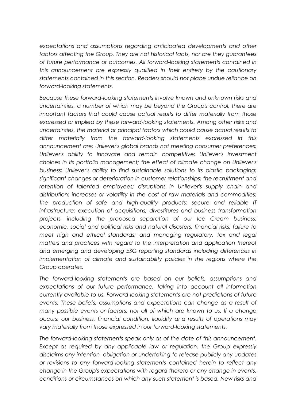 expectations and assumptions regarding anticipated developments and other factors affecting the Group. They are not historical facts, nor are they guarantees of future performance or outcomes. All forward-looking statements contained in this announcement are expressly qualified in their entirety by the cautionary statements contained in this section. Readers should not place undue reliance on forward-looking statements. Because these forward-looking statements involve known and unknown risks and uncertainties, a number of which may be beyond the Group's control, there are important factors that could cause actual results to differ materially from those expressed or implied by these forward-looking statements. Among other risks and uncertainties, the material or principal factors which could cause actual results to differ materially from the forward-looking statements expressed in this announcement are: Unilever's global brands not meeting consumer preferences; Unilever's ability to innovate and remain competitive; Unilever's investment choices in its portfolio management; the effect of climate change on Unilever's business; Unilever's ability to find sustainable solutions to its plastic packaging; significant changes or deterioration in customer relationships; the recruitment and retention of talented employees; disruptions in Unilever's supply chain and distribution; increases or volatility in the cost of raw materials and commodities; the production of safe and high-quality products; secure and reliable IT infrastructure; execution of acquisitions, divestitures and business transformation projects, including the proposed separation of our Ice Cream business; economic, social and political risks and natural disasters; financial risks; failure to meet high and ethical standards; and managing regulatory, tax and legal matters and practices with regard to the interpretation and application thereof and emerging and developing ESG reporting standards including differences in implementation of climate and sustainability policies in the regions where the Group operates. The forward-looking statements are based on our beliefs, assumptions and expectations of our future performance, taking into account all information currently available to us. Forward-looking statements are not predictions of future events. These beliefs, assumptions and expectations can change as a result of many possible events or factors, not all of which are known to us. If a change occurs, our business, financial condition, liquidity and results of operations may vary materially from those expressed in our forward-looking statements. The forward-looking statements speak only as of the date of this announcement. Except as required by any applicable law or regulation, the Group expressly disclaims any intention, obligation or undertaking to release publicly any updates or revisions to any forward-looking statements contained herein to reflect any change in the Group's expectations with regard thereto or any change in events, conditions or circumstances on which any such statement is based. New risks and