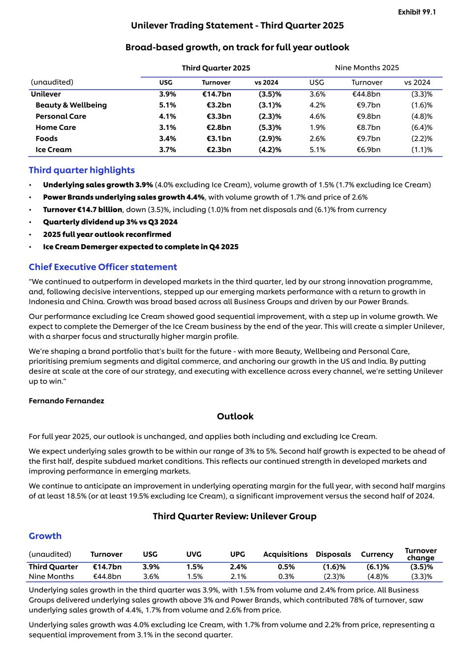 Unilever Trading Statement - Third Quarter 2025 Broad-based growth, on track for full year outlook Third Quarter 2025 Nine Months 2025 (unaudited) USG Turnover vs 2024 USG Turnover vs 2024 Unilever 3.9% €14.7bn (3.5)% 3.6% €44.8bn (3.3)% Beauty & Wellbeing 5.1% €3.2bn (3.1)% 4.2% €9.7bn (1.6)% Personal Care 4.1% €3.3bn (2.3)% 4.6% €9.8bn (4.8)% Home Care 3.1% €2.8bn (5.3)% 1.9% €8.7bn (6.4)% Foods 3.4% €3.1bn (2.9)% 2.6% €9.7bn (2.2)% Ice Cream 3.7% €2.3bn (4.2)% 5.1% €6.9bn (1.1)% Third quarter highlights • Underlying sales growth 3.9% (4.0% excluding Ice Cream), volume growth of 1.5% (1.7% excluding Ice Cream) • Power Brands underlying sales growth 4.4%, with volume growth of 1.7% and price of 2.6% • Turnover €14.7 billion, down (3.5)%, including (1.0)% from net disposals and (6.1)% from currency • Quarterly dividend up 3% vs Q3 2024 • 2025 full year outlook reconfirmed • Ice Cream Demerger expected to complete in Q4 2025 Chief Executive Officer statement “We continued to outperform in developed markets in the third quarter, led by our strong innovation programme, and, following decisive interventions, stepped up our emerging markets performance with a return to growth in Indonesia and China. Growth was broad based across all Business Groups and driven by our Power Brands. Our performance excluding Ice Cream showed good sequential improvement, with a step up in volume growth. We expect to complete the Demerger of the Ice Cream business by the end of the year. This will create a simpler Unilever, with a sharper focus and structurally higher margin profile. We’re shaping a brand portfolio that’s built for the future - with more Beauty, Wellbeing and Personal Care, prioritising premium segments and digital commerce, and anchoring our growth in the US and India. By putting desire at scale at the core of our strategy, and executing with excellence across every channel, we’re setting Unilever up to win.” Fernando Fernandez Outlook For full year 2025, our outlook is unchanged, and applies both including and excluding Ice Cream. We expect underlying sales growth to be within our range of 3% to 5%. Second half growth is expected to be ahead of the first half, despite subdued market conditions. This reflects our continued strength in developed markets and improving performance in emerging markets. We continue to anticipate an improvement in underlying operating margin for the full year, with second half margins of at least 18.5% (or at least 19.5% excluding Ice Cream), a significant improvement versus the second half of 2024. Third Quarter Review: Unilever Group Growth (unaudited) Turnover USG UVG UPG Acquisitions Disposals Currency Turnover change Third Quarter €14.7bn 3.9% 1.5% 2.4% 0.5% (1.6)% (6.1)% (3.5)% Nine Months €44.8bn 3.6% 1.5% 2.1% 0.3% (2.3)% (4.8)% (3.3)% Underlying sales growth in the third quarter was 3.9%, with 1.5% from volume and 2.4% from price. All Business Groups delivered underlying sales growth above 3% and Power Brands, which contributed 78% of turnover, saw underlying sales growth of 4.4%, 1.7% from volume and 2.6% from price. Underlying sales growth was 4.0% excluding Ice Cream, with 1.7% from volume and 2.2% from price, representing a sequential improvement from 3.1% in the second quarter.