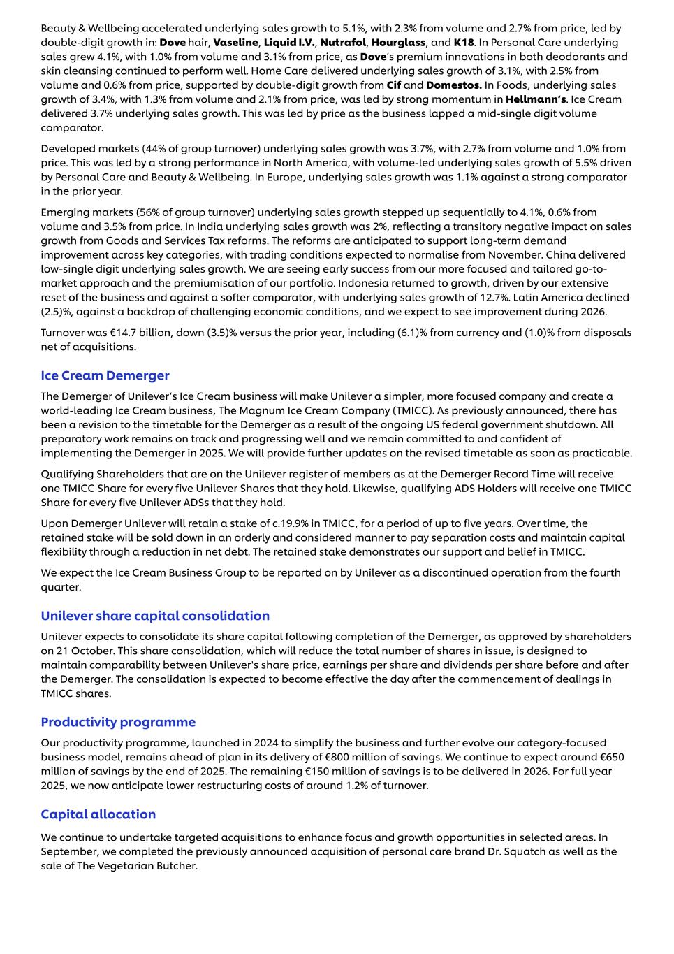 Beauty & Wellbeing accelerated underlying sales growth to 5.1%, with 2.3% from volume and 2.7% from price, led by double-digit growth in: Dove hair, Vaseline, Liquid I.V., Nutrafol, Hourglass, and K18. In Personal Care underlying sales grew 4.1%, with 1.0% from volume and 3.1% from price, as Dove’s premium innovations in both deodorants and skin cleansing continued to perform well. Home Care delivered underlying sales growth of 3.1%, with 2.5% from volume and 0.6% from price, supported by double-digit growth from Cif and Domestos. In Foods, underlying sales growth of 3.4%, with 1.3% from volume and 2.1% from price, was led by strong momentum in Hellmann’s. Ice Cream delivered 3.7% underlying sales growth. This was led by price as the business lapped a mid-single digit volume comparator. Developed markets (44% of group turnover) underlying sales growth was 3.7%, with 2.7% from volume and 1.0% from price. This was led by a strong performance in North America, with volume-led underlying sales growth of 5.5% driven by Personal Care and Beauty & Wellbeing. In Europe, underlying sales growth was 1.1% against a strong comparator in the prior year. Emerging markets (56% of group turnover) underlying sales growth stepped up sequentially to 4.1%, 0.6% from volume and 3.5% from price. In India underlying sales growth was 2%, reflecting a transitory negative impact on sales growth from Goods and Services Tax reforms. The reforms are anticipated to support long-term demand improvement across key categories, with trading conditions expected to normalise from November. China delivered low-single digit underlying sales growth. We are seeing early success from our more focused and tailored go-to- market approach and the premiumisation of our portfolio. Indonesia returned to growth, driven by our extensive reset of the business and against a softer comparator, with underlying sales growth of 12.7%. Latin America declined (2.5)%, against a backdrop of challenging economic conditions, and we expect to see improvement during 2026. Turnover was €14.7 billion, down (3.5)% versus the prior year, including (6.1)% from currency and (1.0)% from disposals net of acquisitions. Ice Cream Demerger The Demerger of Unilever’s Ice Cream business will make Unilever a simpler, more focused company and create a world-leading Ice Cream business, The Magnum Ice Cream Company (TMICC). As previously announced, there has been a revision to the timetable for the Demerger as a result of the ongoing US federal government shutdown. All preparatory work remains on track and progressing well and we remain committed to and confident of implementing the Demerger in 2025. We will provide further updates on the revised timetable as soon as practicable. Qualifying Shareholders that are on the Unilever register of members as at the Demerger Record Time will receive one TMICC Share for every five Unilever Shares that they hold. Likewise, qualifying ADS Holders will receive one TMICC Share for every five Unilever ADSs that they hold. Upon Demerger Unilever will retain a stake of c.19.9% in TMICC, for a period of up to five years. Over time, the retained stake will be sold down in an orderly and considered manner to pay separation costs and maintain capital flexibility through a reduction in net debt. The retained stake demonstrates our support and belief in TMICC. We expect the Ice Cream Business Group to be reported on by Unilever as a discontinued operation from the fourth quarter. Unilever share capital consolidation Unilever expects to consolidate its share capital following completion of the Demerger, as approved by shareholders on 21 October. This share consolidation, which will reduce the total number of shares in issue, is designed to maintain comparability between Unilever's share price, earnings per share and dividends per share before and after the Demerger. The consolidation is expected to become effective the day after the commencement of dealings in TMICC shares. Productivity programme Our productivity programme, launched in 2024 to simplify the business and further evolve our category-focused business model, remains ahead of plan in its delivery of €800 million of savings. We continue to expect around €650 million of savings by the end of 2025. The remaining €150 million of savings is to be delivered in 2026. For full year 2025, we now anticipate lower restructuring costs of around 1.2% of turnover. Capital allocation We continue to undertake targeted acquisitions to enhance focus and growth opportunities in selected areas. In September, we completed the previously announced acquisition of personal care brand Dr. Squatch as well as the sale of The Vegetarian Butcher.