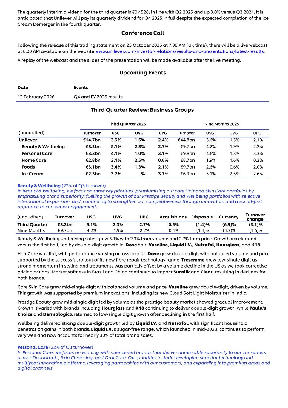 The quarterly interim dividend for the third quarter is €0.4528, in line with Q2 2025 and up 3.0% versus Q3 2024. It is anticipated that Unilever will pay its quarterly dividend for Q4 2025 in full despite the expected completion of the Ice Cream Demerger in the fourth quarter. Conference Call Following the release of this trading statement on 23 October 2025 at 7:00 AM (UK time), there will be a live webcast at 8:00 AM available on the website www.unilever.com/investor-relations/results-and-presentations/latest-results. A replay of the webcast and the slides of the presentation will be made available after the live meeting. Upcoming Events Date Events 12 February 2026 Q4 and FY 2025 results Third Quarter Review: Business Groups Third Quarter 2025 Nine Months 2025 (unaudited) Turnover USG UVG UPG Turnover USG UVG UPG Unilever €14.7bn 3.9% 1.5% 2.4% €44.8bn 3.6% 1.5% 2.1% Beauty & Wellbeing €3.2bn 5.1% 2.3% 2.7% €9.7bn 4.2% 1.9% 2.2% Personal Care €3.3bn 4.1% 1.0% 3.1% €9.8bn 4.6% 1.3% 3.3% Home Care €2.8bn 3.1% 2.5% 0.6% €8.7bn 1.9% 1.6% 0.3% Foods €3.1bn 3.4% 1.3% 2.1% €9.7bn 2.6% 0.6% 2.0% Ice Cream €2.3bn 3.7% –% 3.7% €6.9bn 5.1% 2.5% 2.6% Beauty & Wellbeing (22% of Q3 turnover) In Beauty & Wellbeing, we focus on three key priorities: premiumising our core Hair and Skin Care portfolios by emphasising brand superiority; fuelling the growth of our Prestige Beauty and Wellbeing portfolios with selective international expansion; and, continuing to strengthen our competitiveness through innovation and a social-first approach to consumer engagement. (unaudited) Turnover USG UVG UPG Acquisitions Disposals Currency Turnover change Third Quarter €3.2bn 5.1% 2.3% 2.7% 0.5% (1.4)% (6.9)% (3.1)% Nine Months €9.7bn 4.2% 1.9% 2.2% 0.4% (1.4)% (4.7)% (1.6)% Beauty & Wellbeing underlying sales grew 5.1% with 2.3% from volume and 2.7% from price. Growth accelerated versus the first half, led by double-digit growth in: Dove hair, Vaseline, Liquid I.V., Nutrafol, Hourglass, and K18. Hair Care was flat, with performance varying across brands. Dove grew double-digit with balanced volume and price supported by the successful rollout of its new fibre repair technology range. Tresemme grew low-single digit as strong momentum in styling and treatments was partially offset by a volume decline in the US as we took corrective pricing actions. Market softness in Brazil and China continued to impact Sunsilk and Clear, resulting in declines for both brands. Core Skin Care grew mid-single digit with balanced volume and price. Vaseline grew double-digit, driven by volume. This growth was supported by premium innovations, including its new Cloud Soft Light Moisturiser in India. Prestige Beauty grew mid-single digit led by volume as the prestige beauty market showed gradual improvement. Growth is varied with brands including Hourglass and K18 continuing to deliver double-digit growth, while Paula’s Choice and Dermalogica returned to low-single digit growth after declining in the first half. Wellbeing delivered strong double-digit growth led by Liquid I.V. and Nutrafol, with significant household penetration gains in both brands. Liquid I.V.’s sugar-free range, which launched in mid-2023, continues to perform very well and now accounts for nearly 30% of total brand sales. Personal Care (22% of Q3 turnover) In Personal Care, we focus on winning with science-led brands that deliver unmissable superiority to our consumers across Deodorants, Skin Cleansing, and Oral Care. Our priorities include developing superior technology and multiyear innovation platforms, leveraging partnerships with our customers, and expanding into premium areas and digital channels.