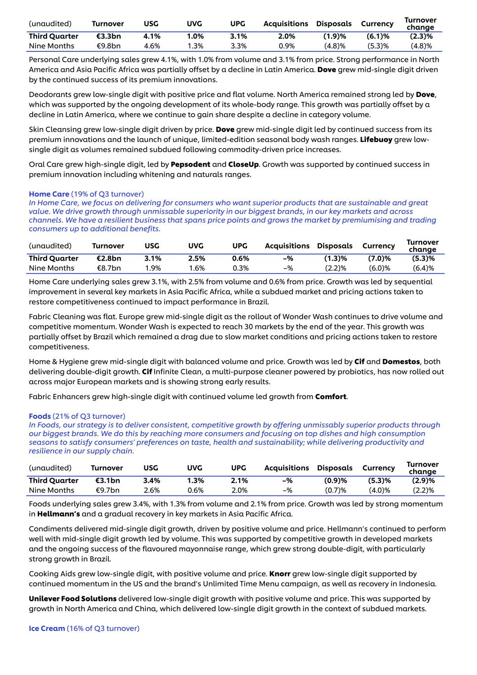 (unaudited) Turnover USG UVG UPG Acquisitions Disposals Currency Turnover change Third Quarter €3.3bn 4.1% 1.0% 3.1% 2.0% (1.9)% (6.1)% (2.3)% Nine Months €9.8bn 4.6% 1.3% 3.3% 0.9% (4.8)% (5.3)% (4.8)% Personal Care underlying sales grew 4.1%, with 1.0% from volume and 3.1% from price. Strong performance in North America and Asia Pacific Africa was partially offset by a decline in Latin America. Dove grew mid-single digit driven by the continued success of its premium innovations. Deodorants grew low-single digit with positive price and flat volume. North America remained strong led by Dove, which was supported by the ongoing development of its whole-body range. This growth was partially offset by a decline in Latin America, where we continue to gain share despite a decline in category volume. Skin Cleansing grew low-single digit driven by price. Dove grew mid-single digit led by continued success from its premium innovations and the launch of unique, limited-edition seasonal body wash ranges. Lifebuoy grew low- single digit as volumes remained subdued following commodity-driven price increases. Oral Care grew high-single digit, led by Pepsodent and CloseUp. Growth was supported by continued success in premium innovation including whitening and naturals ranges. Home Care (19% of Q3 turnover) In Home Care, we focus on delivering for consumers who want superior products that are sustainable and great value. We drive growth through unmissable superiority in our biggest brands, in our key markets and across channels. We have a resilient business that spans price points and grows the market by premiumising and trading consumers up to additional benefits. (unaudited) Turnover USG UVG UPG Acquisitions Disposals Currency Turnover change Third Quarter €2.8bn 3.1% 2.5% 0.6% –% (1.3)% (7.0)% (5.3)% Nine Months €8.7bn 1.9% 1.6% 0.3% –% (2.2)% (6.0)% (6.4)% Home Care underlying sales grew 3.1%, with 2.5% from volume and 0.6% from price. Growth was led by sequential improvement in several key markets in Asia Pacific Africa, while a subdued market and pricing actions taken to restore competitiveness continued to impact performance in Brazil. Fabric Cleaning was flat. Europe grew mid-single digit as the rollout of Wonder Wash continues to drive volume and competitive momentum. Wonder Wash is expected to reach 30 markets by the end of the year. This growth was partially offset by Brazil which remained a drag due to slow market conditions and pricing actions taken to restore competitiveness. Home & Hygiene grew mid-single digit with balanced volume and price. Growth was led by Cif and Domestos, both delivering double-digit growth. Cif Infinite Clean, a multi-purpose cleaner powered by probiotics, has now rolled out across major European markets and is showing strong early results. Fabric Enhancers grew high-single digit with continued volume led growth from Comfort. Foods (21% of Q3 turnover) In Foods, our strategy is to deliver consistent, competitive growth by offering unmissably superior products through our biggest brands. We do this by reaching more consumers and focusing on top dishes and high consumption seasons to satisfy consumers’ preferences on taste, health and sustainability; while delivering productivity and resilience in our supply chain. (unaudited) Turnover USG UVG UPG Acquisitions Disposals Currency Turnover change Third Quarter €3.1bn 3.4% 1.3% 2.1% –% (0.9)% (5.3)% (2.9)% Nine Months €9.7bn 2.6% 0.6% 2.0% –% (0.7)% (4.0)% (2.2)% Foods underlying sales grew 3.4%, with 1.3% from volume and 2.1% from price. Growth was led by strong momentum in Hellmann’s and a gradual recovery in key markets in Asia Pacific Africa. Condiments delivered mid-single digit growth, driven by positive volume and price. Hellmann’s continued to perform well with mid-single digit growth led by volume. This was supported by competitive growth in developed markets and the ongoing success of the flavoured mayonnaise range, which grew strong double-digit, with particularly strong growth in Brazil. Cooking Aids grew low-single digit, with positive volume and price. Knorr grew low-single digit supported by continued momentum in the US and the brand’s Unlimited Time Menu campaign, as well as recovery in Indonesia. Unilever Food Solutions delivered low-single digit growth with positive volume and price. This was supported by growth in North America and China, which delivered low-single digit growth in the context of subdued markets. Ice Cream (16% of Q3 turnover)