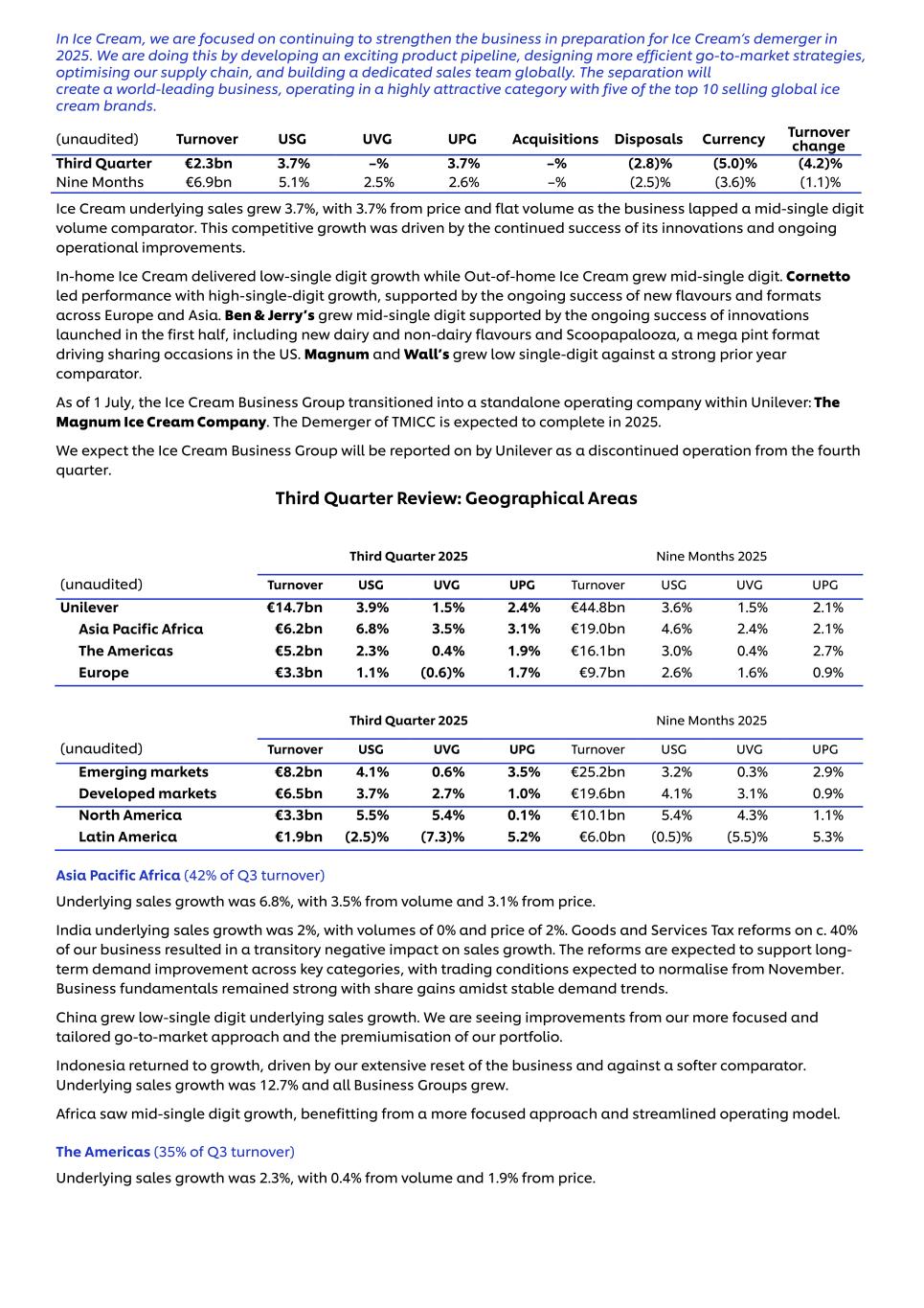 In Ice Cream, we are focused on continuing to strengthen the business in preparation for Ice Cream’s demerger in 2025. We are doing this by developing an exciting product pipeline, designing more efficient go-to-market strategies, optimising our supply chain, and building a dedicated sales team globally. The separation will create a world-leading business, operating in a highly attractive category with five of the top 10 selling global ice cream brands. (unaudited) Turnover USG UVG UPG Acquisitions Disposals Currency Turnover change Third Quarter €2.3bn 3.7% –% 3.7% –% (2.8)% (5.0)% (4.2)% Nine Months €6.9bn 5.1% 2.5% 2.6% –% (2.5)% (3.6)% (1.1)% Ice Cream underlying sales grew 3.7%, with 3.7% from price and flat volume as the business lapped a mid-single digit volume comparator. This competitive growth was driven by the continued success of its innovations and ongoing operational improvements. In-home Ice Cream delivered low-single digit growth while Out-of-home Ice Cream grew mid-single digit. Cornetto led performance with high-single-digit growth, supported by the ongoing success of new flavours and formats across Europe and Asia. Ben & Jerry’s grew mid-single digit supported by the ongoing success of innovations launched in the first half, including new dairy and non-dairy flavours and Scoopapalooza, a mega pint format driving sharing occasions in the US. Magnum and Wall’s grew low single-digit against a strong prior year comparator. As of 1 July, the Ice Cream Business Group transitioned into a standalone operating company within Unilever: The Magnum Ice Cream Company. The Demerger of TMICC is expected to complete in 2025. We expect the Ice Cream Business Group will be reported on by Unilever as a discontinued operation from the fourth quarter. Third Quarter Review: Geographical Areas Third Quarter 2025 Nine Months 2025 (unaudited) Turnover USG UVG UPG Turnover USG UVG UPG Unilever €14.7bn 3.9% 1.5% 2.4% €44.8bn 3.6% 1.5% 2.1% Asia Pacific Africa €6.2bn 6.8% 3.5% 3.1% €19.0bn 4.6% 2.4% 2.1% The Americas €5.2bn 2.3% 0.4% 1.9% €16.1bn 3.0% 0.4% 2.7% Europe €3.3bn 1.1% (0.6)% 1.7% €9.7bn 2.6% 1.6% 0.9% Third Quarter 2025 Nine Months 2025 (unaudited) Turnover USG UVG UPG Turnover USG UVG UPG Emerging markets €8.2bn 4.1% 0.6% 3.5% €25.2bn 3.2% 0.3% 2.9% Developed markets €6.5bn 3.7% 2.7% 1.0% €19.6bn 4.1% 3.1% 0.9% North America €3.3bn 5.5% 5.4% 0.1% €10.1bn 5.4% 4.3% 1.1% Latin America €1.9bn (2.5)% (7.3)% 5.2% €6.0bn (0.5)% (5.5)% 5.3% Asia Pacific Africa (42% of Q3 turnover) Underlying sales growth was 6.8%, with 3.5% from volume and 3.1% from price. India underlying sales growth was 2%, with volumes of 0% and price of 2%. Goods and Services Tax reforms on c. 40% of our business resulted in a transitory negative impact on sales growth. The reforms are expected to support long- term demand improvement across key categories, with trading conditions expected to normalise from November. Business fundamentals remained strong with share gains amidst stable demand trends. China grew low-single digit underlying sales growth. We are seeing improvements from our more focused and tailored go-to-market approach and the premiumisation of our portfolio. Indonesia returned to growth, driven by our extensive reset of the business and against a softer comparator. Underlying sales growth was 12.7% and all Business Groups grew. Africa saw mid-single digit growth, benefitting from a more focused approach and streamlined operating model. The Americas (35% of Q3 turnover) Underlying sales growth was 2.3%, with 0.4% from volume and 1.9% from price.