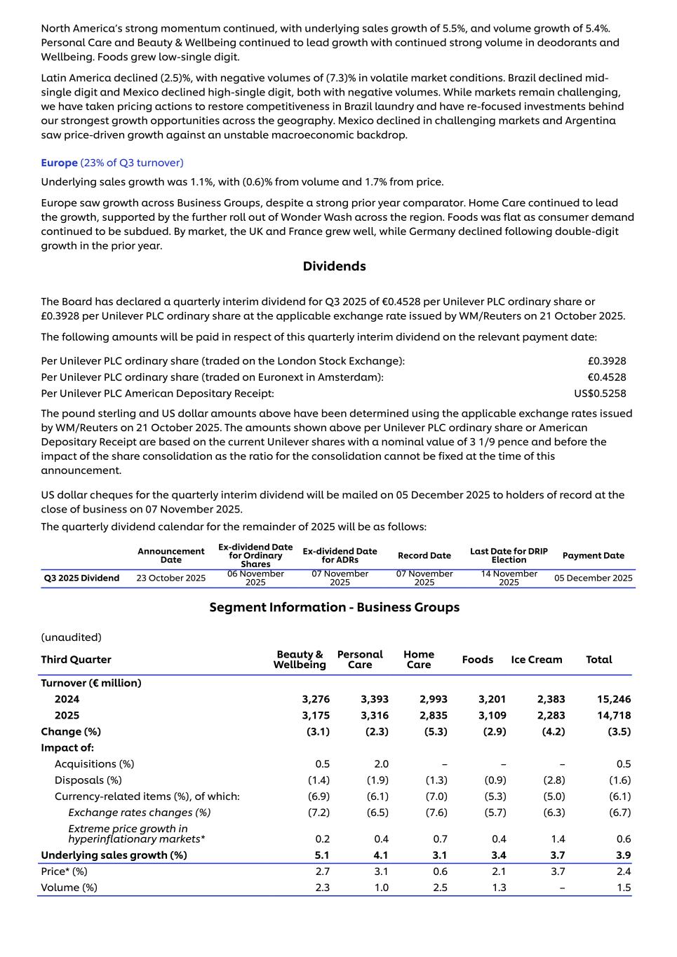 North America’s strong momentum continued, with underlying sales growth of 5.5%, and volume growth of 5.4%. Personal Care and Beauty & Wellbeing continued to lead growth with continued strong volume in deodorants and Wellbeing. Foods grew low-single digit. Latin America declined (2.5)%, with negative volumes of (7.3)% in volatile market conditions. Brazil declined mid- single digit and Mexico declined high-single digit, both with negative volumes. While markets remain challenging, we have taken pricing actions to restore competitiveness in Brazil laundry and have re-focused investments behind our strongest growth opportunities across the geography. Mexico declined in challenging markets and Argentina saw price-driven growth against an unstable macroeconomic backdrop. Europe (23% of Q3 turnover) Underlying sales growth was 1.1%, with (0.6)% from volume and 1.7% from price. Europe saw growth across Business Groups, despite a strong prior year comparator. Home Care continued to lead the growth, supported by the further roll out of Wonder Wash across the region. Foods was flat as consumer demand continued to be subdued. By market, the UK and France grew well, while Germany declined following double-digit growth in the prior year. Dividends The Board has declared a quarterly interim dividend for Q3 2025 of €0.4528 per Unilever PLC ordinary share or £0.3928 per Unilever PLC ordinary share at the applicable exchange rate issued by WM/Reuters on 21 October 2025. The following amounts will be paid in respect of this quarterly interim dividend on the relevant payment date: Per Unilever PLC ordinary share (traded on the London Stock Exchange): £0.3928 Per Unilever PLC ordinary share (traded on Euronext in Amsterdam): €0.4528 Per Unilever PLC American Depositary Receipt: US$0.5258 The pound sterling and US dollar amounts above have been determined using the applicable exchange rates issued by WM/Reuters on 21 October 2025. The amounts shown above per Unilever PLC ordinary share or American Depositary Receipt are based on the current Unilever shares with a nominal value of 3 1/9 pence and before the impact of the share consolidation as the ratio for the consolidation cannot be fixed at the time of this announcement. US dollar cheques for the quarterly interim dividend will be mailed on 05 December 2025 to holders of record at the close of business on 07 November 2025. The quarterly dividend calendar for the remainder of 2025 will be as follows: Announcement Date Ex-dividend Date for Ordinary Shares Ex-dividend Date for ADRs Record Date Last Date for DRIP Election Payment Date Q3 2025 Dividend 23 October 2025 06 November 2025 07 November 2025 07 November 2025 14 November 2025 05 December 2025 Segment Information - Business Groups (unaudited) Third Quarter Beauty & Wellbeing Personal Care Home Care Foods Ice Cream Total Turnover (€ million) 2024 3,276 3,393 2,993 3,201 2,383 15,246 2025 3,175 3,316 2,835 3,109 2,283 14,718 Change (%) (3.1) (2.3) (5.3) (2.9) (4.2) (3.5) Impact of: Acquisitions (%) 0.5 2.0 – – – 0.5 Disposals (%) (1.4) (1.9) (1.3) (0.9) (2.8) (1.6) Currency-related items (%), of which: (6.9) (6.1) (7.0) (5.3) (5.0) (6.1) Exchange rates changes (%) (7.2) (6.5) (7.6) (5.7) (6.3) (6.7) Extreme price growth in hyperinflationary markets* 0.2 0.4 0.7 0.4 1.4 0.6 Underlying sales growth (%) 5.1 4.1 3.1 3.4 3.7 3.9 Price* (%) 2.7 3.1 0.6 2.1 3.7 2.4 Volume (%) 2.3 1.0 2.5 1.3 – 1.5