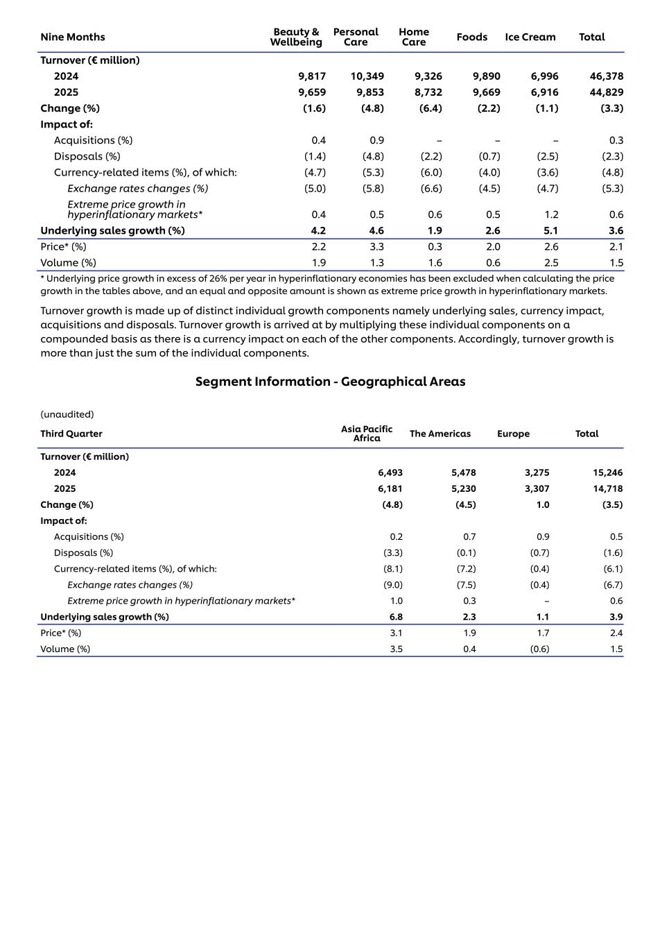Nine Months Beauty & Wellbeing Personal Care Home Care Foods Ice Cream Total Turnover (€ million) 2024 9,817 10,349 9,326 9,890 6,996 46,378 2025 9,659 9,853 8,732 9,669 6,916 44,829 Change (%) (1.6) (4.8) (6.4) (2.2) (1.1) (3.3) Impact of: Acquisitions (%) 0.4 0.9 – – – 0.3 Disposals (%) (1.4) (4.8) (2.2) (0.7) (2.5) (2.3) Currency-related items (%), of which: (4.7) (5.3) (6.0) (4.0) (3.6) (4.8) Exchange rates changes (%) (5.0) (5.8) (6.6) (4.5) (4.7) (5.3) Extreme price growth in hyperinflationary markets* 0.4 0.5 0.6 0.5 1.2 0.6 Underlying sales growth (%) 4.2 4.6 1.9 2.6 5.1 3.6 Price* (%) 2.2 3.3 0.3 2.0 2.6 2.1 Volume (%) 1.9 1.3 1.6 0.6 2.5 1.5 * Underlying price growth in excess of 26% per year in hyperinflationary economies has been excluded when calculating the price growth in the tables above, and an equal and opposite amount is shown as extreme price growth in hyperinflationary markets. Turnover growth is made up of distinct individual growth components namely underlying sales, currency impact, acquisitions and disposals. Turnover growth is arrived at by multiplying these individual components on a compounded basis as there is a currency impact on each of the other components. Accordingly, turnover growth is more than just the sum of the individual components. Segment Information - Geographical Areas (unaudited) Third Quarter Asia Pacific Africa The Americas Europe Total Turnover (€ million) 2024 6,493 5,478 3,275 15,246 2025 6,181 5,230 3,307 14,718 Change (%) (4.8) (4.5) 1.0 (3.5) Impact of: Acquisitions (%) 0.2 0.7 0.9 0.5 Disposals (%) (3.3) (0.1) (0.7) (1.6) Currency-related items (%), of which: (8.1) (7.2) (0.4) (6.1) Exchange rates changes (%) (9.0) (7.5) (0.4) (6.7) Extreme price growth in hyperinflationary markets* 1.0 0.3 – 0.6 Underlying sales growth (%) 6.8 2.3 1.1 3.9 Price* (%) 3.1 1.9 1.7 2.4 Volume (%) 3.5 0.4 (0.6) 1.5