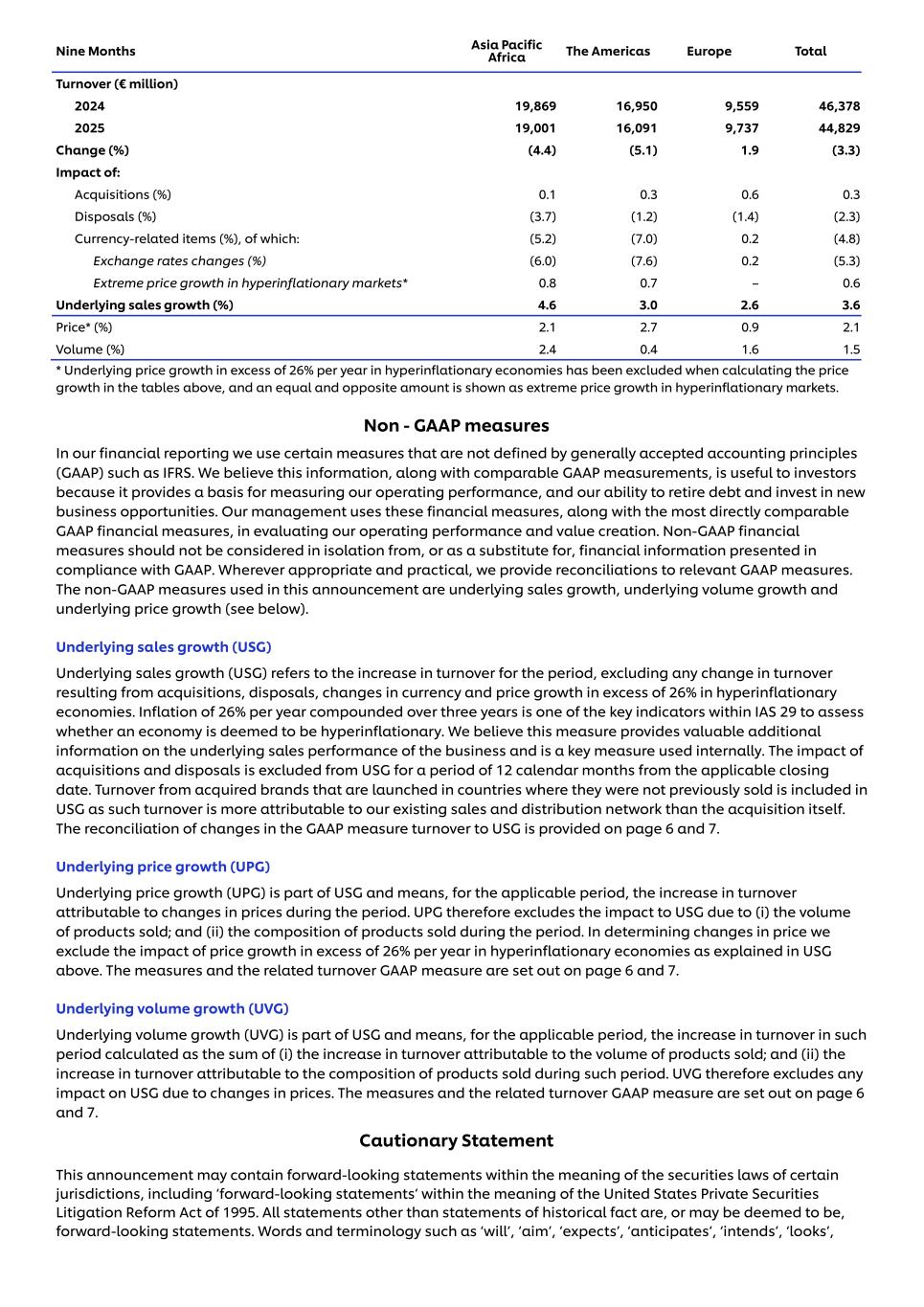 Nine Months Asia Pacific Africa The Americas Europe Total Turnover (€ million) 2024 19,869 16,950 9,559 46,378 2025 19,001 16,091 9,737 44,829 Change (%) (4.4) (5.1) 1.9 (3.3) Impact of: Acquisitions (%) 0.1 0.3 0.6 0.3 Disposals (%) (3.7) (1.2) (1.4) (2.3) Currency-related items (%), of which: (5.2) (7.0) 0.2 (4.8) Exchange rates changes (%) (6.0) (7.6) 0.2 (5.3) Extreme price growth in hyperinflationary markets* 0.8 0.7 – 0.6 Underlying sales growth (%) 4.6 3.0 2.6 3.6 Price* (%) 2.1 2.7 0.9 2.1 Volume (%) 2.4 0.4 1.6 1.5 * Underlying price growth in excess of 26% per year in hyperinflationary economies has been excluded when calculating the price growth in the tables above, and an equal and opposite amount is shown as extreme price growth in hyperinflationary markets. Non - GAAP measures In our financial reporting we use certain measures that are not defined by generally accepted accounting principles (GAAP) such as IFRS. We believe this information, along with comparable GAAP measurements, is useful to investors because it provides a basis for measuring our operating performance, and our ability to retire debt and invest in new business opportunities. Our management uses these financial measures, along with the most directly comparable GAAP financial measures, in evaluating our operating performance and value creation. Non-GAAP financial measures should not be considered in isolation from, or as a substitute for, financial information presented in compliance with GAAP. Wherever appropriate and practical, we provide reconciliations to relevant GAAP measures. The non-GAAP measures used in this announcement are underlying sales growth, underlying volume growth and underlying price growth (see below). Underlying sales growth (USG) Underlying sales growth (USG) refers to the increase in turnover for the period, excluding any change in turnover resulting from acquisitions, disposals, changes in currency and price growth in excess of 26% in hyperinflationary economies. Inflation of 26% per year compounded over three years is one of the key indicators within IAS 29 to assess whether an economy is deemed to be hyperinflationary. We believe this measure provides valuable additional information on the underlying sales performance of the business and is a key measure used internally. The impact of acquisitions and disposals is excluded from USG for a period of 12 calendar months from the applicable closing date. Turnover from acquired brands that are launched in countries where they were not previously sold is included in USG as such turnover is more attributable to our existing sales and distribution network than the acquisition itself. The reconciliation of changes in the GAAP measure turnover to USG is provided on page 6 and 7. Underlying price growth (UPG) Underlying price growth (UPG) is part of USG and means, for the applicable period, the increase in turnover attributable to changes in prices during the period. UPG therefore excludes the impact to USG due to (i) the volume of products sold; and (ii) the composition of products sold during the period. In determining changes in price we exclude the impact of price growth in excess of 26% per year in hyperinflationary economies as explained in USG above. The measures and the related turnover GAAP measure are set out on page 6 and 7. Underlying volume growth (UVG) Underlying volume growth (UVG) is part of USG and means, for the applicable period, the increase in turnover in such period calculated as the sum of (i) the increase in turnover attributable to the volume of products sold; and (ii) the increase in turnover attributable to the composition of products sold during such period. UVG therefore excludes any impact on USG due to changes in prices. The measures and the related turnover GAAP measure are set out on page 6 and 7. Cautionary Statement This announcement may contain forward-looking statements within the meaning of the securities laws of certain jurisdictions, including ‘forward-looking statements’ within the meaning of the United States Private Securities Litigation Reform Act of 1995. All statements other than statements of historical fact are, or may be deemed to be, forward-looking statements. Words and terminology such as ‘will’, ‘aim’, ‘expects’, ‘anticipates’, ‘intends’, ‘looks’,