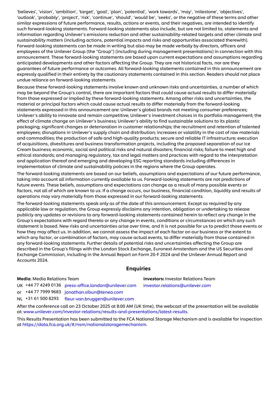 ‘believes’, ‘vision’, ‘ambition’, ‘target’, ‘goal’, ‘plan’, ‘potential’, ‘work towards’, ‘may’, ‘milestone’, ‘objectives’, ‘outlook’, ‘probably’, ‘project’, ‘risk’, ‘continue’, ‘should’, ‘would be’, ‘seeks’, or the negative of these terms and other similar expressions of future performance, results, actions or events, and their negatives, are intended to identify such forward-looking statements. Forward-looking statements also include, but are not limited to, statements and information regarding Unilever’s emissions reduction and other sustainability-related targets and other climate and sustainability matters (including actions, potential impacts and risks and opportunities associated therewith). Forward-looking statements can be made in writing but also may be made verbally by directors, officers and employees of the Unilever Group (the “Group”) (including during management presentations) in connection with this announcement. These forward-looking statements are based upon current expectations and assumptions regarding anticipated developments and other factors affecting the Group. They are not historical facts, nor are they guarantees of future performance or outcomes. All forward-looking statements contained in this announcement are expressly qualified in their entirety by the cautionary statements contained in this section. Readers should not place undue reliance on forward-looking statements. Because these forward-looking statements involve known and unknown risks and uncertainties, a number of which may be beyond the Group’s control, there are important factors that could cause actual results to differ materially from those expressed or implied by these forward-looking statements. Among other risks and uncertainties, the material or principal factors which could cause actual results to differ materially from the forward-looking statements expressed in this announcement are: Unilever’s global brands not meeting consumer preferences; Unilever’s ability to innovate and remain competitive; Unilever’s investment choices in its portfolio management; the effect of climate change on Unilever’s business; Unilever’s ability to find sustainable solutions to its plastic packaging; significant changes or deterioration in customer relationships; the recruitment and retention of talented employees; disruptions in Unilever’s supply chain and distribution; increases or volatility in the cost of raw materials and commodities; the production of safe and high-quality products; secure and reliable IT infrastructure; execution of acquisitions, divestitures and business transformation projects, including the proposed separation of our Ice Cream business; economic, social and political risks and natural disasters; financial risks; failure to meet high and ethical standards; and managing regulatory, tax and legal matters and practices with regard to the interpretation and application thereof and emerging and developing ESG reporting standards including differences in implementation of climate and sustainability policies in the regions where the Group operates. The forward-looking statements are based on our beliefs, assumptions and expectations of our future performance, taking into account all information currently available to us. Forward-looking statements are not predictions of future events. These beliefs, assumptions and expectations can change as a result of many possible events or factors, not all of which are known to us. If a change occurs, our business, financial condition, liquidity and results of operations may vary materially from those expressed in our forward-looking statements. The forward-looking statements speak only as of the date of this announcement. Except as required by any applicable law or regulation, the Group expressly disclaims any intention, obligation or undertaking to release publicly any updates or revisions to any forward-looking statements contained herein to reflect any change in the Group’s expectations with regard thereto or any change in events, conditions or circumstances on which any such statement is based. New risks and uncertainties arise over time, and it is not possible for us to predict those events or how they may affect us. In addition, we cannot assess the impact of each factor on our business or the extent to which any factor, or combination of factors, may cause actual events, to differ materially from those contained in any forward-looking statements. Further details of potential risks and uncertainties affecting the Group are described in the Group’s filings with the London Stock Exchange, Euronext Amsterdam and the US Securities and Exchange Commission, including in the Annual Report on Form 20-F 2024 and the Unilever Annual Report and Accounts 2024. Enquiries Media: Media Relations Team Investors: Investor Relations Team UK +44 77 4249 0136 press-office.london@unilever.com investor.relations@unilever.com or +44 77 7999 9683 jonathan.sibun@teneo.com NL +31 61 500 8293 fleur-van.bruggen@unilever.com After the conference call on 23 October 2025 at 8:00 AM (UK time), the webcast of the presentation will be available at: www.unilever.com/investor-relations/results-and-presentations/latest-results. This Results Presentation has been submitted to the FCA National Storage Mechanism and is available for inspection at https://data.fca.org.uk/#/nsm/nationalstoragemechanism.