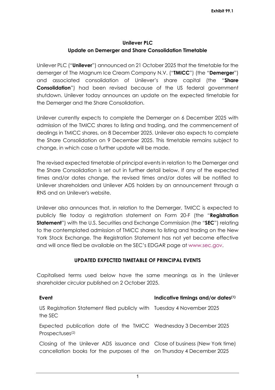 1 Unilever PLC Update on Demerger and Share Consolidation Timetable Unilever PLC (“Unilever”) announced on 21 October 2025 that the timetable for the demerger of The Magnum Ice Cream Company N.V. (“TMICC”) (the “Demerger”) and associated consolidation of Unilever’s share capital (the “Share Consolidation”) had been revised because of the US federal government shutdown. Unilever today announces an update on the expected timetable for the Demerger and the Share Consolidation. Unilever currently expects to complete the Demerger on 6 December 2025 with admission of the TMICC shares to listing and trading, and the commencement of dealings in TMICC shares, on 8 December 2025. Unilever also expects to complete the Share Consolidation on 9 December 2025. This timetable remains subject to change, in which case a further update will be made. The revised expected timetable of principal events in relation to the Demerger and the Share Consolidation is set out in further detail below. If any of the expected times and/or dates change, the revised times and/or dates will be notified to Unilever shareholders and Unilever ADS holders by an announcement through a RNS and on Unilever's website. Unilever also announces that, in relation to the Demerger, TMICC is expected to publicly file today a registration statement on Form 20-F (the “Registration Statement”) with the U.S. Securities and Exchange Commission (the “SEC”) relating to the contemplated admission of TMICC shares to listing and trading on the New York Stock Exchange. The Registration Statement has not yet become effective and will once filed be available on the SEC’s EDGAR page at www.sec.gov. UPDATED EXPECTED TIMETABLE OF PRINCIPAL EVENTS Capitalised terms used below have the same meanings as in the Unilever shareholder circular published on 2 October 2025. Event Indicative timings and/or dates(1) US Registration Statement filed publicly with the SEC Tuesday 4 November 2025 Expected publication date of the TMICC Prospectuses(2) Wednesday 3 December 2025 Closing of the Unilever ADS issuance and cancellation books for the purposes of the Close of business (New York time) on Thursday 4 December 2025