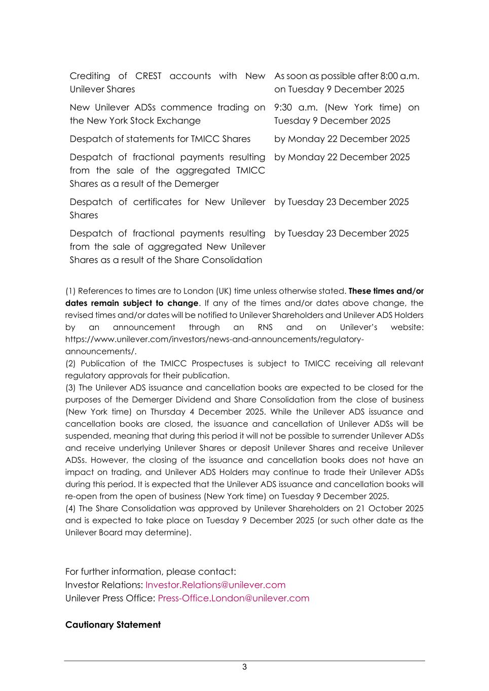3 Crediting of CREST accounts with New Unilever Shares As soon as possible after 8:00 a.m. on Tuesday 9 December 2025 New Unilever ADSs commence trading on the New York Stock Exchange 9:30 a.m. (New York time) on Tuesday 9 December 2025 Despatch of statements for TMICC Shares by Monday 22 December 2025 Despatch of fractional payments resulting from the sale of the aggregated TMICC Shares as a result of the Demerger by Monday 22 December 2025 Despatch of certificates for New Unilever Shares by Tuesday 23 December 2025 Despatch of fractional payments resulting from the sale of aggregated New Unilever Shares as a result of the Share Consolidation by Tuesday 23 December 2025 (1) References to times are to London (UK) time unless otherwise stated. These times and/or dates remain subject to change. If any of the times and/or dates above change, the revised times and/or dates will be notified to Unilever Shareholders and Unilever ADS Holders by an announcement through an RNS and on Unilever’s website: https://www.unilever.com/investors/news-and-announcements/regulatory- announcements/. (2) Publication of the TMICC Prospectuses is subject to TMICC receiving all relevant regulatory approvals for their publication. (3) The Unilever ADS issuance and cancellation books are expected to be closed for the purposes of the Demerger Dividend and Share Consolidation from the close of business (New York time) on Thursday 4 December 2025. While the Unilever ADS issuance and cancellation books are closed, the issuance and cancellation of Unilever ADSs will be suspended, meaning that during this period it will not be possible to surrender Unilever ADSs and receive underlying Unilever Shares or deposit Unilever Shares and receive Unilever ADSs. However, the closing of the issuance and cancellation books does not have an impact on trading, and Unilever ADS Holders may continue to trade their Unilever ADSs during this period. It is expected that the Unilever ADS issuance and cancellation books will re-open from the open of business (New York time) on Tuesday 9 December 2025. (4) The Share Consolidation was approved by Unilever Shareholders on 21 October 2025 and is expected to take place on Tuesday 9 December 2025 (or such other date as the Unilever Board may determine). For further information, please contact: Investor Relations: Investor.Relations@unilever.com Unilever Press Office: Press-Office.London@unilever.com Cautionary Statement