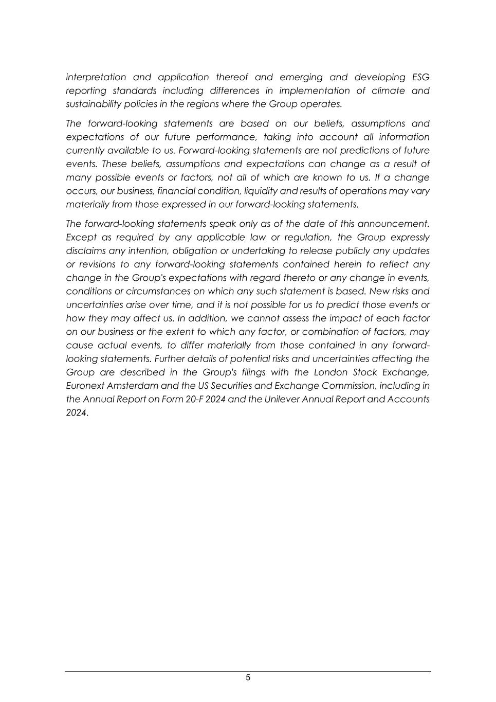 5 interpretation and application thereof and emerging and developing ESG reporting standards including differences in implementation of climate and sustainability policies in the regions where the Group operates. The forward-looking statements are based on our beliefs, assumptions and expectations of our future performance, taking into account all information currently available to us. Forward-looking statements are not predictions of future events. These beliefs, assumptions and expectations can change as a result of many possible events or factors, not all of which are known to us. If a change occurs, our business, financial condition, liquidity and results of operations may vary materially from those expressed in our forward-looking statements. The forward-looking statements speak only as of the date of this announcement. Except as required by any applicable law or regulation, the Group expressly disclaims any intention, obligation or undertaking to release publicly any updates or revisions to any forward-looking statements contained herein to reflect any change in the Group's expectations with regard thereto or any change in events, conditions or circumstances on which any such statement is based. New risks and uncertainties arise over time, and it is not possible for us to predict those events or how they may affect us. In addition, we cannot assess the impact of each factor on our business or the extent to which any factor, or combination of factors, may cause actual events, to differ materially from those contained in any forward- looking statements. Further details of potential risks and uncertainties affecting the Group are described in the Group's filings with the London Stock Exchange, Euronext Amsterdam and the US Securities and Exchange Commission, including in the Annual Report on Form 20-F 2024 and the Unilever Annual Report and Accounts 2024.