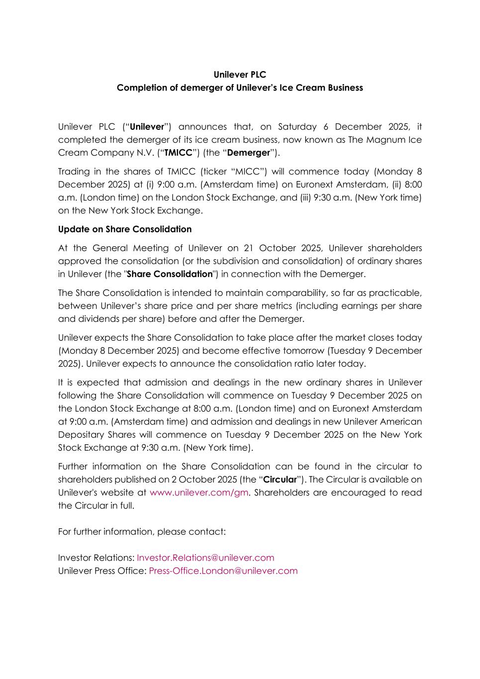 Unilever PLC Completion of demerger of Unilever’s Ice Cream Business Unilever PLC (“Unilever”) announces that, on Saturday 6 December 2025, it completed the demerger of its ice cream business, now known as The Magnum Ice Cream Company N.V. (“TMICC”) (the “Demerger”). Trading in the shares of TMICC (ticker “MICC”) will commence today (Monday 8 December 2025) at (i) 9:00 a.m. (Amsterdam time) on Euronext Amsterdam, (ii) 8:00 a.m. (London time) on the London Stock Exchange, and (iii) 9:30 a.m. (New York time) on the New York Stock Exchange. Update on Share Consolidation At the General Meeting of Unilever on 21 October 2025, Unilever shareholders approved the consolidation (or the subdivision and consolidation) of ordinary shares in Unilever (the "Share Consolidation") in connection with the Demerger. The Share Consolidation is intended to maintain comparability, so far as practicable, between Unilever’s share price and per share metrics (including earnings per share and dividends per share) before and after the Demerger. Unilever expects the Share Consolidation to take place after the market closes today (Monday 8 December 2025) and become effective tomorrow (Tuesday 9 December 2025). Unilever expects to announce the consolidation ratio later today. It is expected that admission and dealings in the new ordinary shares in Unilever following the Share Consolidation will commence on Tuesday 9 December 2025 on the London Stock Exchange at 8:00 a.m. (London time) and on Euronext Amsterdam at 9:00 a.m. (Amsterdam time) and admission and dealings in new Unilever American Depositary Shares will commence on Tuesday 9 December 2025 on the New York Stock Exchange at 9:30 a.m. (New York time). Further information on the Share Consolidation can be found in the circular to shareholders published on 2 October 2025 (the “Circular”). The Circular is available on Unilever's website at www.unilever.com/gm. Shareholders are encouraged to read the Circular in full. For further information, please contact: Investor Relations: Investor.Relations@unilever.com Unilever Press Office: Press-Office.London@unilever.com