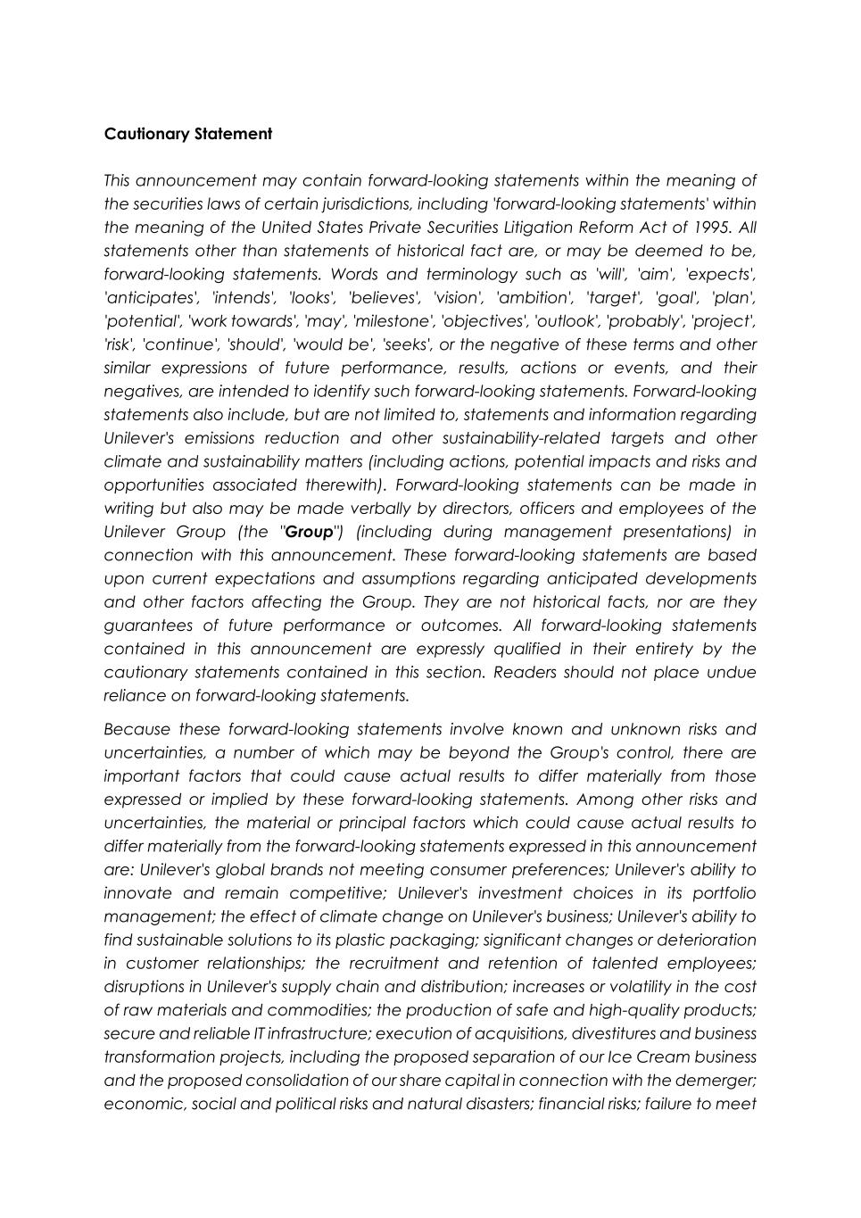 Cautionary Statement This announcement may contain forward-looking statements within the meaning of the securities laws of certain jurisdictions, including 'forward-looking statements' within the meaning of the United States Private Securities Litigation Reform Act of 1995. All statements other than statements of historical fact are, or may be deemed to be, forward-looking statements. Words and terminology such as 'will', 'aim', 'expects', 'anticipates', 'intends', 'looks', 'believes', 'vision', 'ambition', 'target', 'goal', 'plan', 'potential', 'work towards', 'may', 'milestone', 'objectives', 'outlook', 'probably', 'project', 'risk', 'continue', 'should', 'would be', 'seeks', or the negative of these terms and other similar expressions of future performance, results, actions or events, and their negatives, are intended to identify such forward-looking statements. Forward-looking statements also include, but are not limited to, statements and information regarding Unilever's emissions reduction and other sustainability-related targets and other climate and sustainability matters (including actions, potential impacts and risks and opportunities associated therewith). Forward-looking statements can be made in writing but also may be made verbally by directors, officers and employees of the Unilever Group (the "Group") (including during management presentations) in connection with this announcement. These forward-looking statements are based upon current expectations and assumptions regarding anticipated developments and other factors affecting the Group. They are not historical facts, nor are they guarantees of future performance or outcomes. All forward-looking statements contained in this announcement are expressly qualified in their entirety by the cautionary statements contained in this section. Readers should not place undue reliance on forward-looking statements. Because these forward-looking statements involve known and unknown risks and uncertainties, a number of which may be beyond the Group's control, there are important factors that could cause actual results to differ materially from those expressed or implied by these forward-looking statements. Among other risks and uncertainties, the material or principal factors which could cause actual results to differ materially from the forward-looking statements expressed in this announcement are: Unilever's global brands not meeting consumer preferences; Unilever's ability to innovate and remain competitive; Unilever's investment choices in its portfolio management; the effect of climate change on Unilever's business; Unilever's ability to find sustainable solutions to its plastic packaging; significant changes or deterioration in customer relationships; the recruitment and retention of talented employees; disruptions in Unilever's supply chain and distribution; increases or volatility in the cost of raw materials and commodities; the production of safe and high-quality products; secure and reliable IT infrastructure; execution of acquisitions, divestitures and business transformation projects, including the proposed separation of our Ice Cream business and the proposed consolidation of our share capital in connection with the demerger; economic, social and political risks and natural disasters; financial risks; failure to meet