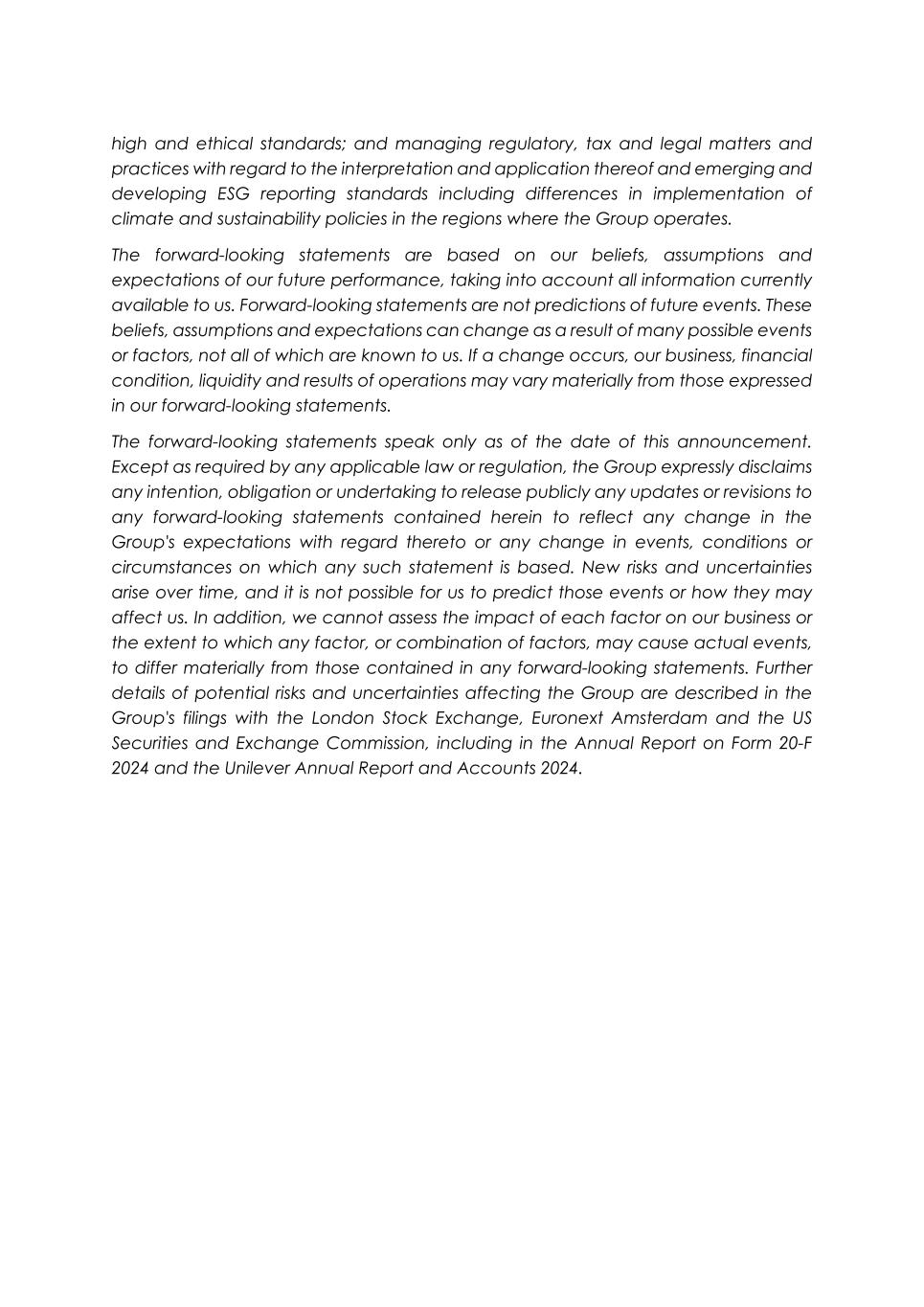 high and ethical standards; and managing regulatory, tax and legal matters and practices with regard to the interpretation and application thereof and emerging and developing ESG reporting standards including differences in implementation of climate and sustainability policies in the regions where the Group operates. The forward-looking statements are based on our beliefs, assumptions and expectations of our future performance, taking into account all information currently available to us. Forward-looking statements are not predictions of future events. These beliefs, assumptions and expectations can change as a result of many possible events or factors, not all of which are known to us. If a change occurs, our business, financial condition, liquidity and results of operations may vary materially from those expressed in our forward-looking statements. The forward-looking statements speak only as of the date of this announcement. Except as required by any applicable law or regulation, the Group expressly disclaims any intention, obligation or undertaking to release publicly any updates or revisions to any forward-looking statements contained herein to reflect any change in the Group's expectations with regard thereto or any change in events, conditions or circumstances on which any such statement is based. New risks and uncertainties arise over time, and it is not possible for us to predict those events or how they may affect us. In addition, we cannot assess the impact of each factor on our business or the extent to which any factor, or combination of factors, may cause actual events, to differ materially from those contained in any forward-looking statements. Further details of potential risks and uncertainties affecting the Group are described in the Group's filings with the London Stock Exchange, Euronext Amsterdam and the US Securities and Exchange Commission, including in the Annual Report on Form 20-F 2024 and the Unilever Annual Report and Accounts 2024.