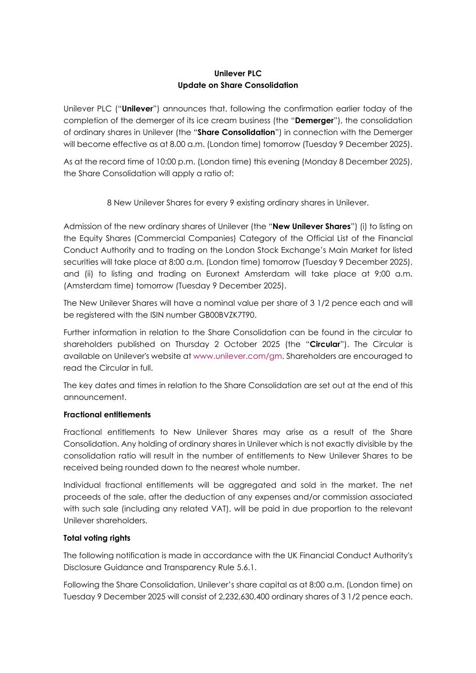 Unilever PLC Update on Share Consolidation Unilever PLC (“Unilever”) announces that, following the confirmation earlier today of the completion of the demerger of its ice cream business (the “Demerger”), the consolidation of ordinary shares in Unilever (the “Share Consolidation”) in connection with the Demerger will become effective as at 8.00 a.m. (London time) tomorrow (Tuesday 9 December 2025). As at the record time of 10:00 p.m. (London time) this evening (Monday 8 December 2025), the Share Consolidation will apply a ratio of: 8 New Unilever Shares for every 9 existing ordinary shares in Unilever. Admission of the new ordinary shares of Unilever (the “New Unilever Shares”) (i) to listing on the Equity Shares (Commercial Companies) Category of the Official List of the Financial Conduct Authority and to trading on the London Stock Exchange’s Main Market for listed securities will take place at 8:00 a.m. (London time) tomorrow (Tuesday 9 December 2025), and (ii) to listing and trading on Euronext Amsterdam will take place at 9:00 a.m. (Amsterdam time) tomorrow (Tuesday 9 December 2025). The New Unilever Shares will have a nominal value per share of 3 1/2 pence each and will be registered with the ISIN number GB00BVZK7T90. Further information in relation to the Share Consolidation can be found in the circular to shareholders published on Thursday 2 October 2025 (the “Circular”). The Circular is available on Unilever's website at www.unilever.com/gm. Shareholders are encouraged to read the Circular in full. The key dates and times in relation to the Share Consolidation are set out at the end of this announcement. Fractional entitlements Fractional entitlements to New Unilever Shares may arise as a result of the Share Consolidation. Any holding of ordinary shares in Unilever which is not exactly divisible by the consolidation ratio will result in the number of entitlements to New Unilever Shares to be received being rounded down to the nearest whole number. Individual fractional entitlements will be aggregated and sold in the market. The net proceeds of the sale, after the deduction of any expenses and/or commission associated with such sale (including any related VAT), will be paid in due proportion to the relevant Unilever shareholders. Total voting rights The following notification is made in accordance with the UK Financial Conduct Authority's Disclosure Guidance and Transparency Rule 5.6.1. Following the Share Consolidation, Unilever’s share capital as at 8:00 a.m. (London time) on Tuesday 9 December 2025 will consist of 2,232,630,400 ordinary shares of 3 1/2 pence each.