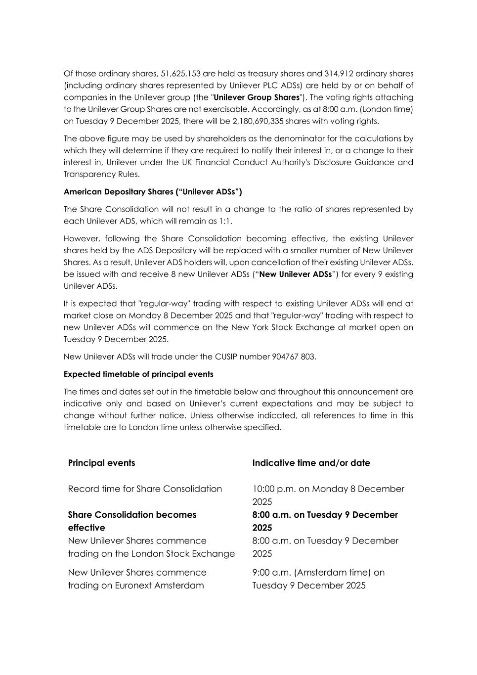 Of those ordinary shares, 51,625,153 are held as treasury shares and 314,912 ordinary shares (including ordinary shares represented by Unilever PLC ADSs) are held by or on behalf of companies in the Unilever group (the "Unilever Group Shares"). The voting rights attaching to the Unilever Group Shares are not exercisable. Accordingly, as at 8:00 a.m. (London time) on Tuesday 9 December 2025, there will be 2,180,690,335 shares with voting rights. The above figure may be used by shareholders as the denominator for the calculations by which they will determine if they are required to notify their interest in, or a change to their interest in, Unilever under the UK Financial Conduct Authority's Disclosure Guidance and Transparency Rules. American Depositary Shares (“Unilever ADSs”) The Share Consolidation will not result in a change to the ratio of shares represented by each Unilever ADS, which will remain as 1:1. However, following the Share Consolidation becoming effective, the existing Unilever shares held by the ADS Depositary will be replaced with a smaller number of New Unilever Shares. As a result, Unilever ADS holders will, upon cancellation of their existing Unilever ADSs, be issued with and receive 8 new Unilever ADSs (“New Unilever ADSs”) for every 9 existing Unilever ADSs. It is expected that "regular-way" trading with respect to existing Unilever ADSs will end at market close on Monday 8 December 2025 and that "regular-way" trading with respect to new Unilever ADSs will commence on the New York Stock Exchange at market open on Tuesday 9 December 2025. New Unilever ADSs will trade under the CUSIP number 904767 803. Expected timetable of principal events The times and dates set out in the timetable below and throughout this announcement are indicative only and based on Unilever’s current expectations and may be subject to change without further notice. Unless otherwise indicated, all references to time in this timetable are to London time unless otherwise specified. Principal events Indicative time and/or date Record time for Share Consolidation 10:00 p.m. on Monday 8 December 2025 Share Consolidation becomes effective 8:00 a.m. on Tuesday 9 December 2025 New Unilever Shares commence trading on the London Stock Exchange 8:00 a.m. on Tuesday 9 December 2025 New Unilever Shares commence trading on Euronext Amsterdam 9:00 a.m. (Amsterdam time) on Tuesday 9 December 2025