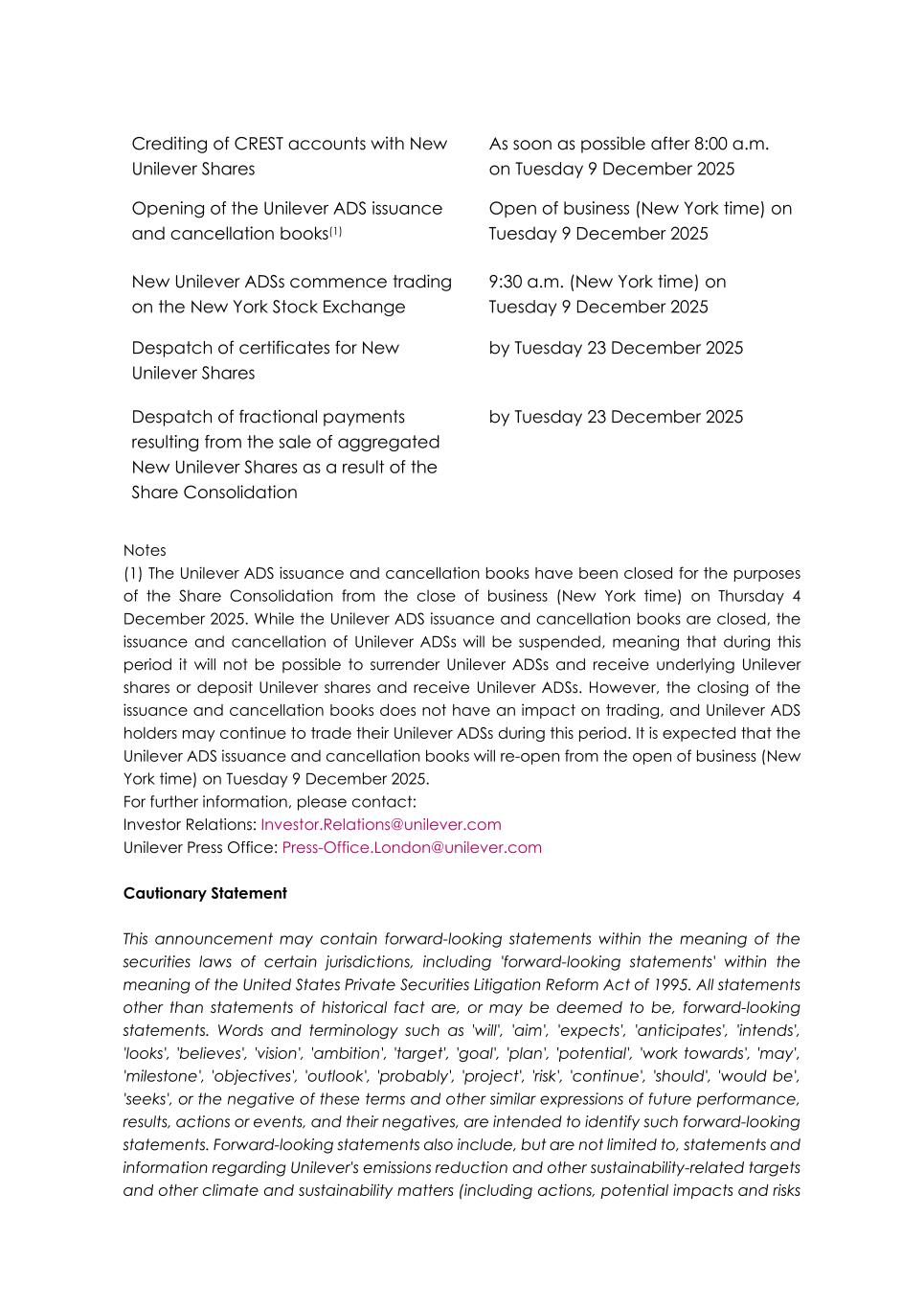 Crediting of CREST accounts with New Unilever Shares As soon as possible after 8:00 a.m. on Tuesday 9 December 2025 Opening of the Unilever ADS issuance and cancellation books(1) Open of business (New York time) on Tuesday 9 December 2025 New Unilever ADSs commence trading on the New York Stock Exchange 9:30 a.m. (New York time) on Tuesday 9 December 2025 Despatch of certificates for New Unilever Shares by Tuesday 23 December 2025 Despatch of fractional payments resulting from the sale of aggregated New Unilever Shares as a result of the Share Consolidation by Tuesday 23 December 2025 Notes (1) The Unilever ADS issuance and cancellation books have been closed for the purposes of the Share Consolidation from the close of business (New York time) on Thursday 4 December 2025. While the Unilever ADS issuance and cancellation books are closed, the issuance and cancellation of Unilever ADSs will be suspended, meaning that during this period it will not be possible to surrender Unilever ADSs and receive underlying Unilever shares or deposit Unilever shares and receive Unilever ADSs. However, the closing of the issuance and cancellation books does not have an impact on trading, and Unilever ADS holders may continue to trade their Unilever ADSs during this period. It is expected that the Unilever ADS issuance and cancellation books will re-open from the open of business (New York time) on Tuesday 9 December 2025. For further information, please contact: Investor Relations: Investor.Relations@unilever.com Unilever Press Office: Press-Office.London@unilever.com Cautionary Statement This announcement may contain forward-looking statements within the meaning of the securities laws of certain jurisdictions, including 'forward-looking statements' within the meaning of the United States Private Securities Litigation Reform Act of 1995. All statements other than statements of historical fact are, or may be deemed to be, forward-looking statements. Words and terminology such as 'will', 'aim', 'expects', 'anticipates', 'intends', 'looks', 'believes', 'vision', 'ambition', 'target', 'goal', 'plan', 'potential', 'work towards', 'may', 'milestone', 'objectives', 'outlook', 'probably', 'project', 'risk', 'continue', 'should', 'would be', 'seeks', or the negative of these terms and other similar expressions of future performance, results, actions or events, and their negatives, are intended to identify such forward-looking statements. Forward-looking statements also include, but are not limited to, statements and information regarding Unilever's emissions reduction and other sustainability-related targets and other climate and sustainability matters (including actions, potential impacts and risks