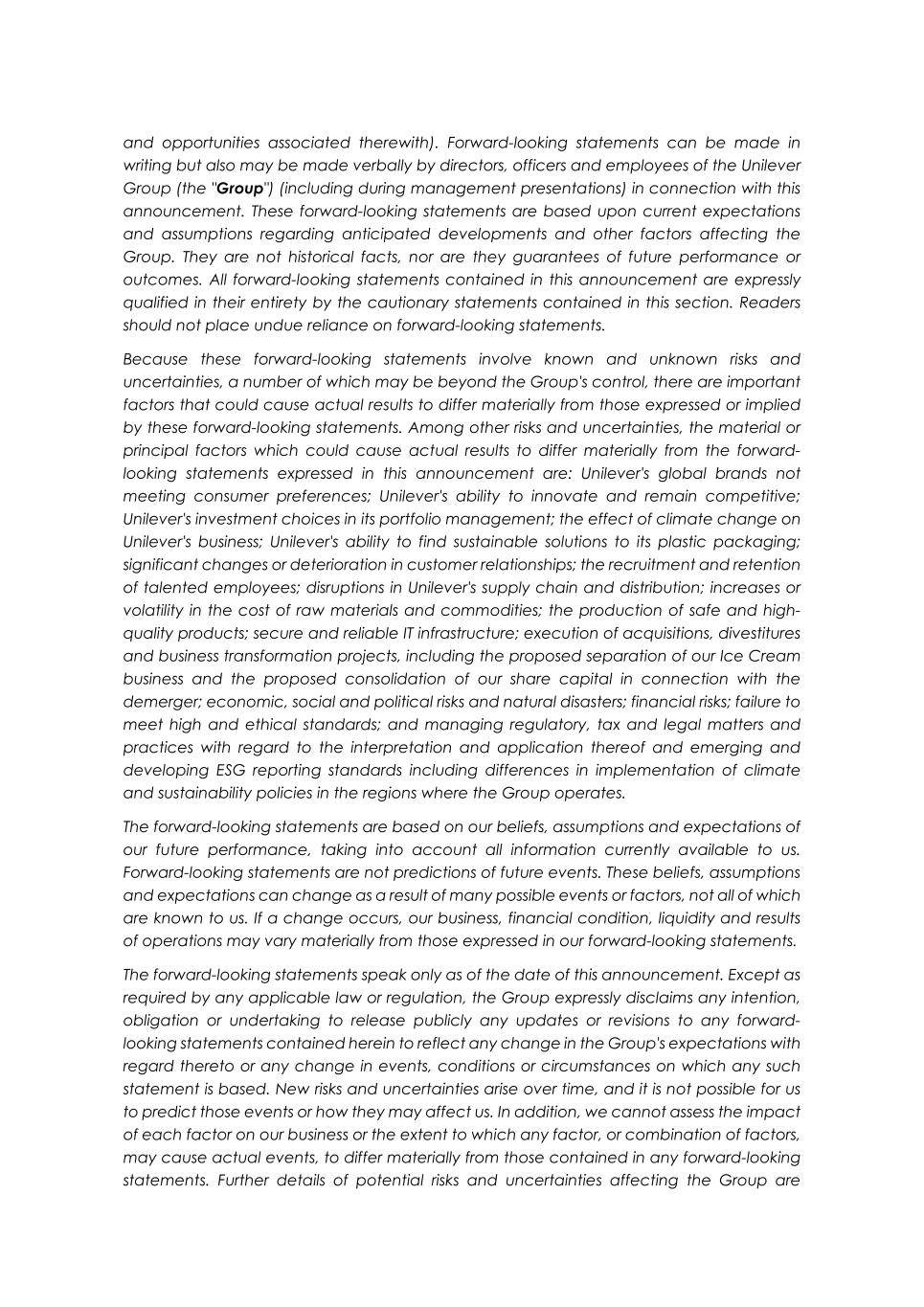 and opportunities associated therewith). Forward-looking statements can be made in writing but also may be made verbally by directors, officers and employees of the Unilever Group (the "Group") (including during management presentations) in connection with this announcement. These forward-looking statements are based upon current expectations and assumptions regarding anticipated developments and other factors affecting the Group. They are not historical facts, nor are they guarantees of future performance or outcomes. All forward-looking statements contained in this announcement are expressly qualified in their entirety by the cautionary statements contained in this section. Readers should not place undue reliance on forward-looking statements. Because these forward-looking statements involve known and unknown risks and uncertainties, a number of which may be beyond the Group's control, there are important factors that could cause actual results to differ materially from those expressed or implied by these forward-looking statements. Among other risks and uncertainties, the material or principal factors which could cause actual results to differ materially from the forward- looking statements expressed in this announcement are: Unilever's global brands not meeting consumer preferences; Unilever's ability to innovate and remain competitive; Unilever's investment choices in its portfolio management; the effect of climate change on Unilever's business; Unilever's ability to find sustainable solutions to its plastic packaging; significant changes or deterioration in customer relationships; the recruitment and retention of talented employees; disruptions in Unilever's supply chain and distribution; increases or volatility in the cost of raw materials and commodities; the production of safe and high- quality products; secure and reliable IT infrastructure; execution of acquisitions, divestitures and business transformation projects, including the proposed separation of our Ice Cream business and the proposed consolidation of our share capital in connection with the demerger; economic, social and political risks and natural disasters; financial risks; failure to meet high and ethical standards; and managing regulatory, tax and legal matters and practices with regard to the interpretation and application thereof and emerging and developing ESG reporting standards including differences in implementation of climate and sustainability policies in the regions where the Group operates. The forward-looking statements are based on our beliefs, assumptions and expectations of our future performance, taking into account all information currently available to us. Forward-looking statements are not predictions of future events. These beliefs, assumptions and expectations can change as a result of many possible events or factors, not all of which are known to us. If a change occurs, our business, financial condition, liquidity and results of operations may vary materially from those expressed in our forward-looking statements. The forward-looking statements speak only as of the date of this announcement. Except as required by any applicable law or regulation, the Group expressly disclaims any intention, obligation or undertaking to release publicly any updates or revisions to any forward- looking statements contained herein to reflect any change in the Group's expectations with regard thereto or any change in events, conditions or circumstances on which any such statement is based. New risks and uncertainties arise over time, and it is not possible for us to predict those events or how they may affect us. In addition, we cannot assess the impact of each factor on our business or the extent to which any factor, or combination of factors, may cause actual events, to differ materially from those contained in any forward-looking statements. Further details of potential risks and uncertainties affecting the Group are
