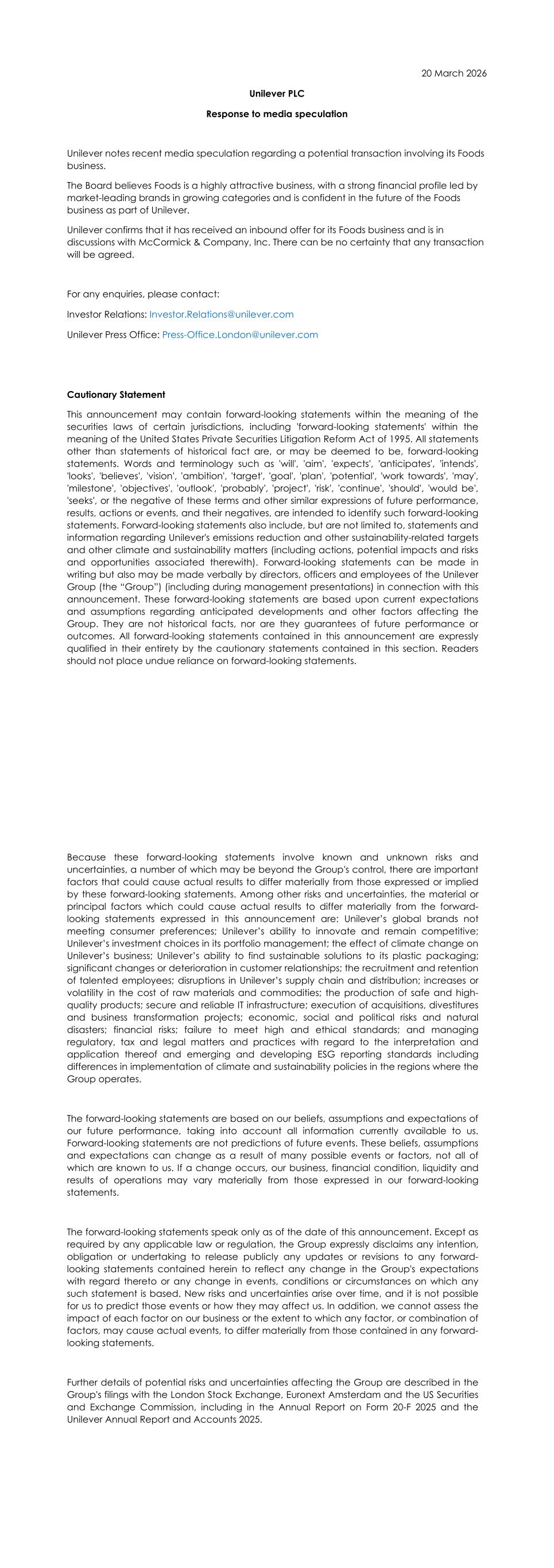 20 March 2026 Unilever PLC Response to media speculation Unilever notes recent media speculation regarding a potential transaction involving its Foods business. The Board believes Foods is a highly attractive business, with a strong financial profile led by market-leading brands in growing categories and is confident in the future of the Foods business as part of Unilever. Unilever confirms that it has received an inbound offer for its Foods business and is in discussions with McCormick & Company, Inc. There can be no certainty that any transaction will be agreed. For any enquiries, please contact: Investor Relations: Investor.Relations@unilever.com Unilever Press Office: Press-Office.London@unilever.com Cautionary Statement This announcement may contain forward-looking statements within the meaning of the securities laws of certain jurisdictions, including 'forward-looking statements' within the meaning of the United States Private Securities Litigation Reform Act of 1995. All statements other than statements of historical fact are, or may be deemed to be, forward-looking statements. Words and terminology such as 'will', 'aim', 'expects', 'anticipates', 'intends', 'looks', 'believes', 'vision', 'ambition', 'target', 'goal', 'plan', 'potential', 'work towards', 'may', 'milestone', 'objectives', 'outlook', 'probably', 'project', 'risk', 'continue', 'should', 'would be', 'seeks', or the negative of these terms and other similar expressions of future performance, results, actions or events, and their negatives, are intended to identify such forward-looking statements. Forward-looking statements also include, but are not limited to, statements and information regarding Unilever's emissions reduction and other sustainability-related targets and other climate and sustainability matters (including actions, potential impacts and risks and opportunities associated therewith). Forward-looking statements can be made in writing but also may be made verbally by directors, officers and employees of the Unilever Group (the “Group”) (including during management presentations) in connection with this announcement. These forward-looking statements are based upon current expectations and assumptions regarding anticipated developments and other factors affecting the Group. They are not historical facts, nor are they guarantees of future performance or outcomes. All forward-looking statements contained in this announcement are expressly qualified in their entirety by the cautionary statements contained in this section. Readers should not place undue reliance on forward-looking statements. Because these forward-looking statements involve known and unknown risks and uncertainties, a number of which may be beyond the Group's control, there are important factors that could cause actual results to differ materially from those expressed or implied by these forward-looking statements. Among other risks and uncertainties, the material or principal factors which could cause actual results to differ materially from the forward- looking statements expressed in this announcement are: Unilever’s global brands not meeting consumer preferences; Unilever’s ability to innovate and remain competitive; Unilever’s investment choices in its portfolio management; the effect of climate change on Unilever’s business; Unilever’s ability to find sustainable solutions to its plastic packaging; significant changes or deterioration in customer relationships; the recruitment and retention of talented employees; disruptions in Unilever’s supply chain and distribution; increases or volatility in the cost of raw materials and commodities; the production of safe and high- quality products; secure and reliable IT infrastructure; execution of acquisitions, divestitures and business transformation projects; economic, social and political risks and natural disasters; financial risks; failure to meet high and ethical standards; and managing regulatory, tax and legal matters and practices with regard to the interpretation and application thereof and emerging and developing ESG reporting standards including differences in implementation of climate and sustainability policies in the regions where the Group operates. The forward-looking statements are based on our beliefs, assumptions and expectations of our future performance, taking into account all information currently available to us. Forward-looking statements are not predictions of future events. These beliefs, assumptions and expectations can change as a result of many possible events or factors, not all of which are known to us. If a change occurs, our business, financial condition, liquidity and results of operations may vary materially from those expressed in our forward-looking statements. The forward-looking statements speak only as of the date of this announcement. Except as required by any applicable law or regulation, the Group expressly disclaims any intention, obligation or undertaking to release publicly any updates or revisions to any forward- looking statements contained herein to reflect any change in the Group's expectations with regard thereto or any change in events, conditions or circumstances on which any such statement is based. New risks and uncertainties arise over time, and it is not possible for us to predict those events or how they may affect us. In addition, we cannot assess the impact of each factor on our business or the extent to which any factor, or combination of factors, may cause actual events, to differ materially from those contained in any forward- looking statements. Further details of potential risks and uncertainties affecting the Group are described in the Group's filings with the London Stock Exchange, Euronext Amsterdam and the US Securities and Exchange Commission, including in the Annual Report on Form 20-F 2025 and the Unilever Annual Report and Accounts 2025.