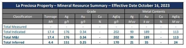 Mineral resources for La Preciosa are estimated at a cut-off grade of 120 g/t AgEq.