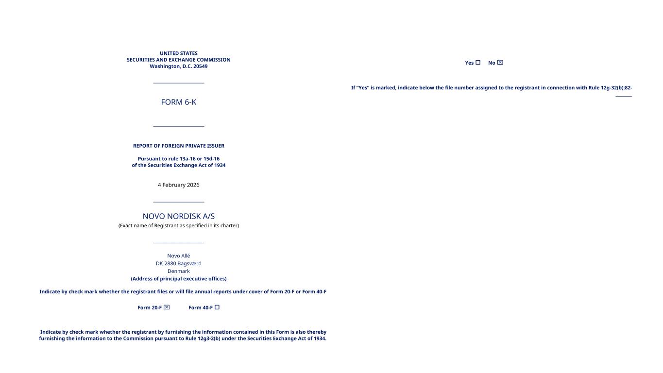 UNITED STATES SECURITIES AND EXCHANGE COMMISSION Washington, D.C. 20549 _________________________ FORM 6-K _________________________ REPORT OF FOREIGN PRIVATE ISSUER Pursuant to rule 13a-16 or 15d-16 of the Securities Exchange Act of 1934 4 February 2026 _________________________ NOVO NORDISK A/S (Exact name of Registrant as specified in its charter) _________________________ Novo Allé DK-2880 Bagsværd Denmark (Address of principal executive offices) Indicate by check mark whether the registrant files or will file annual reports under cover of Form 20-F or Form 40-F Form 20-F x Form 40-F o Indicate by check mark whether the registrant by furnishing the information contained in this Form is also thereby furnishing the information to the Commission pursuant to Rule 12g3-2(b) under the Securities Exchange Act of 1934. Yes o No x If “Yes” is marked, indicate below the file number assigned to the registrant in connection with Rule 12g-32(b):82- ________